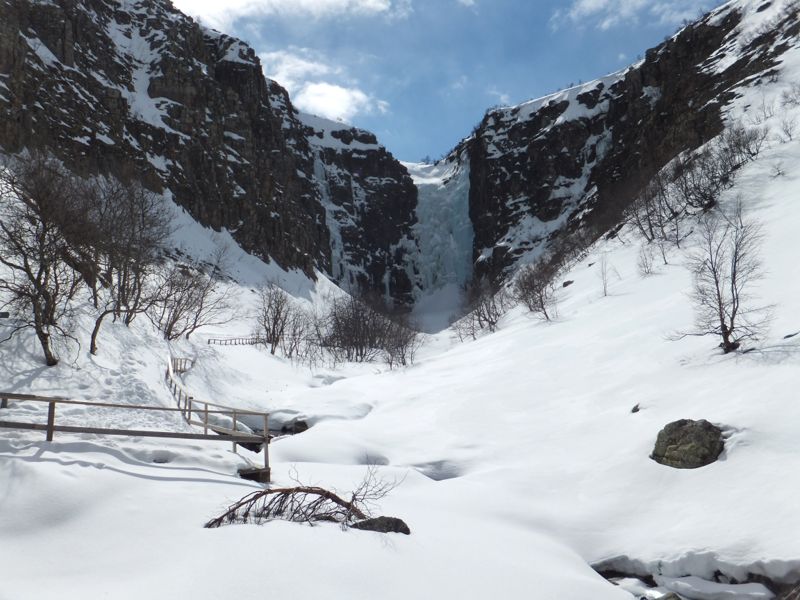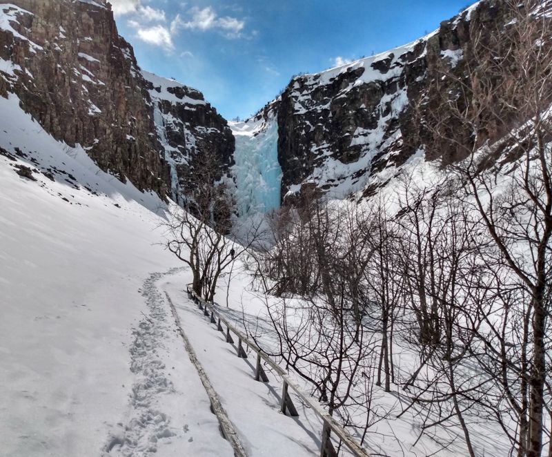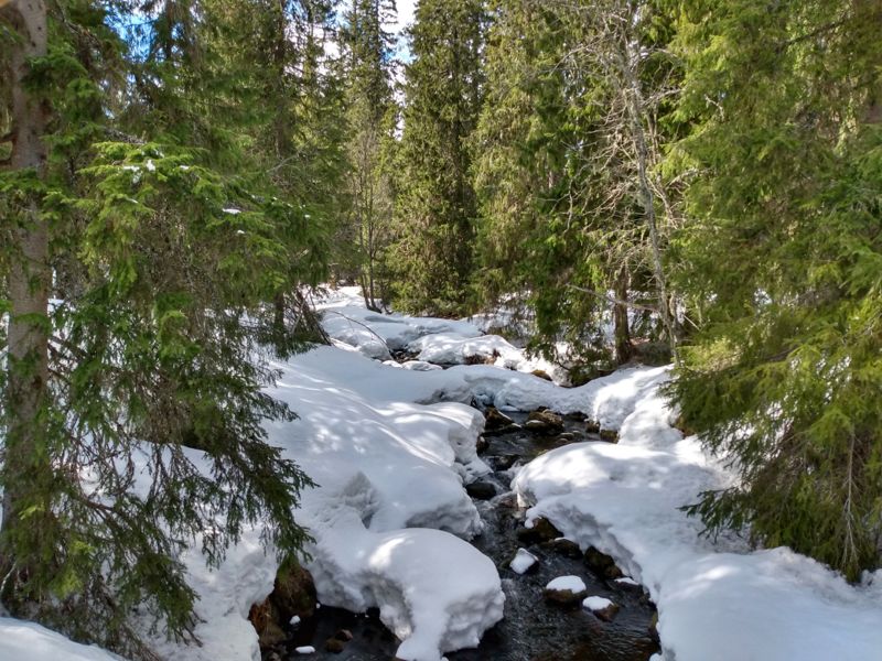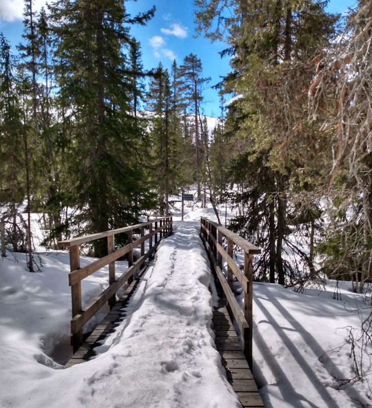 Die Sonne schien mal wieder herrlich, als wir uns auf die fast 2 stündige Fahrt zum Fulufjället Nationalpark aufmachten. Immer höher ging es in die Berge und am Ende erreichten wir die schneebedeckte Landschaft des Parks an der Baumgrenze, die hier schon bei 800 m liegt. Es war eine atemberaubende Wanderung durch den Schnee. Wir waren kurz vor unserem Ziel, dem Njupeskärs Wasserfall, übrigens mit einer Fallhöhe von 90 m der höchste Wasserfall in Schweden, als uns am oberen Ende einer Treppe ein Schild den Weg versperrte. Wegen Glätte sei der Weg zum Wasserfall geschlossen. Die Treppe war jedoch frei von Eis und so kletterten wir kurzerhand unter dem Schild hindurch und stiegen die Treppe hinab. Von dort aus ging es dann doch etwas halsbrecherisch oberhalb des eigentlichen Weges, der unter mindestens einem Meter Schnee nicht mehr zu erkennen war, an einem zum Bach hin abfallendenen Hang die letzten 200 m bis zum Wasserfall. Dort packten wir unsere Drohne aus und machten einen kurzen Flug. Diesmal hatten wir die Verbotsschilder gesehen. Eines bereits am Parkplatz, zwei weitere unterwegs. Das vierte sahen wir, nachdem wir den Flug beendet hatten knapp 50 cm vom Landeplatz der Drohne entfernt. Aber da wir wieder einmal völlig alleine waren, störte sich niemand an diesem kurzen Flug. Zurück nahmen wir den Rest des Rundwanderweges, der jedoch nicht so ausgetreten war, wie der Hinweg. Dieser Weg war ein Sommerweg und wurde nur selten genutzt. Wir merkten auch schnell warum, als wir die 2 km entlang der wenigen Fußspuren gingen und immer mal wieder tief im Schnee einbrachen. Die Brücken, die wir überquerten, waren kaum mehr sichtbar, so hoch türmte sich der Schnee auf ihnen auf. Etwas beschwerlich aber wunderschön war dieser Teil der Wanderung. Danach setzten wir uns wieder in unser Wohnmobil und fuhren an die norwegische Grenze. Überrascht stellten wir fest, dass wir hier problemlos über die Grenze hätten fahren können. Nur ein großes Schild, dass die Grenze geschlossen ist, stand auf der Straße. Aber der Weg war frei. Und so war es auch nicht verwunderlich, dass ein schwedisches Auto aus Norwegen kommend an uns vorbei die geschlossene Grenze passierte. Wir wollten uns jedoch nicht illegal in Norwegen aufhalten und fuhren daher die Straße zurück und fanden ein schönes Plätzchen auf einem noch geschlossenen Campingparkplatz etwas unterhalb der Straße an einem See.
