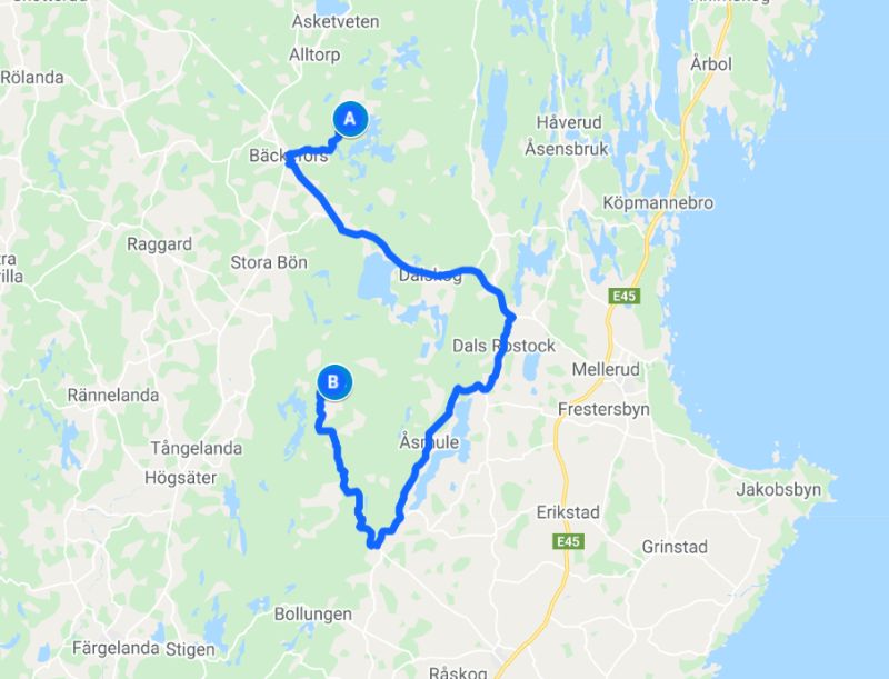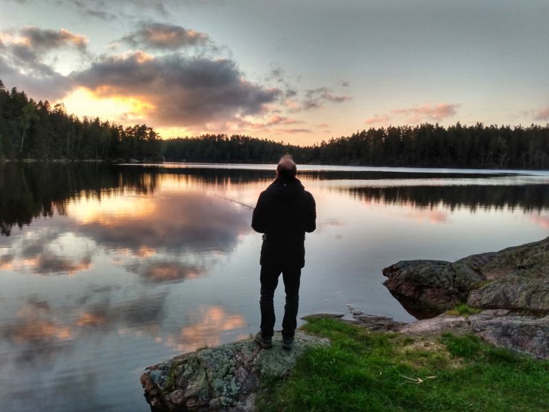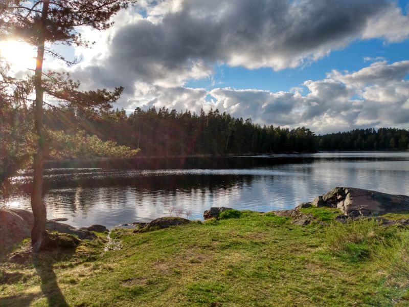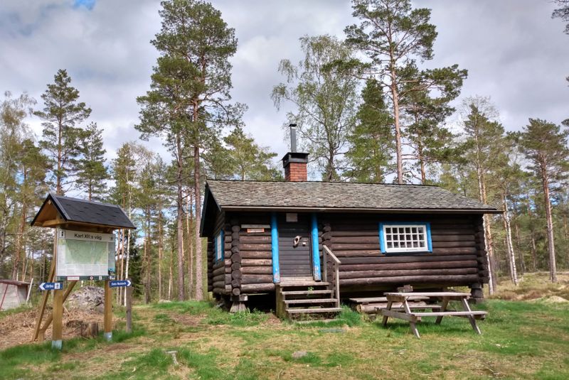 Das Wetter war bestens, als wir uns nach Kröppefiell aufmachten: Lockere Bewölkung bei 16 Grad. Ideale Bedingungen für eine längere Wanderung. Die letzten 12 km fuhren wir auf einer unbefestigten Straße durch die hügelige von Kiefern bewachsene Landschaft. Auffällig ist vor allem der Boden, der vollständig grün ist. Blaubeeren und kleine Büsche wachsen hier und überall gibt es Moose und Flechten. Hier scheint die Natur noch in Ordnung zu sein. Wir hielten am Ende des Weges am See Stora Hallesjön und begannen unsere Wanderung entlang des Ostufers des Sees zu einer 1962 gebauten Hütte, die von der Nationalparksverwaltung betrieben wird. Nach knapp 2 km waren wir dort und sahen uns die gemütliche Blockhütte etwas näher an. Es gab sogar eine kleine Küche und die Stube sah richtig einladend aus. Mit Kamin und Tisch gab es alles, um sich hier für ein paar Tage einzurichten. Wir liefen weiter, einen kleinen Teil des Karl XII:s väg entlang, bevor wir auf der Westseite des Hallesjön wieder zu unserem Parkplatz zurückgingen. Insgesamt etwa 5 km durch diese wunderschöne Natur. Das Wohnmobil, das bereits bei unserer Ankunft hier war, machte sich gerade abfahrbereit. Kurzerhand entschieden wir uns, heute Nacht hier zu bleiben, warteten, bis sie weg waren und stellten uns dann direkt an den See, den wir dann wieder ganz für uns alleine hatten.
