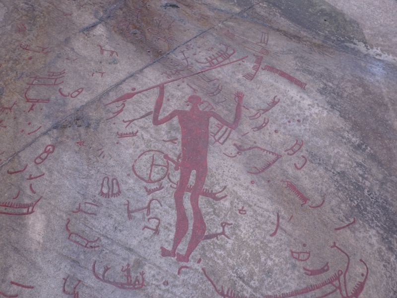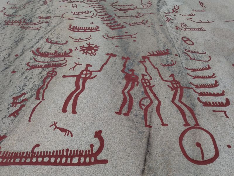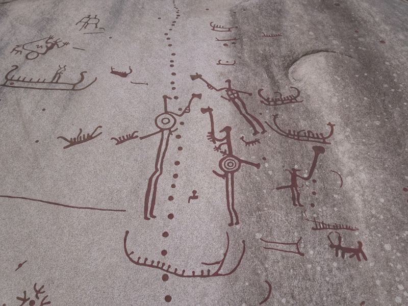 Gemütlich fuhren wir, wie immer auf kleinen Straßen, die Autobahn vermeidend, parallel zur E6 in Richtung Norwegen. Das heutige Ziel war Tanum, wo es viele Felsritzungen geben sollte. Beim Vitlycke Museum parkten wir unser Wohnmobil und gingen zu dem Arreal auf der gegenüberliegenden Seite der Straße. Entlang eines Weges sind einige Felsen gereinigt und die darauf einggeritzen Darstellungen mit rotbrauner Farbe sichtbar gemacht. Anhand der Darstellungen wird vermutet, dass sie in der Bronzezeit entstanden sind. Natürlich fehlte damals die Farbe und es dürfte den Künstlern selbst beinahe genauso schwer gefallen sein, ihre Kunstwerke zu bewundern wie uns, als wir versuchten, auf dem Stein weitere Einritzungen zu finden. Im Schein einer Taschenlampe sollte es besser gehen, aber dazu war es noch zu hell. Wir wanderten den Berg hinauf, wo es noch zwei große Wikingergräber gab. Riesige Steinhaufen, die früher einen Innernraum hatten, die jedoch schon lange eingestürzt sind. Dort ließen wir auch mal wieder unsere Drohne fliegen, wie auch auf dem letzten Stein, der der größte bekannte Felsen mit den meisten Felsritzungen weltweit sein soll. Knapp 1 km weiter schauten wir uns die Felszeichnungen von Aspeberget an. Wieder gab es einen kleinen Rundgang an dem es analog präparierte Ritzungen gab. Auf der Suche nach einem Stellplatz landeten wir zufällig bei einem dritten Platz mit Felsritzungen, Litsleby Hällristingar. Ursprünglich wollten wir dort übernachten, aber nachdem sich ein weiteres Wohnmobil dazugesellte und zahlreiche Fahrzeuge die Straße entlangfuhren, die eigentlich für den Durchgangsverkehr verboten war, machten wir kurz vor 22 Uhr noch schnell Fotos und einen weiteren Drohnenflug, ehe wir zu einem abgeschiedenen Platz im Wald nahe der Norwegischen Grenze fuhren. Hier war es wieder schön ruhig.