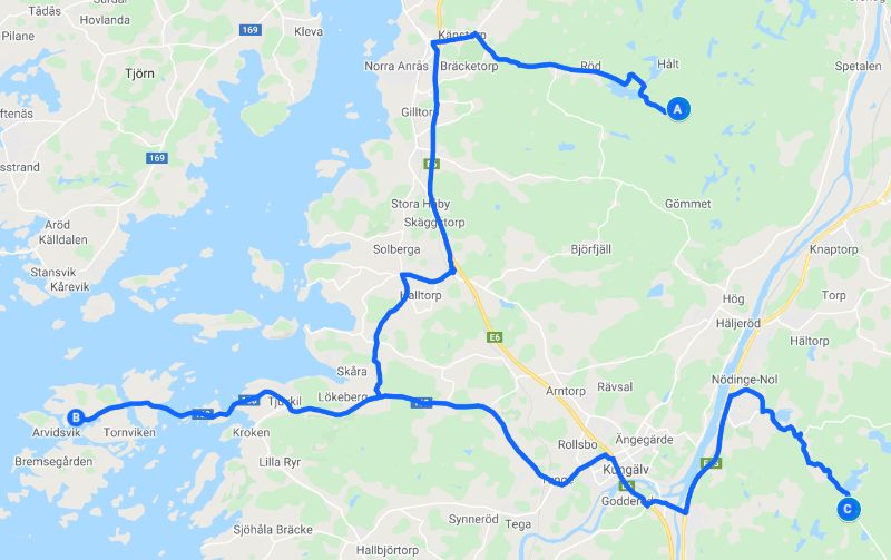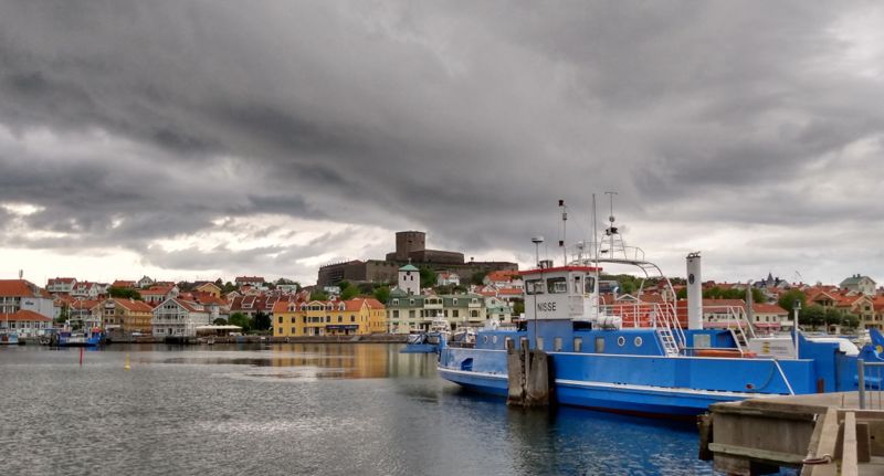 Ein weiterer Ort, an dem Schweden im Sommer gerne Urlaub machen ist Marstrand, bzw. die vorgelagerte Insel, auf dem eine imposante Festung steht. Trotz des eher bescheidenen Wetters, es regnete zwar nicht, die Wolken standen aber tief und dunkel, machten wir uns am frühen Nachmittag auf den Weg. Am Hafen wartete eine Hochzeitsgesellschaft auf die Überfahrt, ansonsten war der Ort genauso verschlafen wie die Ferienorte der vergangenen Tage. Die An- und Abfahrt hat sich aber dennoch gelohnt, führte die Straße über mehrere kleine Inseln aus Granit inmitten der Schärenlandschaft. Auf der Rückfahrt begann es dann doch zu regnen und hörte bis zum Schlafengehen auch nicht mehr auf. Unser Plätzchen lag diesmal etwas oberhalb eines Sees auf einem kleinen Parkplatz im Wald, in dem Kühe gehalten wurden, die uns freudig begrüßten, als wir ankamen.