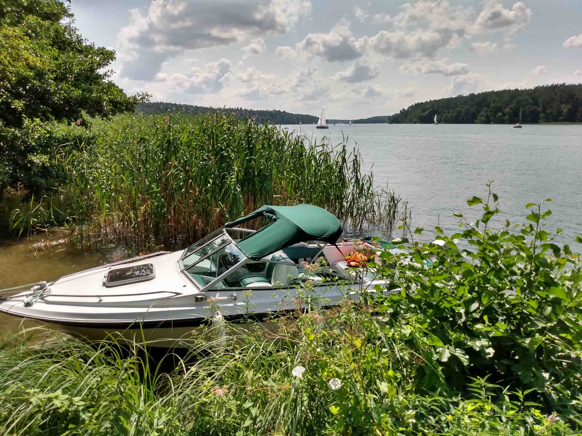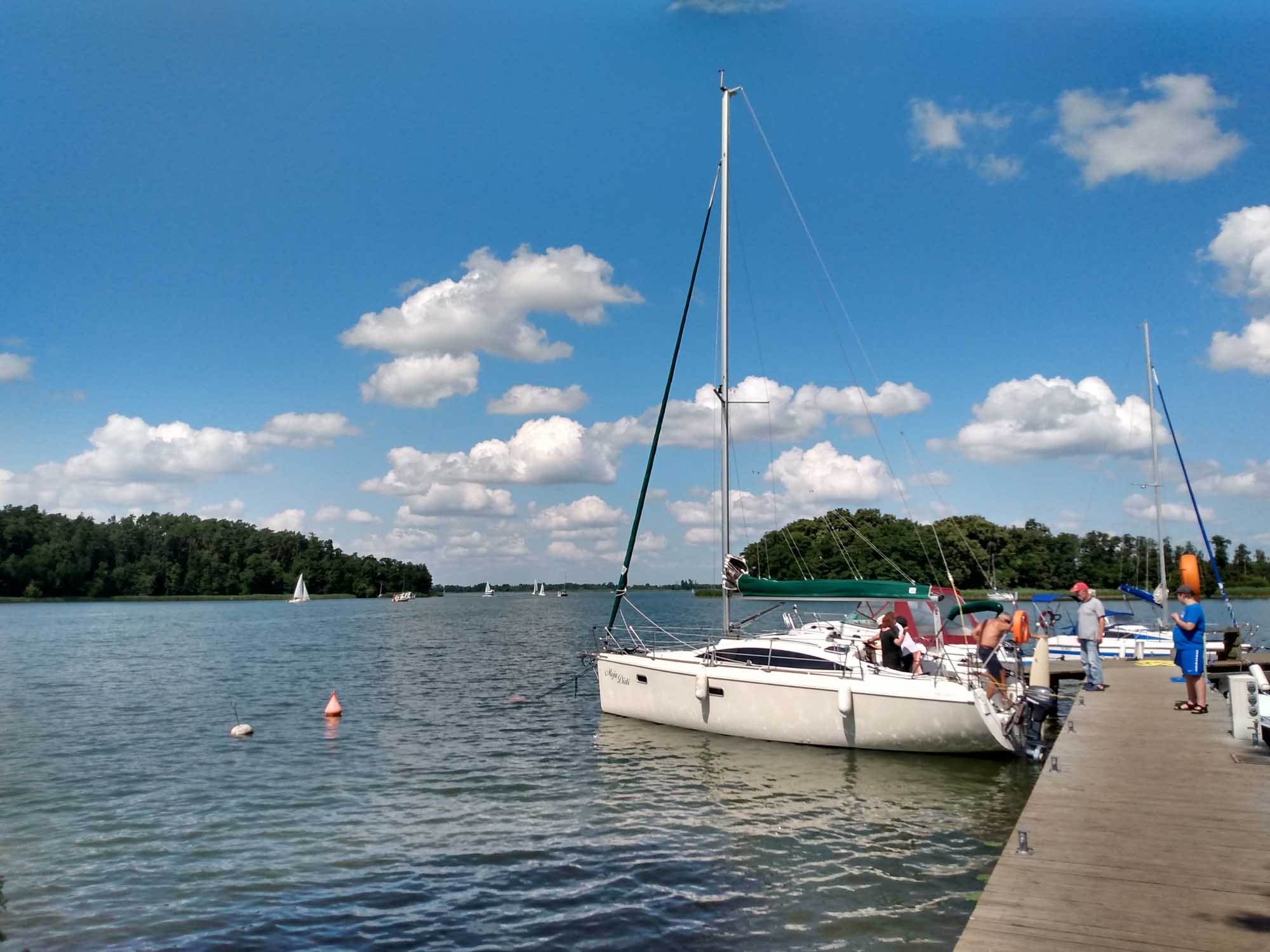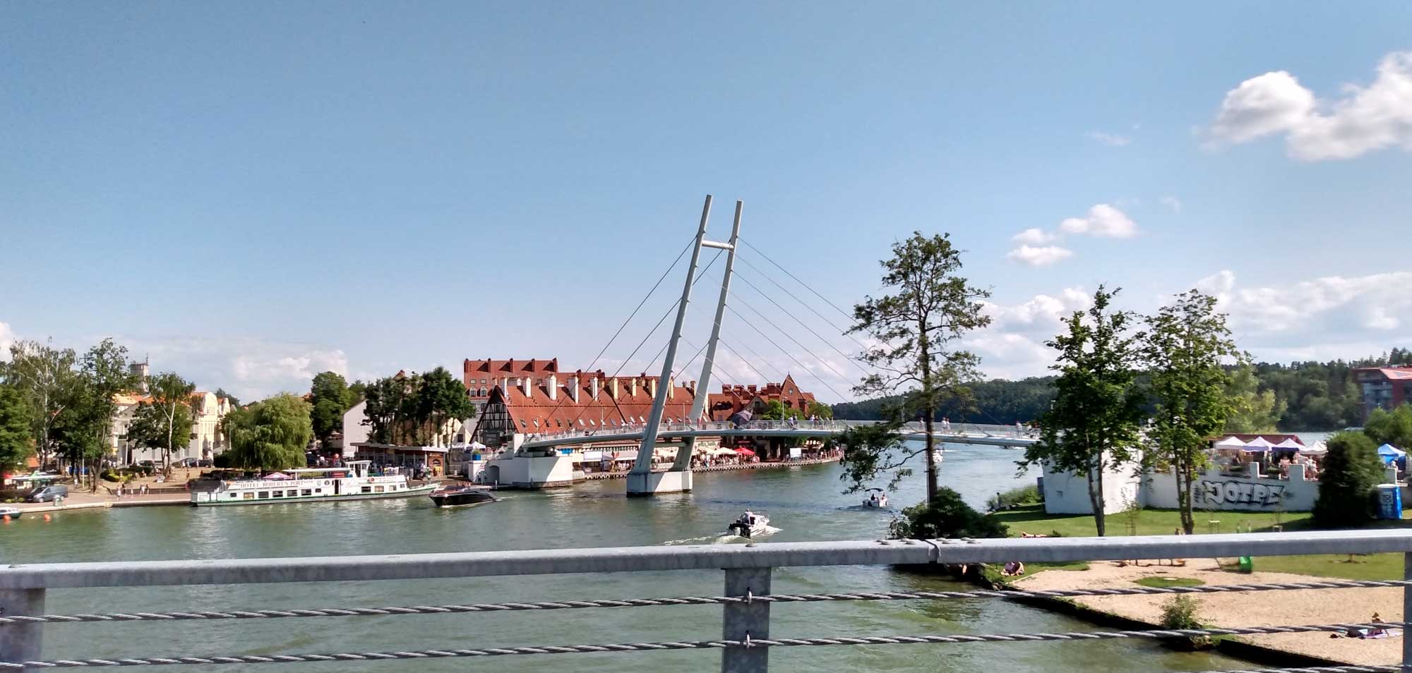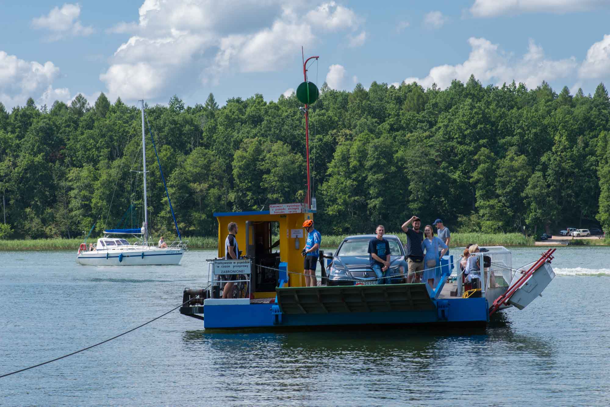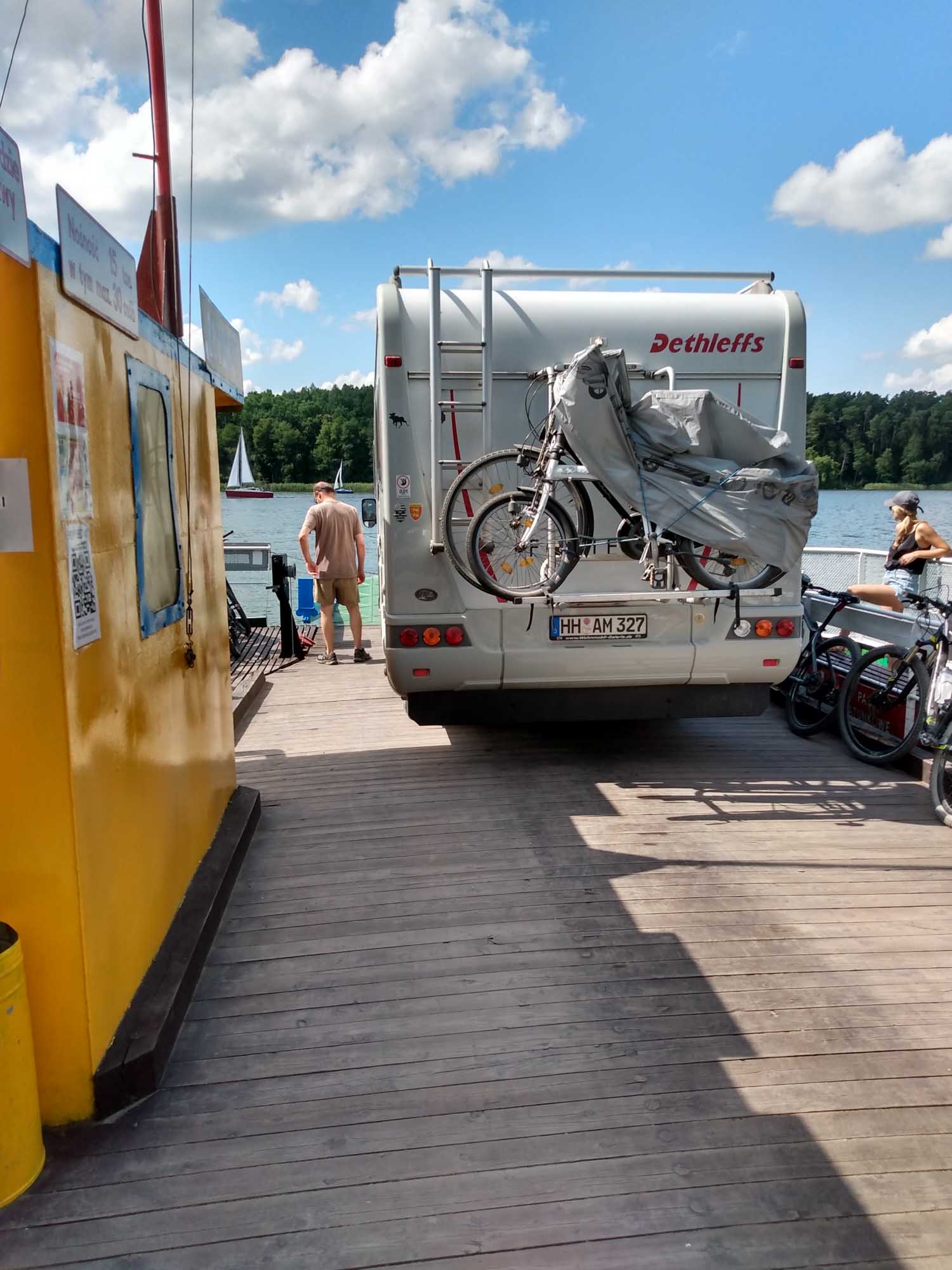 Morgens machten wir noch einen schönen Spaziergang zur Spitze der Halbinsel im See Sniardwy, wo wir die Nacht verbracht hatten. Die knapp 2 km waren sehr kurzweilig und als wir an der Spitze ankamen und durch die dort aufgebaute Zelt-, Wohnwagen- und Wohnmobilstadt liefen, waren wir froh über unseren einsamen Platz auf der Wiese. Auf einem Hügel hatte es sich eine Motorradgang breit gemacht und beschallte die Umgebung mit Heavy-Metall-Klängen. Ganz gemütlich fuhren wir anschließend an der Westküste des Sees entlang in den Nationalpark Warnowo. Dort sollte es wilde Pferde geben, die wir allerdings nicht zu Gesicht bekamen. Stattdessen fanden wir bei einem Halt Blaubeeren, die wir direkt vom Busch aßen. In Wierzba nahmen wir eine kleine Fähre. Die einzige Fähre, die es in den Masuren überhaupt gibt. Wir hatten Glück mit unserem Wohnmobil: 3,5 t war das Maximalgewicht, das ein Auto haben durfte. Gut, dass wir das einzige Fahrzeug in diese Richtung waren. Ein weiteres hätte auch nicht gepasst. Für die 360 m bis zum gegenüberliegenden Ufer benötigte die kleine Kabelfähre etwa 10 Minuten. Auf der anderen Seite warteten etliche Fahrzeuge und wir konnten uns ausrechnen, wie lange sie wohl würden warten müssen. Die Weiterfahrt ging über einen schmalen Sandweg etwa 5 km quer durch den Wald. Wunderschön, aber eben auch sehr eng. Immer passend gab es eine Ausbuchtung, wenn entgegenkommender Verkehr kam. Und die anderen Fahrer hielten ausnahmslos sehr rechtzeitig. So kamen wir nach Mikolajki, dem Vendig der Masuren. Warum der Ort diesen Beinamen bekommen hat, blieb uns schleierhaft. An den vielen Brücken, kann es nicht gelegen haben, es gab nur zwei. Eine für Autos und eine für Fußgänger. Vielleicht aber an den vielen Menschen. Entlang des Flusses gab es viele Andenkenstände, zwischen denen sich die Leute enggedrängt entlangschoben. Uns war das etwas zu eng und so beließen wir es bei einer kleinen Stadtrundfahrt. Wir fuhren weiter nach Westen und nutzten einen Wiesenparkplatz am See Jezioro Majcz Wik. für unsere nächste Übernachtung. Vor dem Abendessen liefen wir noch kurz zum See hinunter, der ausgesprochen sauber war und regelrecht zum Baden aufforderte. Wir aber hatten Hunger und brutzelten und noch leckeren überbackenen Brokkoli bevor wir zum gemütlichen Teil des Abends übergingen und spielten.