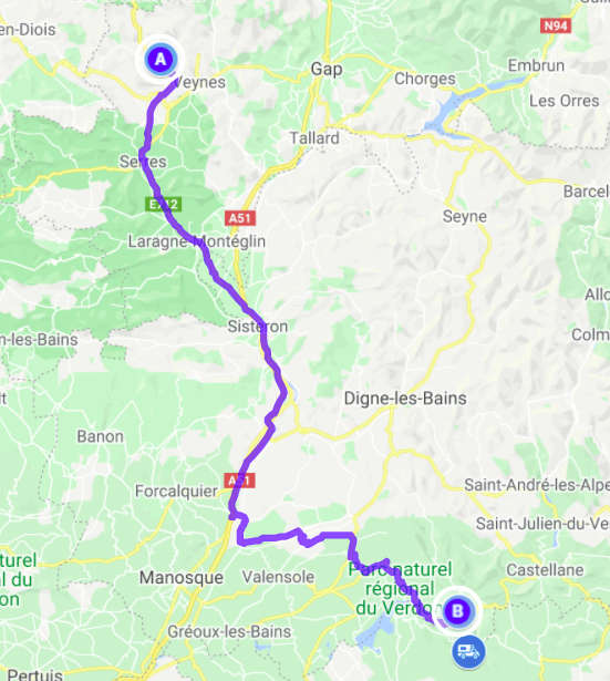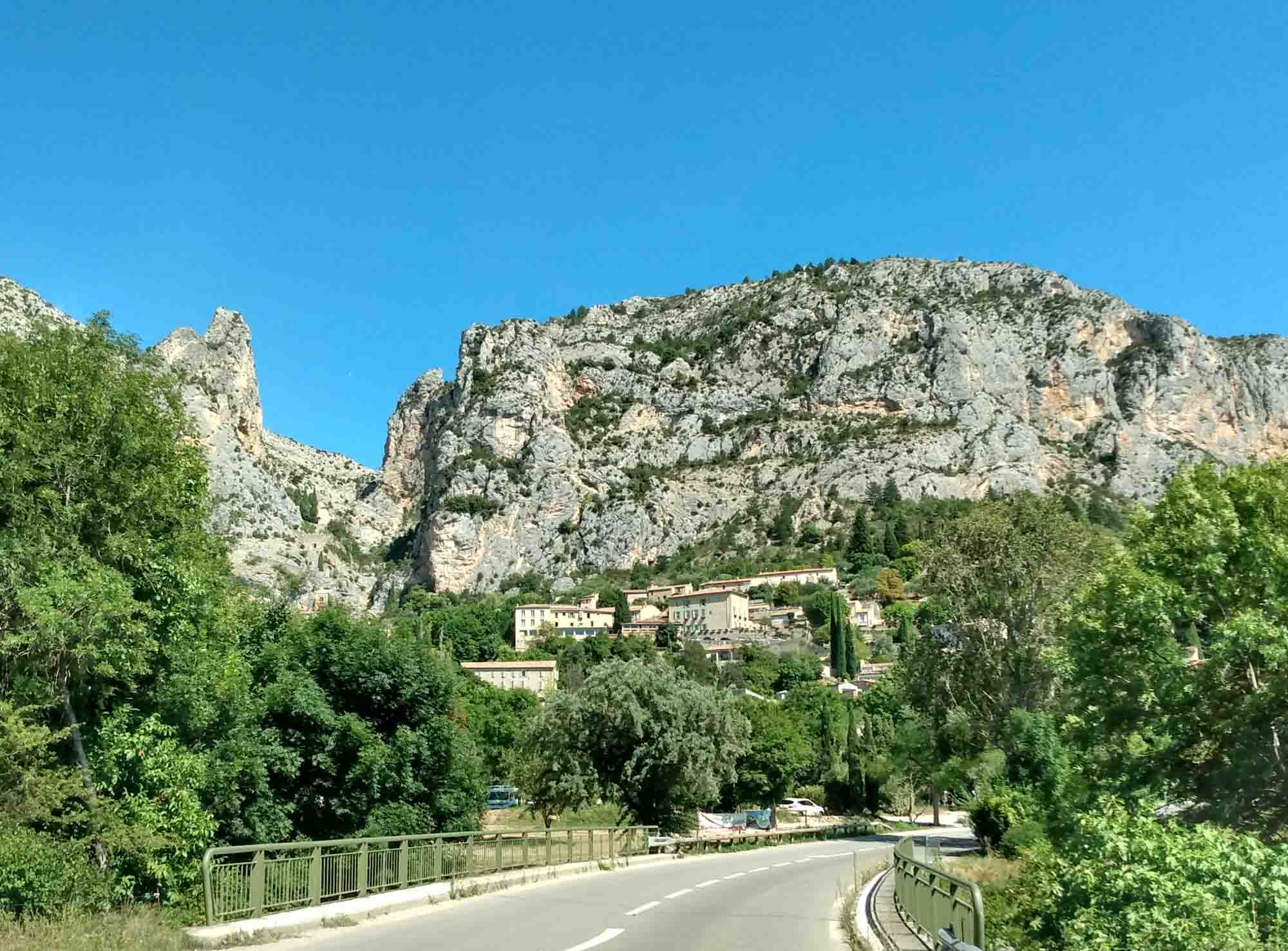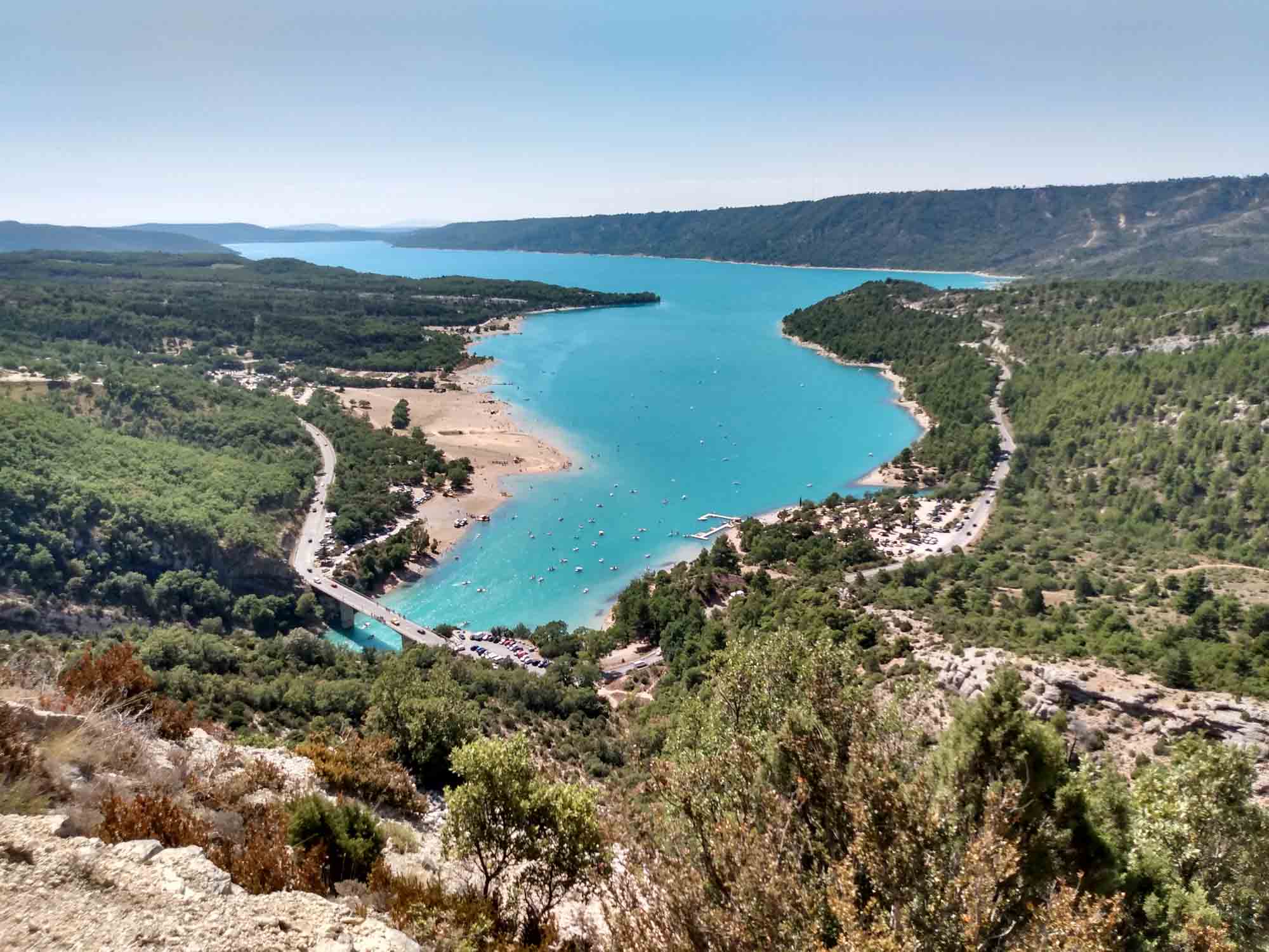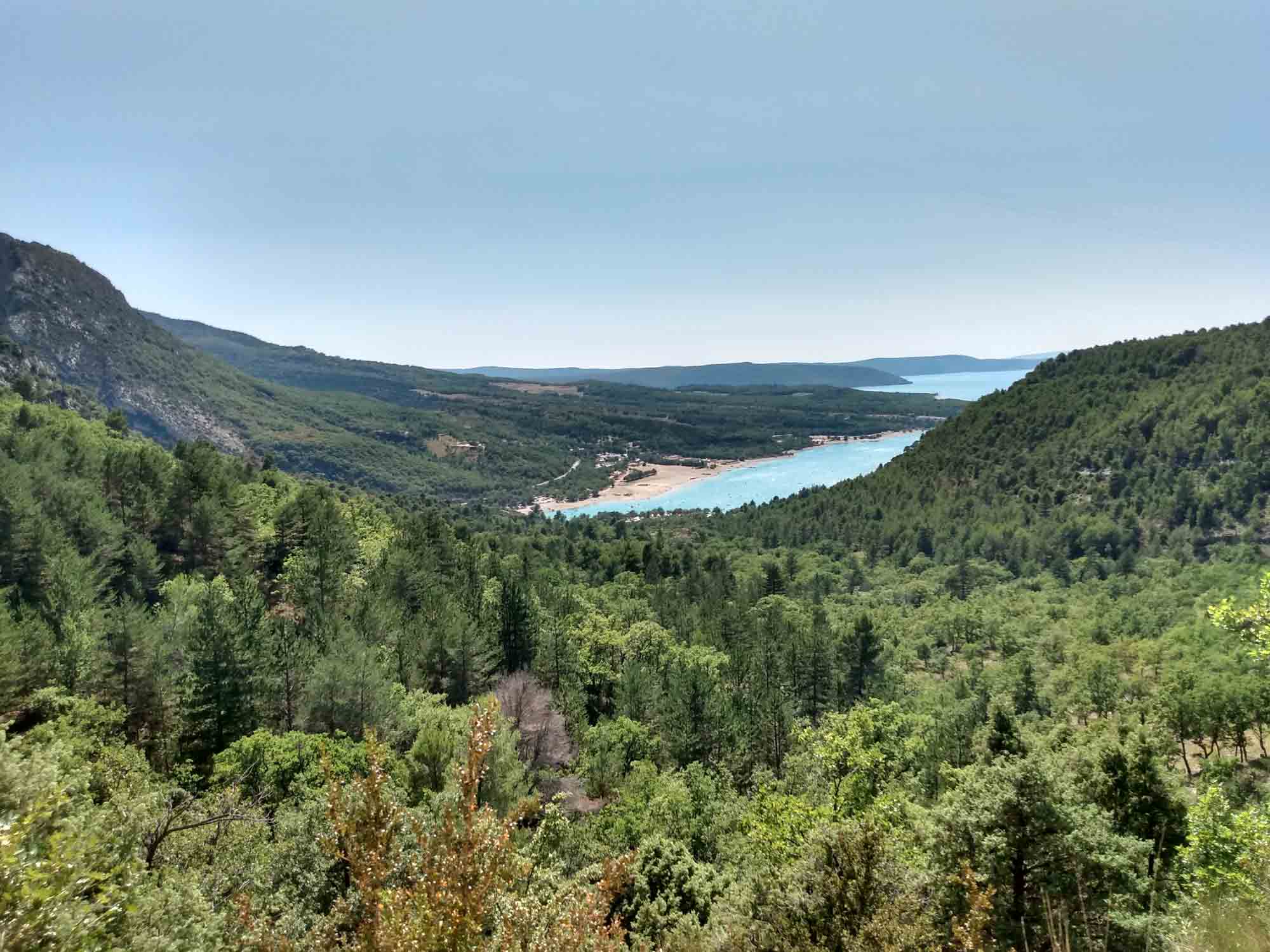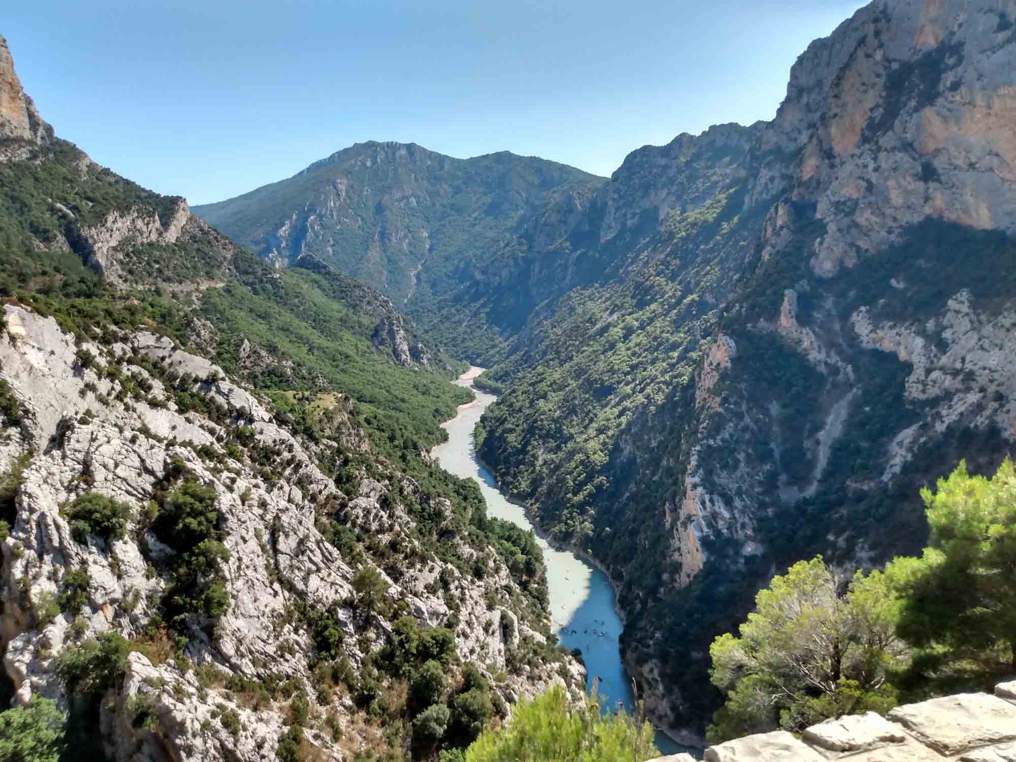 Wir machten uns auf in Richtung Provence. Die Straße führte uns durch eine wunderbar hügelige, am Ende bergige Landschaft. Unterwegs hielten wir noch einmal, um ein Baguette zu kaufen. Und zufällig bekamen wir dort auch die letzten 7 Austern. Wir freuten uns schon auf das Abendessen. Die Landschaft wurde immer schöner und wir hielten oft, um Fotos zu machen. Besonders beeindruckt waren wir von den Georges de Verdon, einer tiefen Schlucht, in die wir von unserer Straße hinunterblicken konnten. Beinahe senkrecht ging es abseits der Straße zu einem kleinen Fluß hinunter, in dem zahlreiche Kanufahrer unterwegs waren. In dieser Landschaft fanden wir dann auch unser lauschiges einsames Plätzchen, wo wir es uns am späten Nachmittag gemütlich machten.