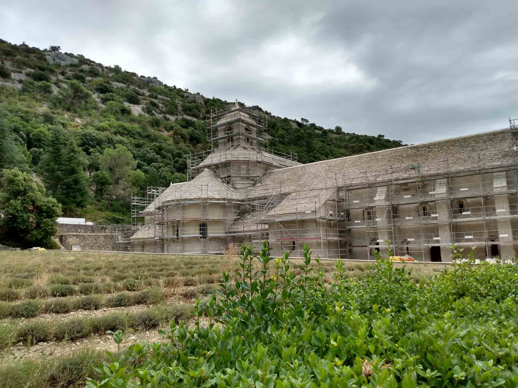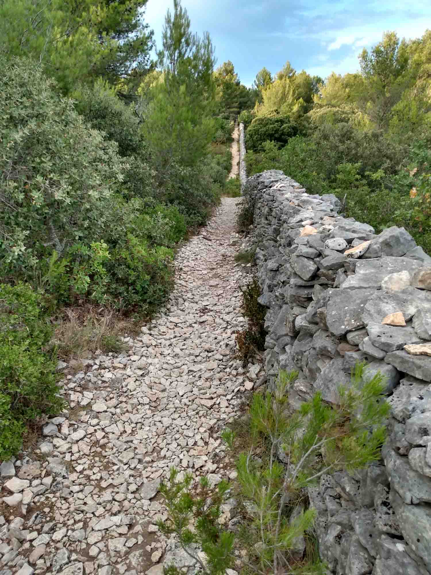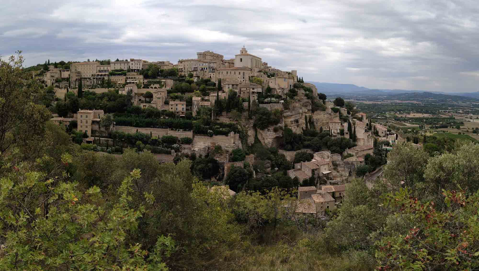 Wir bedauerten ein wenig, diesen schönen Platz zu verlassen, aber das Wetter machte uns den Abschied ein wenig leichter. Es war sehr windig und auch ziemlich bedeckt. Als erstes fuhren wir nach Apt, laut Reiseführer eine sehr sehenswerte Stadt. Den Wagen stellten wir auf einen Parkplatz unweit der Altstadt und gingen zu Fuß durch die enge Hauptgasse mit zahlreichen kleine Geschäften. Diese Straße war recht hübsch aber in der Nebengassen sahen wir recht merkwürdige Leute herumlungern. Die Kathedrale ist in der Stadt fast komplett eingebaut. Innen war sie düster und sah reichlich heruntergekommen aus. Fast würde man meinen, die Maskenpflicht in der Kathedrale wäre wegen des Schimmels an den Wänden und nicht wegen Corona. Insgesamt fühlten wir uns in der Stadt nicht wirklich wohl. Am Eingang des Parkplatzes standen zwei Polizisten und so war zumindest unser Wohnmobil gut bewacht gewesen. Wir fuhren weiter nach Roussilion, um dort die ockerfarbenen Felsen anzusehen. Leider war die Straße durch die Stadt selbst für Wohnmobile gesperrt, so dass wir außen herum fahren mussten. Wir fanden aber trotzdem ein kleines Plätzchen, an dem wir das Ockergestein bewundern konnten. Danach fuhren für zum Abbaye Notre-Dame de Sénanque, einem Kloster nahe des wunderschön auf einem Hügel gelegenen Dorfes Gordes. Diese Ansicht konnten wir uns nicht entgehen lassen. Das Kloster selbst wurde gerade restauriert und die vor dem Kloster liegenden Lavendelfelder blühten natürlich auch nicht mehr. Das Postkartenmotiv mussten wir uns daher auf den Postkarten des Klosterladens ansehen. Schließlich fuhren wir weiter und fanden auf einem kleinen Parkplatz im Wald bei Lagnes einen Platz, auf dem wir gut über Nacht stehen konnten. Zufällig lasen wir auf einem Schild, dass es hier auch noch etwas zu sehen gab. Bei einer kleinen Abendwanderung schauten wir uns daher die 500 m entfernte Pestmauer an, die während der Pest im 17. Jahrhundert errichtet wurde. Wachmänner waren entlang der ca. 20 km langen Mauer aufgestellt, um zu verhindern, das irgendwelche Personen von Süden her, wo die Pest bereits angekommen war, nach Norden kamen. Die weitere Ausbreitung der Pest wurde hier dadurch tatsächlich verhindert.