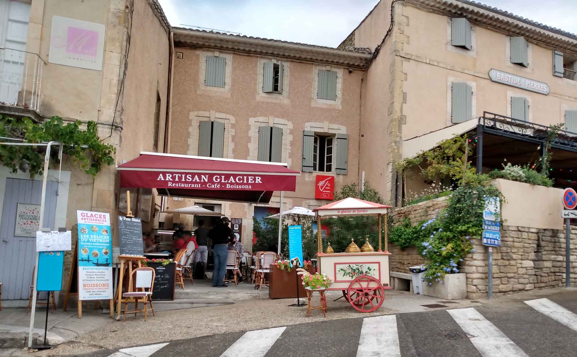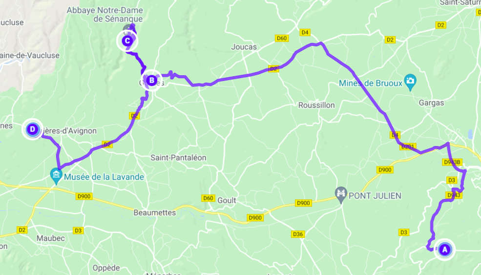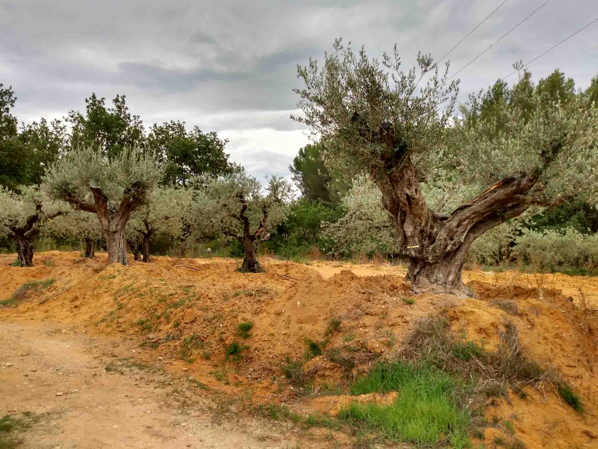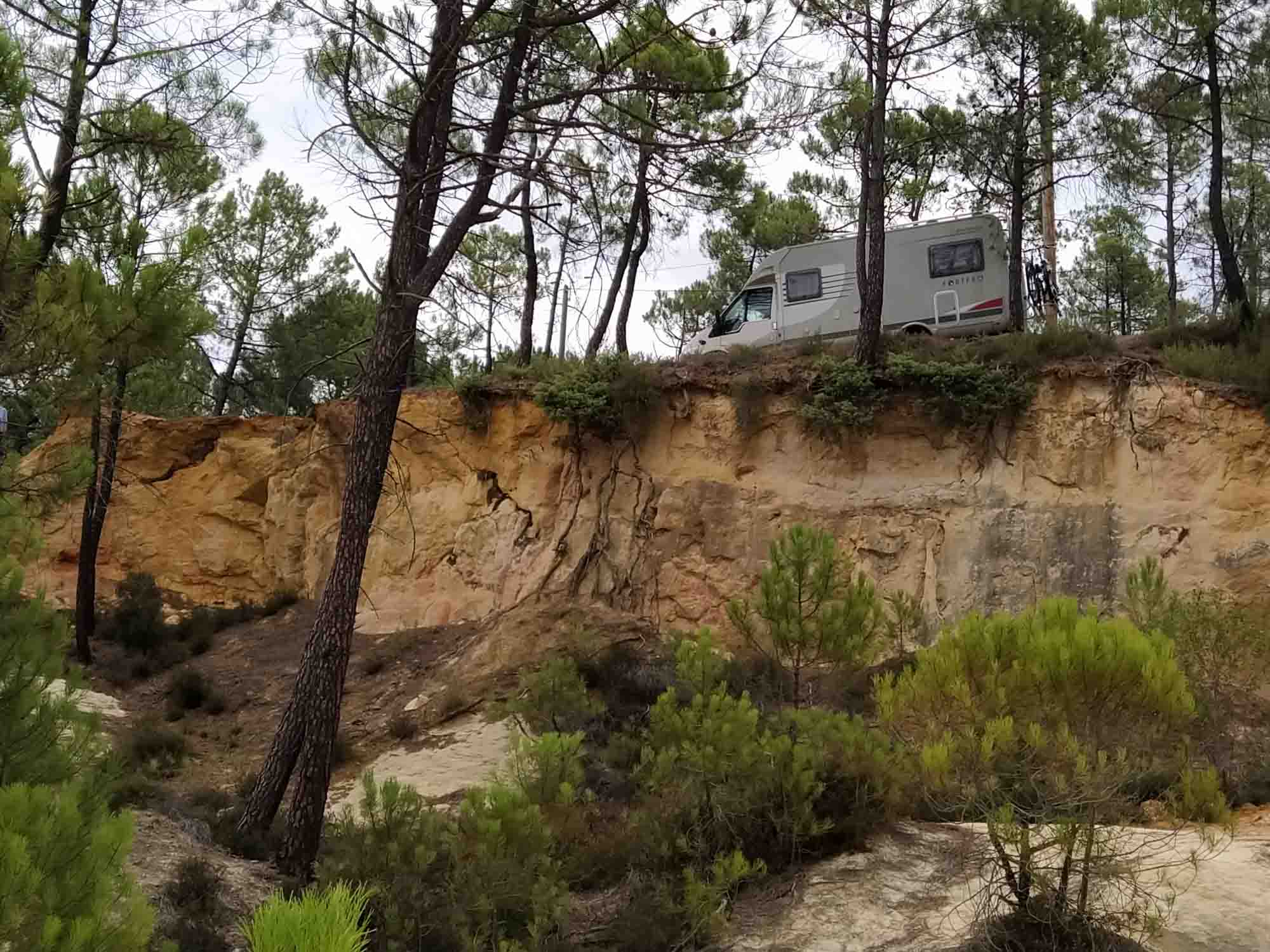 Wir bedauerten ein wenig, diesen schönen Platz zu verlassen, aber das Wetter machte uns den Abschied ein wenig leichter. Es war sehr windig und auch ziemlich bedeckt. Als erstes fuhren wir nach Apt, laut Reiseführer eine sehr sehenswerte Stadt. Den Wagen stellten wir auf einen Parkplatz unweit der Altstadt und gingen zu Fuß durch die enge Hauptgasse mit zahlreichen kleine Geschäften. Diese Straße war recht hübsch aber in der Nebengassen sahen wir recht merkwürdige Leute herumlungern. Die Kathedrale ist in der Stadt fast komplett eingebaut. Innen war sie düster und sah reichlich heruntergekommen aus. Fast würde man meinen, die Maskenpflicht in der Kathedrale wäre wegen des Schimmels an den Wänden und nicht wegen Corona. Insgesamt fühlten wir uns in der Stadt nicht wirklich wohl. Am Eingang des Parkplatzes standen zwei Polizisten und so war zumindest unser Wohnmobil gut bewacht gewesen. Wir fuhren weiter nach Roussilion, um dort die ockerfarbenen Felsen anzusehen. Leider war die Straße durch die Stadt selbst für Wohnmobile gesperrt, so dass wir außen herum fahren mussten. Wir fanden aber trotzdem ein kleines Plätzchen, an dem wir das Ockergestein bewundern konnten. Danach fuhren für zum Abbaye Notre-Dame de Sénanque, einem Kloster nahe des wunderschön auf einem Hügel gelegenen Dorfes Gordes. Diese Ansicht konnten wir uns nicht entgehen lassen. Das Kloster selbst wurde gerade restauriert und die vor dem Kloster liegenden Lavendelfelder blühten natürlich auch nicht mehr. Das Postkartenmotiv mussten wir uns daher auf den Postkarten des Klosterladens ansehen. Schließlich fuhren wir weiter und fanden auf einem kleinen Parkplatz im Wald bei Lagnes einen Platz, auf dem wir gut über Nacht stehen konnten. Zufällig lasen wir auf einem Schild, dass es hier auch noch etwas zu sehen gab. Bei einer kleinen Abendwanderung schauten wir uns daher die 500 m entfernte Pestmauer an, die während der Pest im 17. Jahrhundert errichtet wurde. Wachmänner waren entlang der ca. 20 km langen Mauer aufgestellt, um zu verhindern, das irgendwelche Personen von Süden her, wo die Pest bereits angekommen war, nach Norden kamen. Die weitere Ausbreitung der Pest wurde hier dadurch tatsächlich verhindert.