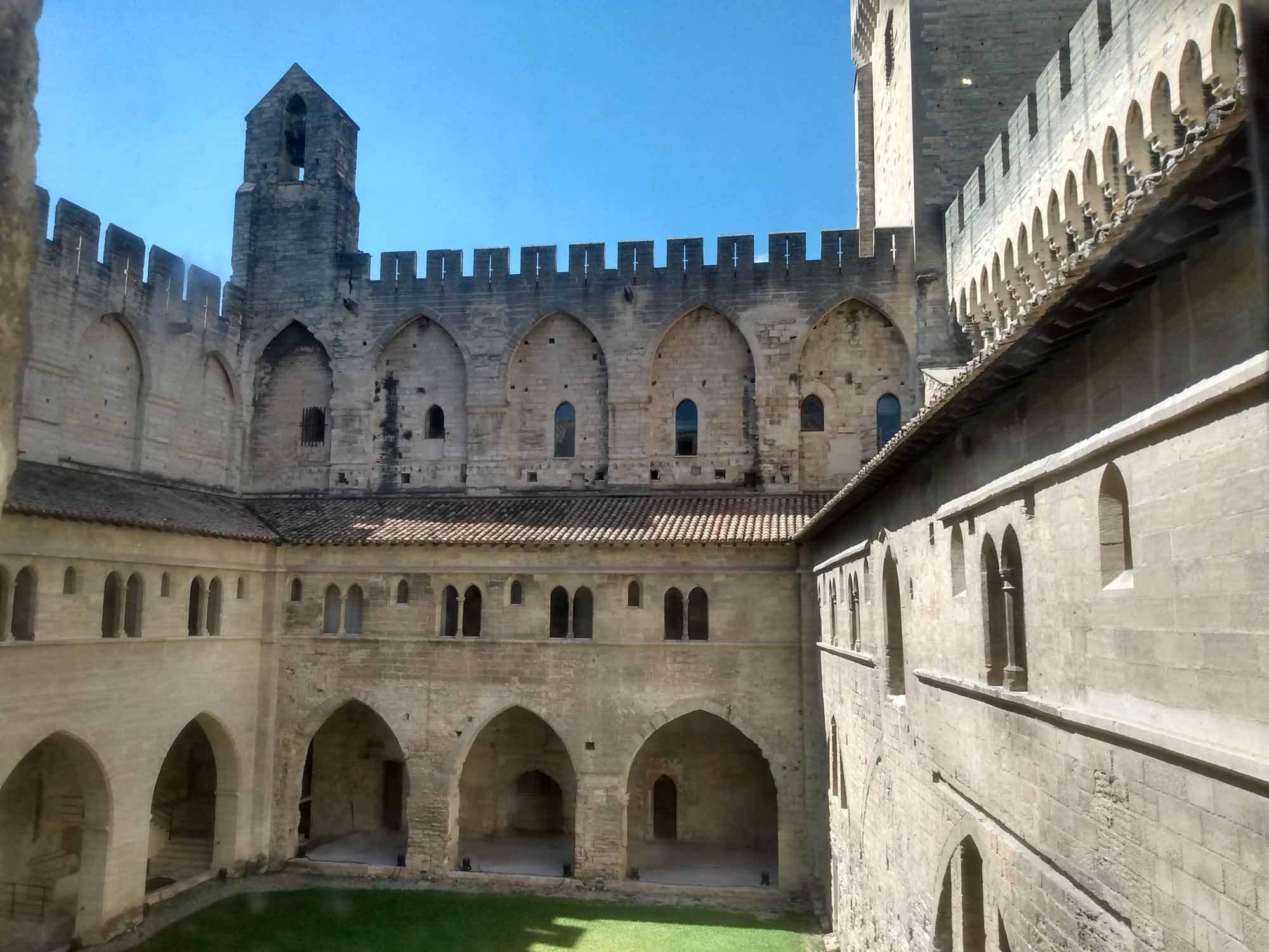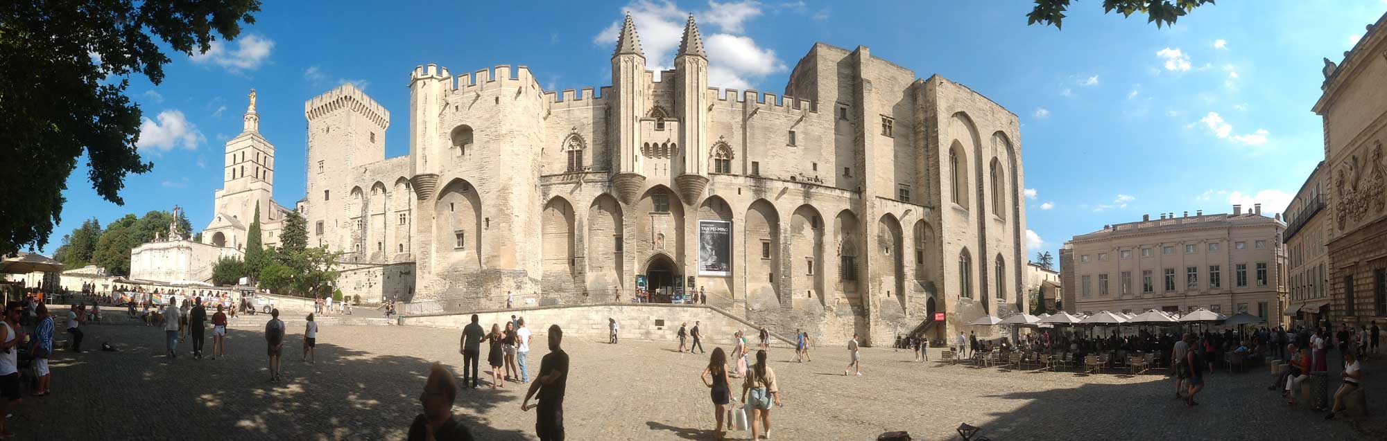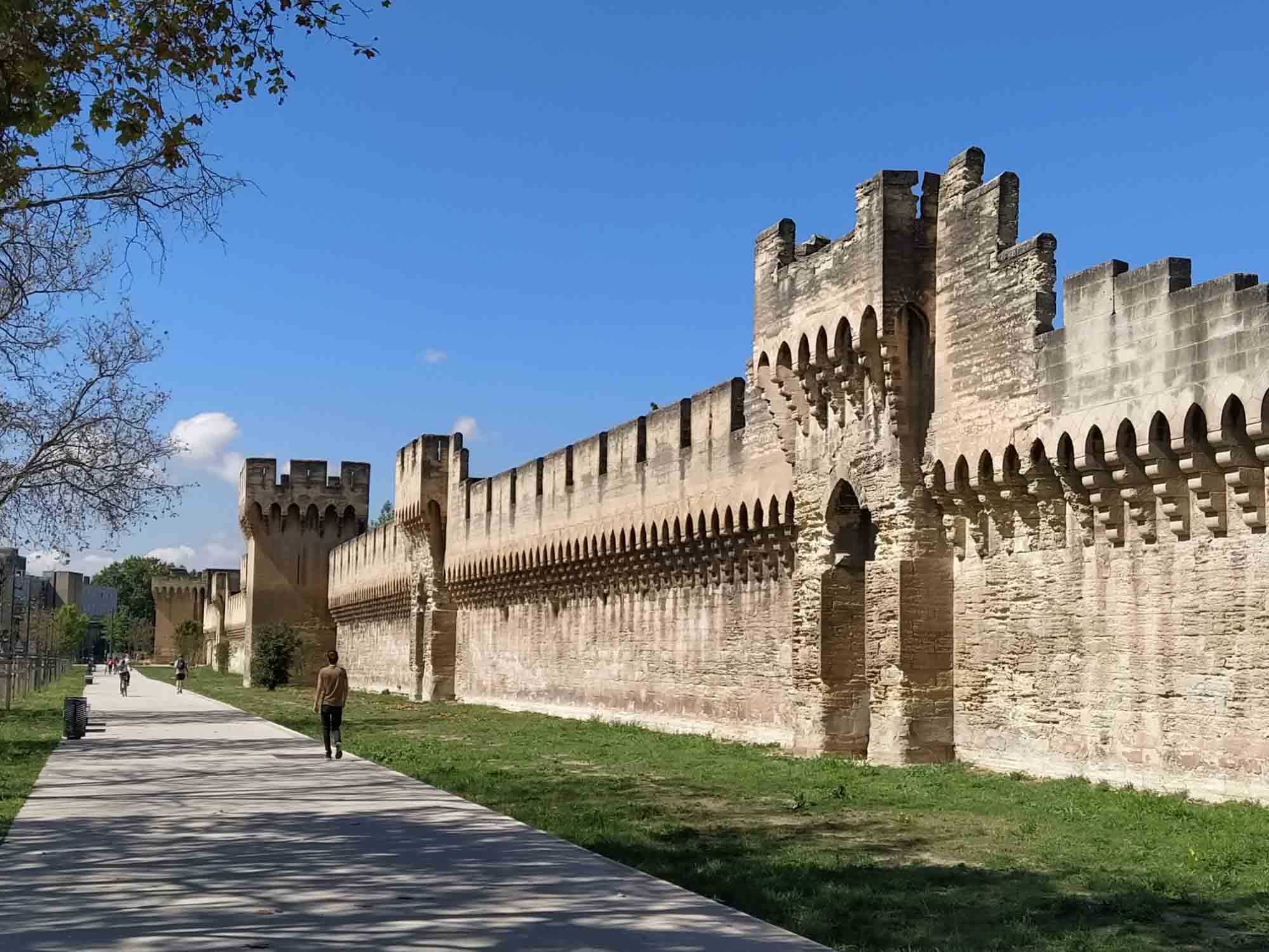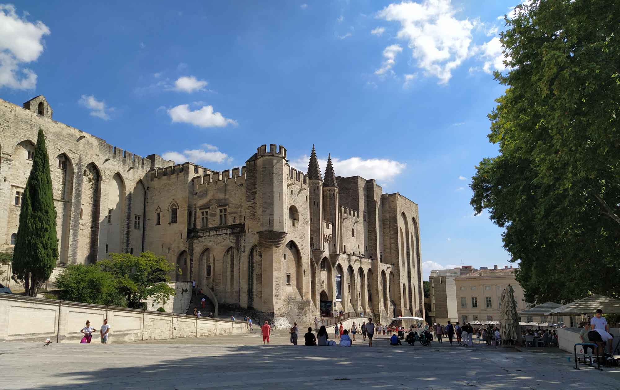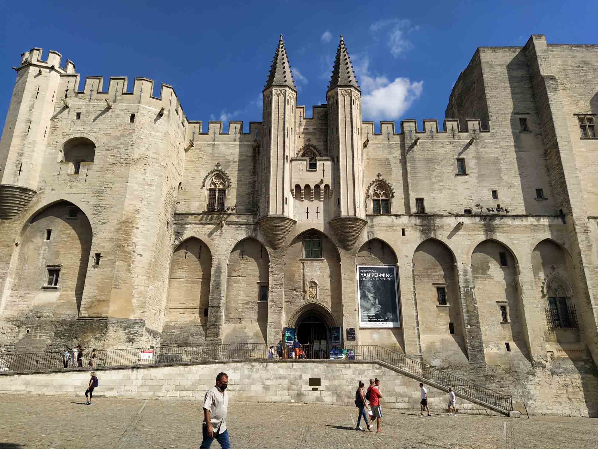 Das Wetter war wieder heil. Strahlend blauer Himmel und gefühlte 30 Grad ließen uns heute wieder schön schwitzen. Was will man mehr? Eine Stunde brauchten wir bis Avignon. Wir parkten außerhalb der Stadtmauer, die noch vollständig erhalten die gesamte Altstadt umschließt. Mit dem Fahrrad ging es dann in die Stadt. Die Altstadt ist größtenteils autofrei, was das herumschlendern sehr angenehmt machte. In der Einkaufspassage standen an einem Platz schöne alte amerikanische Wagen herum. Schon schick, so ein Caddilliac. Die Hauptattraktion ist sicherlich der Papstpalast, den wir ebenfalls besichtigten. Hier war von 1304 bis 1376 für 71 Jahre das katholische Zentrum der Welt. Der Palast wurde allerdings erst 1335 fertiggestellt. 7 Päpste lebten in dieser Zeit in Avignon. Das ist schon ganz schön lange her und man sieht es dem Bauwerk auch an. Zumindest der Teil, der den Besuchern zugänglich ist, war alt und zerfallen. Keine schönen Deckengemälde oder Wandbemalungen. Die kläglichen Reste kaum nennenswert. Es wäre schöner gewesen, einen gut restaurierten Palast zu besuchen, als sich das ganze virtuell auf den ausgehändigten Tablets anzusehen. Am Computer hätten wir uns den Palast auch zu Hause ansehen können. Aber die Größe der Räume war denn doch ein wenig beeindruckend und die animierte Darstellung vermittelte zumindest einen Eindruck, wie es vielleicht einmal gewesen sein könnte. Das Museum Le Petit Palais war unser nächstes Ziel. Hier gab es eine Sonderaususstellung italienischer Künstler. Eigentlich ganz schön. Aber es wäre vielleicht noch schöner gewesen, wenn die Ausstellung nicht ausschließlich kirchliche Motive beinhaltet hätte. Nach unzähligen Maria mit Kind, Heilige Drei Könige, Apostel und Jesusdarstellungen waren wir dann doch froh, wieder draußen zu sein. Dort erschallte laute Musik und Sprechgesang den Vorplatz des Papstpalastes. Eine Anti-Corona-Demo verschaffte sich gehör und skandierte "Liberté" (Freiheit). Nach dem, was wir gestern beim Einkaufen gesehen hatten, vielleicht auch verständlich. Vermutlich hatten sie sich nicht impfen lassen und wollten enfach mal wieder einkaufen gehen. Wie auch immer, die Stimmung war gut und Polizei war nirgends zu sehen. Wir spazierten noch ein wenig durch die oberhalb des Palastes gelegene Gartenanlage und bekamen von dort auch die berühmte Pont d'Avignon zu sehen. Die allerdings nur noch bis zur Mitte der Rhone führt. Anschließend fuhren mit den Fahrrädern zurück zum Auto und danach zum nördlich der Stadt gelegenen Fort Saint-André, einer Burganlage mit Abtei. Wir kamen allerdings dort erst um 19 Uhr an, genau die Zeit, wo die Türen der Burg abgeschlossen wurden. Trotzdem konnten wir noch kurz in das Innere gehen, das aber nicht wirklich sehenswert war. Die Silhuette der Burg von außen war viel eindrucksvoller. Zum Übernachten fuhren wir in den Nationalpark Alpilles, eine kleine bergige Landschaft südlich von Avignon. In der Dämmerung packten wir dann schnell noch unseren Grill aus. Aber die Nacht brach so schnell herein, dass wir unsere Lammkoteletts, die Schweinespieße und natürlich unser geliebtes Kräuterbaguette mit der Taschenlampe fertig grillen mussten.
