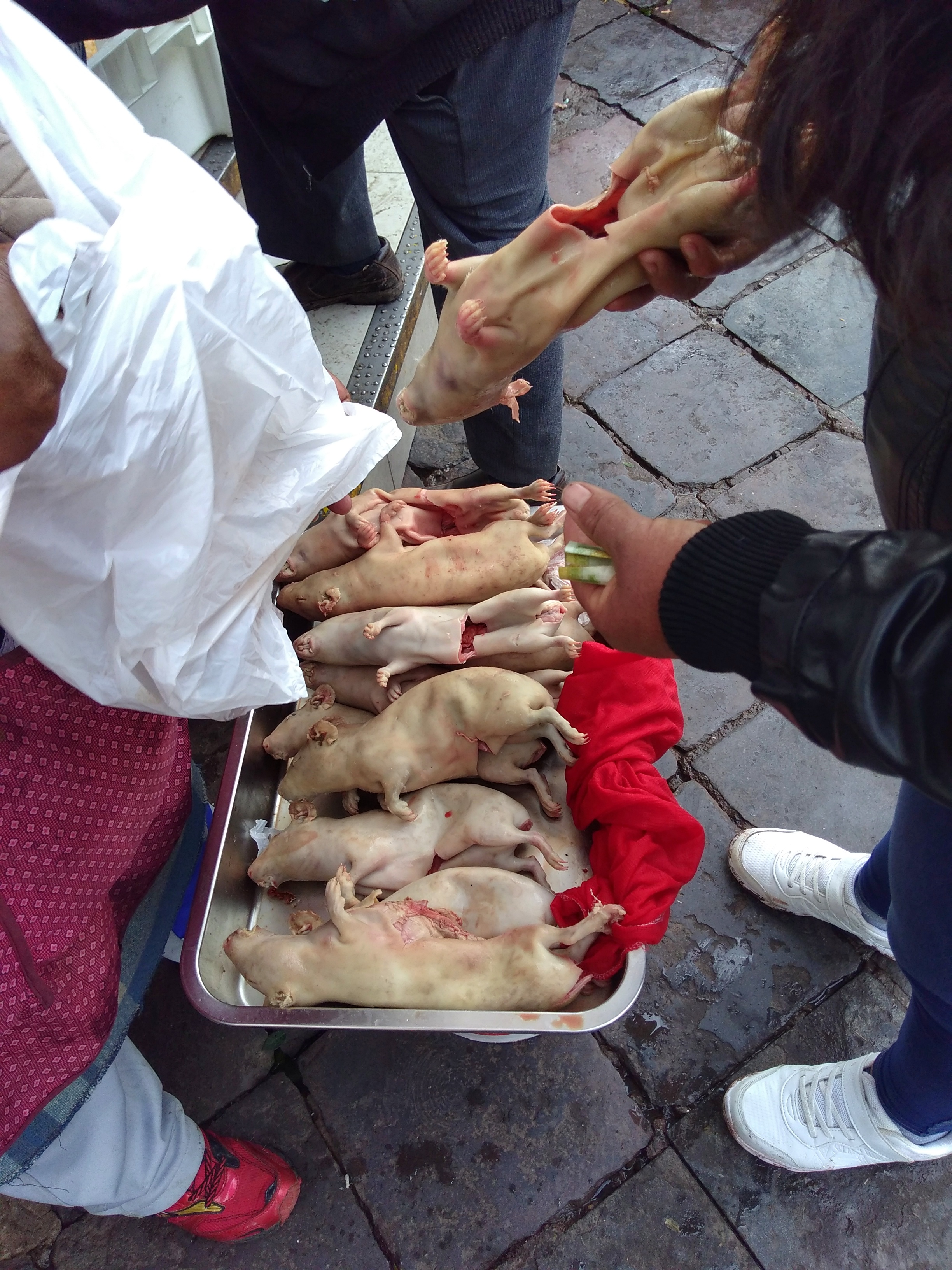 Es regnet. Wir warteten es ab und blieben einfach etwas länger im Bett. Gegen Mittag gingen wir dann noch einmal in die Stadt, um eine Decke aus Alpaka zu kaufen, die wir gestern entdeckt hatten. Außerdem gingen wir noch in das Inca-Rail-Büro, wo uns die Tickets für die morgige Fahrt nach Aguas Calientes ausgestellt wurden. Danach setzten wir uns in ein Café. Auf Logenplätzen in der 1. Etage genossen wir unsere Cappuccinos bei einem schönen Blick auf die Fußgängerpassage. Beim Bezahlen fragten wir noch, wann die beste Uhrzeit sei, heute auf den Friedhof zu gehen. Die Antwort „morgen“ überraschte uns, da wir speziell Allerheiligen als den Tag kannten, an dem die Gräber gepflegt und den Toten Gaben gegeben werden. Wir liefen noch ein wenig durch die Stadt bevor wir in der Nähe unseres Appartements in eine kleine Pizzeria gingen.