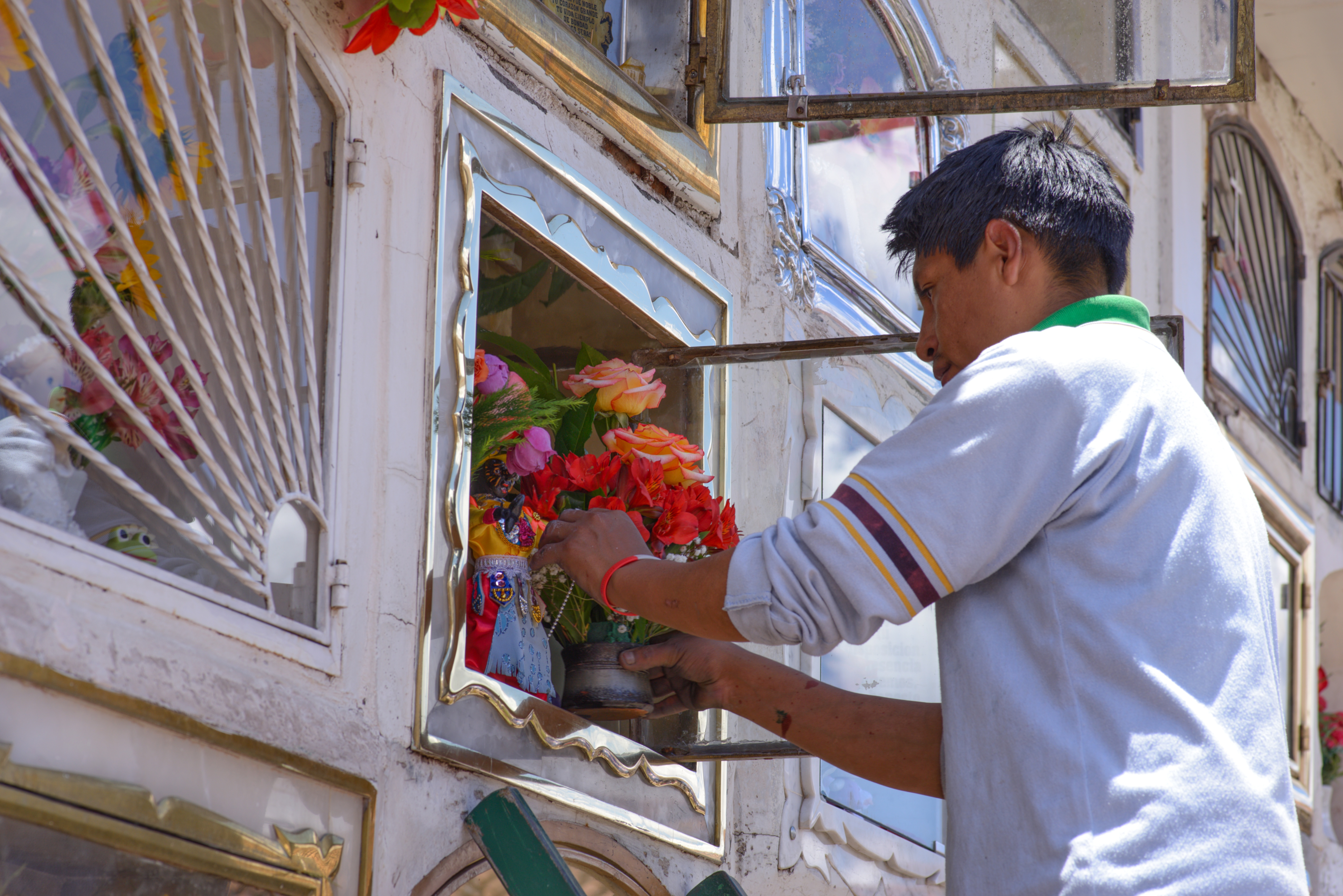 Unser Bus nach Ollantaytambo, wo wir unseren Zug besteigen würden, fuhr erst nachmittags los. So hatten wir noch genügend Zeit, einen schönen alten Friedhof zu besuchen. Auf den Straßen war schon wieder sehr viel los. Blumenverkäufer überall und hektische Menschen, die sich in Taxen und Collectivos drängelten. Auf dem Friedhof wurden die Fenster der Gräber poliert. In den Gräbern waren überall kleine Gaben zu sehen. Bier, Cola, Chicha, etc. aber auch Brot, Kuchen und ähnliches. Kitschige Plastik-Wackelfiguren wackelten vor sich hin. Allerdings ging es besinnlicher zu, als wir es erwartet hatten. Über einen der vielen Märkte gingen wir wieder zu unserem Appartement zurück, schnappten unsere vorbereiteten kleinen Rucksäcke und gingen dann zur Inca-Rail-Station an der Av. del Sol, wo wir unsere Wartezeit mit Kaffee, Keksen und Kuchen versüßten. Pünktlich fuhr uns unser Kleinbus nach Ollantaytambo, einem niedlichen Ort, der ein wenig an einen Skiort erinnert. Nach einer kurzen Wartezeit wurden wir zum Zug geleitet, der uns dann in knapp 2 h nach Aguas Calientes brachte. Beim Einchecken im Hotel bekamen wir noch Hilfe mit unseren Tickets für Machu Picchu, die wir nicht ausgedruckt hatten. Dann gingen wir endlich zum Essen. Es war immerhin schon kurz vor 22:00 Uhr. Wir teilten uns eine vegetarische Suppe (Gemüse gibt es hier sehr wenig) und eine sehr leckere Fajita. Als wir fertig waren, fing es kräftig an zu regnen. Hoffentlich wird es morgen besser. Dann gingen wir schlafen, denn morgen dürfen wir wieder sehr früh aufstehen.