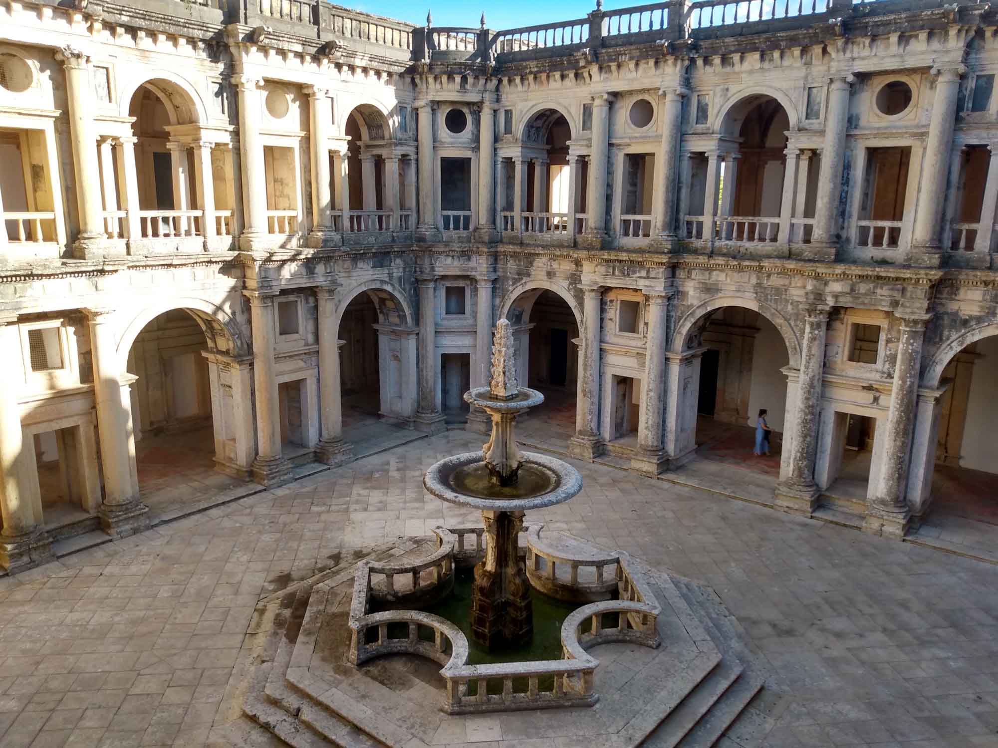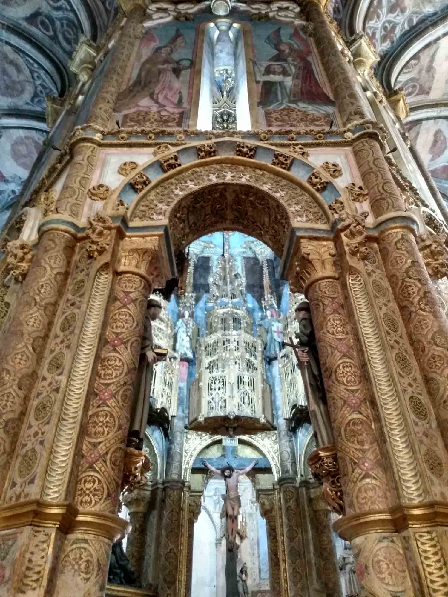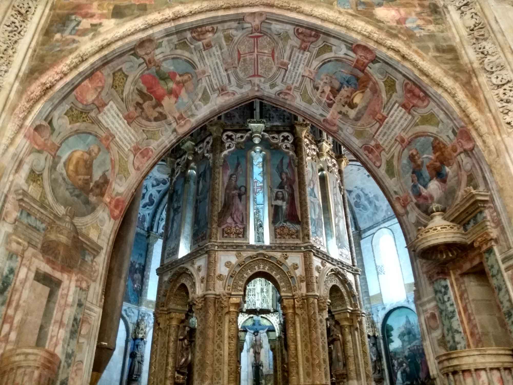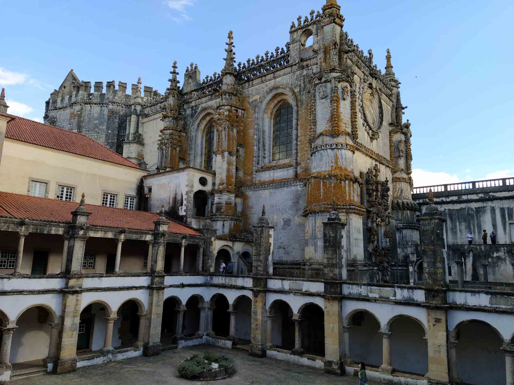 Und wieder war es ein wundervoller Tag mit herrlich viel Sonne. Die Nacht am Stausee war ruhig aber wir waren überraschend früh auf den Beinen. Das war auch gut so, denn wir hatten einiges an Strecke vor uns. Über Coimbra fuhren wir nach Tomar. Dort steht das recht gut erhaltene Kloster des Templerordens. Der Bau begann 1160, nachdem dort der Orden gegründet worden war. Insbesondere die Kirche mit einem beeindruckenden Altar, bestehend aus 8 zentralen Säulen und einer großen reich bemalten Kuppel über den Säulen und einem kleinen Rundgang ist sehr sehenswert. Der Rest der Anlage war mal gut, mal weniger gut erhalten. Man konnte jedoch auf jeden Fall den Eindruck gewinnen, dass es sich die Klosterbrüder hier haben gut gehen lassen. Zu unserem Stellplatz war es diesmal etwas weiter als üblich. Die Sonne war bereits untergegangen, als wir unseren Platz an einer stillgelegten Fähre über den Tejo bei Amieira do Tejo erreichten. Dafür waren wir wieder einmal alleine und hörten nur noch die Glocken der in der Nähe weidenden Kühe.