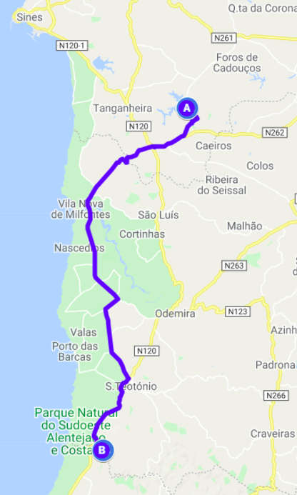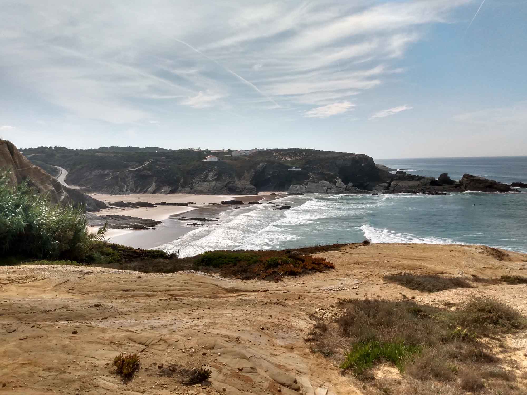 Der Platz war schön, vor allem ruhig aber nicht so uneinsichtig, wie wir das für einen Pausentag schön finden. Wir fuhren also noch ein wenig weiter durch das Alentejo. Dabei kamen wir sogar an einer Korkfabrik vorbei und sahen die vielen Rinden, die dort gestapelt waren und die genau so aussahen, wie die, die wir gestern gefunden hatten. Wir machten einen kurzen Abstecher nach Zambujeira do mar, wo an dieser Küste der schönste Strand sein sollte. Aber sowohl der kleine Ort als auch der Strand überzeugten uns nicht. Es gilt mal wieder die alte Regel: Traue nicht dem Reiseführer. Unseren Platz fanden wir dann knapp außerhalb des Nationalparks bei São Miguel. Schön versteckt hinter Bäumen mit einer kleinen vertrockneten Wiese, wo wir die Marquise ausfahren und Tisch und Stühle aufstellen konnten. Abends gab es frisch gegrillte Hähnchenkeulen mit Tomatensalat.