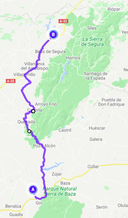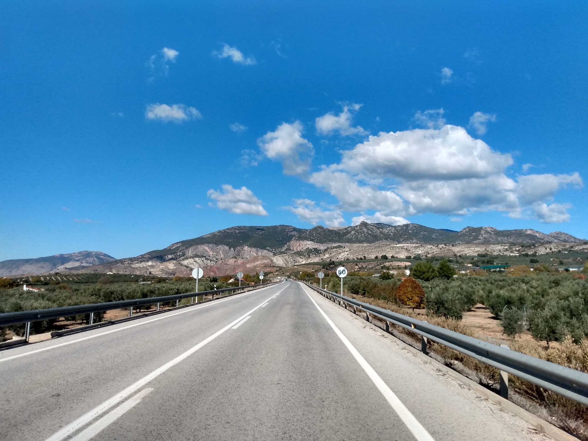 Der morgentliche Spaziergang fiel heute etwas länger aus. Aneta war drauf und dran eine Vermisstenmeldung abzugeben, als Michael mit Berta nach einer Stunde wiederkam. Der Morgen war wunderschön, die Sonne schien und es war bereits um 9 Uhr angenehm warm. Heute sollte es nicht allzuweit gehen. Wir wollten uns nur ein gemütliches Plätzchen suchen, wo Berta frei laufen kann und die nächste Straße etwas weiter weg ist. Unser Traumplatz, an einem Stausee sah im Internet fantastisch aus und sollte nur 30 Minuten weg sein. Die sandige Straße, die dorthin führte war kürzlich begradigt worden, so dass sie sich sehr gut fahren ließ. Auch die Steigungen waren kein Problem. Bis wir, ca. 1 km vor dem Ziel plötzlich inmitten von Olvienbäumen standen und weder vor noch zurück konnten. Das Auto wirkte von außen plötzlich viel viel größer, als es so von den eng stehenden Olivenbäumen eingerahmt wurde. Natürlich ging es dann doch irgendwie zurück und nach vielleicht 300 m Rückwärtsfahrt durch den Olivenwald fanden wir eine Stelle, an der wir wenden konnten. Schade, der Platz wäre bestimmt toll gewesen. Den nächsten Platz sollte es in der Nähe des Passes Puerta de Tiscar (1183 m) geben. Bis dahin fuhren wir noch einmal 45 Minuten. Aber auch aus diesem Platz wurde nichts, denn genau beim Pass war heute ein großer Andrang von Menschen und Fahrzeugen, denn hier fand irgendeine Art von Wettlauf statt und der Pass war das Ziel. Also weiter nach Cazorla, noch einmal 45 Minuten. Der Platz sollte im gleichnamigen Nationalpark liegen. An der Zufahrt zum Nationalpark standen jedoch zwei nagelneue Verbotsschilder, die die Weiterfahrt für Wohnmobile untersagten. Bis hierhin wurden wir durch die fantastische Landschaft getröstet, durch die wir gefahren sind. Herrlich kleine Bergstraßen, auf denen wir maximal 40 km/h fahren konnten, ließen uns ausgiebig Zeit zum Genießen. Aber so langsam wurde es spät und wir hatten unseren Platz noch immer nicht gefunden. Wir suchten noch einmal und fanden einen, der im Wald am Ende einer Sackgasse sein sollte aber noch einmal über eine Stunde Fahrzeit bedeutete. Aber gut, immerhin ging es in die richtige Richtung. Nur des Pech mit den Plätzen hielt heute an: Es war keine Sackgasse, sondern nur eine Grünfläche abseits einer zumindest wenig befahrenen Straße. Nur war kürzlich ein Graben zwischen der Straße und dieser Grünfläche gezogen worden, vermutlich in Vorbereitung auf die kommenden Regenfälle. Und dieser Graben verhinderte erfolgreich, dass wir auf dieses Grün fahren konnten. Letzlich landeten wir inmitten eines Olivenhains, der auch an dieser Straße lag. Und es war auch noch so früh, dass wir unseren gemeinsamen Abendspaziergang im Hellen machen konnten. Aber leider doch so dicht an der Straße, dass es halt auch nicht das perfekte Plätzchen für die nächsten Tage werden wird. So werden wir morgen leider weitersuchen müssen.