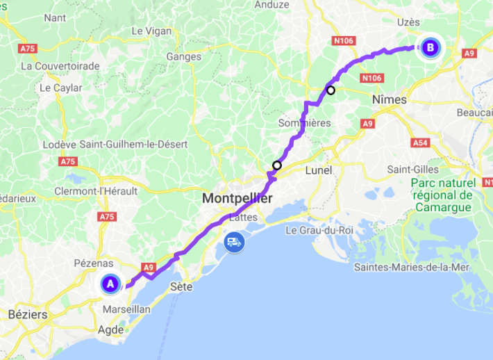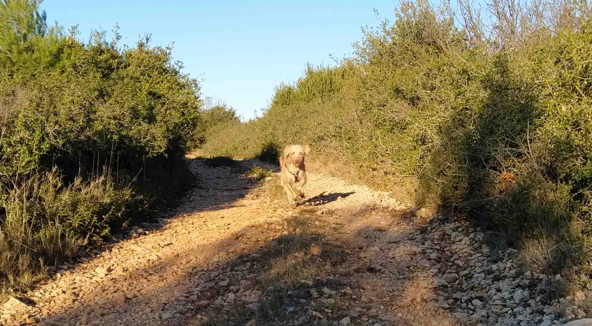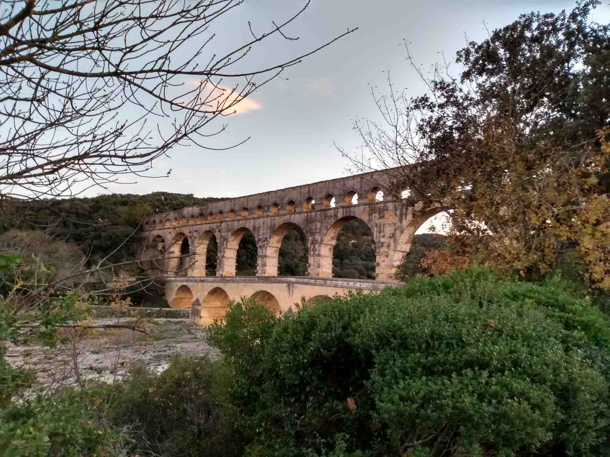 Die Sonne schien schon wieder herrlich und das Eis knirschte unter unseren Füßen, als wir unseren ersten Spaziergang machten. Bis auf einen alten Weinbauern trafen wir niemanden. Er war gerade dabei, seinen Elektroschrauber zu reparieren und wir tauschten ein paar Worte aus. Auf dem Rückweg stand er in seinem Feld und befestigte einige seiner Rebstöcke. Nunmehr bekannt, grüßte er herzlich zurück als wir ihm zuwinkten. Mit einem kurzen Halt zum Einkaufen (diesmal hat es mit den Austern geklappt), fuhren wir zum Pont du Gard. Dort kamen wir erst kurz vor Sonnenuntergang an. Beim Aufdrehen der Gasflasche kam dann eine böse Überraschung. Die Heckschürze hinten links war jetzt auch defekt. Irgendjemand muss uns heute, während wir geparkt haben, hinten rein gefahren sein. Wir vermuteten, dass dies vor dem Tierladen passiert ist. Aber genau wissen wir es nicht. Das Gute daran ist aber, dass wir jetzt sowohl die rechte (von dem Unfall am Anfang unserer Reise) und die linke Heckschürze austauschen müssen. Dann sehen sie wenigstens gleich aus. Wir ließen uns die gute Laune nicht verderben und liefen den Berg hinauf zum Pont du Gard. Bis wir tatsächlich dort waren, war die Sonne schon untergangen. Aber das Licht reichte trotzdem noch für den Drohnenflug, für den wir gekommen waren. Berta lief wie immer frei und während Michael mit seiner Drohne spielte, ging Aneta mit ihr herum. Auf dem Rückweg war auch alles prima, bis wir wieder an die Straße kamen. Dort schlüpfte Berta und einem Zaun hindurch und ließ sie auch nicht zurückrufen. Wir gingen erstmal weiter. Normalerweise kommt sie dann nach kurzer Zeit. Aber nicht diesmal. Also wieder zurück, den Berg hinauf und noch einmal rufen. Nach ein paar Minuten dann ein kurzes Bellen. Ging es Berta gut? Wurde sie gerade entführt? Hatte sie sich verletzt oder irgendwo verfangen? Michael lief um das Grundstück herum und rief erneut. Außer ein wenig Rascheln war jedoch nichts zu hören. Inzwischen war es dunkel geworden und mit der Taschenlampe liefen wir weiter um das Grundstück herum, bis wir zu einer Einfahrt mit einem kleinen Bungalow und einer Art Container kamen. Und hinter diesem Container war sie und schaute angestrengt darunter. Aber auch jetzt ließ sie sich nicht herbeirufen. Stattdessen krabbelte sie unter den Container und jagte dem, was auch immer darunter gewesen war, durch die dahinter liegenen Büsche hinterher. Hin- und wieder tauchte sie im Licht der Taschenlampe auf, um gleich darauf wieder zu verschwinden. Dann kam der Besitzer mit seinem Auto zurück. Ausgesprochen freundlich erlaubte er gleich, dass wir Berta auf seinem Grundstück weiter suchen durften. Die machte aber noch immer keinerlei Anstalten, auf irgendwas oder -wen zu hören. Es dauerte noch ein Weilchen, bis sie Aneta in die Hände lief und diese sie festhalten konnte. Danach ging es an die Leine und dann doch wieder zurück zum Wohnmobil. Unterwegs stellten wir fest, dass es zwei neue Kratzer an ihrem Ohr gab, die natürlich wieder bluteten. Das war dann wohl die nächste Begegnung mit einer Katze. Daran werden wir wohl noch arbeiten müssen. Nachdem wir sie dann einigermaßen überreden konnten, doch wieder mit uns mitzukommen, nahm sie dann sehr gerne ihr Abendbrot von uns entgegen und legte sich dann gleich wieder schlafen. Sie wachte noch nicht einmal auf, als wir uns das Essen machten und danach noch ein wenig spielten. Wahrscheinlich träumte sie davon, wieviel Spaß es macht, einer Katze hinterherzujagen.