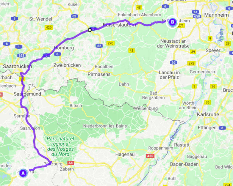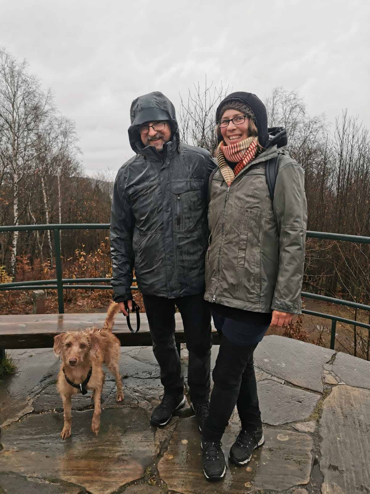 Um 8 Uhr klingelte der Wecker. Keiner von uns Dreien hatte Lust, aufzustehen. Berta schaute müde aus ihrem Körbchen und bewegte sich erst, als wir aus dem Bett gestiegen waren. Es war aber auch die erste Nacht, die sie im Körbchen geschlafen hatte und offensichtlich gefiel es ihr ganz gut. Nach dem Morgenspaziergang und Frühstück fuhren wir noch schnell zum Einkaufen (noch einmal 3 Weinkartons zur Sicherheit) und dann mit einer kleinen Pause unterwegs in den Pfälzer Wald. Dort trafen wir Lisa und Thommy mit ihren beiden Hunden Atti und Mera. Die zwei hatten wir an der Algarve in Portugal kennengelernt und uns hier verabredet. Natürlich musste es gerade dann kräftig anfangen zu Regnen, als wir kurz nach 14 Uhr dort ankamen. Die Hunde beschnupperten sich kurz und liefen dann munter mit uns gemeinsam durch den Regen. Die nächsten drei Stunden spazierten wir durch den Wald. An einem Aussichtstum machten wir die Hunde los und sie tobten ein Weilchen auf der davor liegenden Wiese herum. Es war ein richtig schönes Spielen: Mal jagte Berta hinter Atti her, mal war es umgekehrt und auch Mera spielte fleißig mit. Berta verhielt sich absolut vorbildlich: Sie kam, wenn sie gerufen wurde, ließ sich anleinen, wenn es notwendig war, lief dann perfekt an der Leine, bellte weder bei Passanten, noch bei spielenden Kindern noch bei anderen entgegenkommenden Hunden. Der Regen hörte nach eine Stunde auf und so konnten unsere Sachen schon unterwegs ein wenig trocknen. Als wir wieder bei den Autos waren, war es noch ein bischen hell und so liefen wir noch zur Limburg hoch. Von hier hatten wir einen tollen Blick über das Tal. Wir verabschiedeten uns herzlich und hofften alle, dass wir uns bald wiedersehen würden. Danach stiegen wir ins Wohnmobil und entschieden, dass wir heute Nacht gleich hierbleiben können. Berta legte sich sofort hin und schlief gleich ein. Danach gab es Abendbrot und während sie sofort wieder einschlief spielten wir noch ein bisschen und sinnierten darüber, was für ein schöner Tag das heute gewesen war.