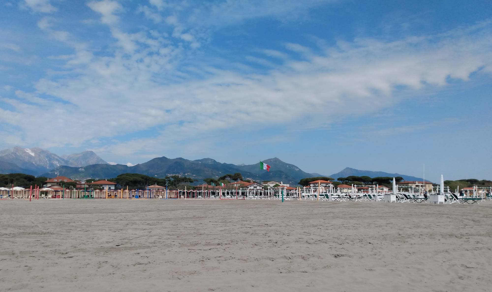 Der Spaziergang am Morgen führte uns über ein Mini-Dörfchen, bestehend aus zwei Häusern und einer Kirche mit Namen San Geminiano (nicht zu verwechseln mit dem wunderschönen Ort bei Siena, worauf wir uns schon sehr freuen) bis auf den höchsten Berg in der näheren Umgebung. Wir wanderten die Skipiste bis nach oben und wurden mit einem tollen Blick über die bergige Landschaft der Appenien belohnt. Dann fuhren wir die holperigen, schmalen und sich in engen Serpentinen schlängelnden Straße quer durch die Berge nach Süden bis wir bei Forte dei Marmi das Mittelmeer erreichten. Wir ließen den Wagen stehen und gingen an den Strand. Berta durfte frei laufen und genoss das Rennen im warmen Sand. Die Wellen des Meeres beängstigten sie überhaupt nicht mehr. Sie lief ein Stück durch das flache Wasser, legte sich dann hin und ließ sich von den sanften Wellen umspülen. Danach wälzte sie sich etliche Male im Sand. Kurz: Sie hatte Spaß. Nach einem kleinen Strandspaziergang entlang des etwa 20 km langen Sandstrandes gingen wir zurück zum Wagen und machten uns auf Stellplatzsuche. In Camaiore entsorgten wir mal wieder unser Wasser und tankten frisches. Um zu dem kleinen Parkplatz bei Chiatri zu gelangen, auf dem wir übernachten wollten, fuhren wir einen kleinen Umweg, da es in den Kommentaren hieß, dass der Weg in Richtung Viareggio sehr schmal sei. Die Straßen, die wir hierfür nahmen, waren dann aber wirklich sehr sehr schmal. Nur gut, dass uns auf der gesamten Strecke nur einmal ein Auto entgegenkam. Nachdem wir einen Wagen überholen ließen, winkte er uns und fuhr in den Kurven hupend vor uns her. Das war mal ein netter Italiener. Schließlich erreichten wir den Platz und machten es uns gemütlich.