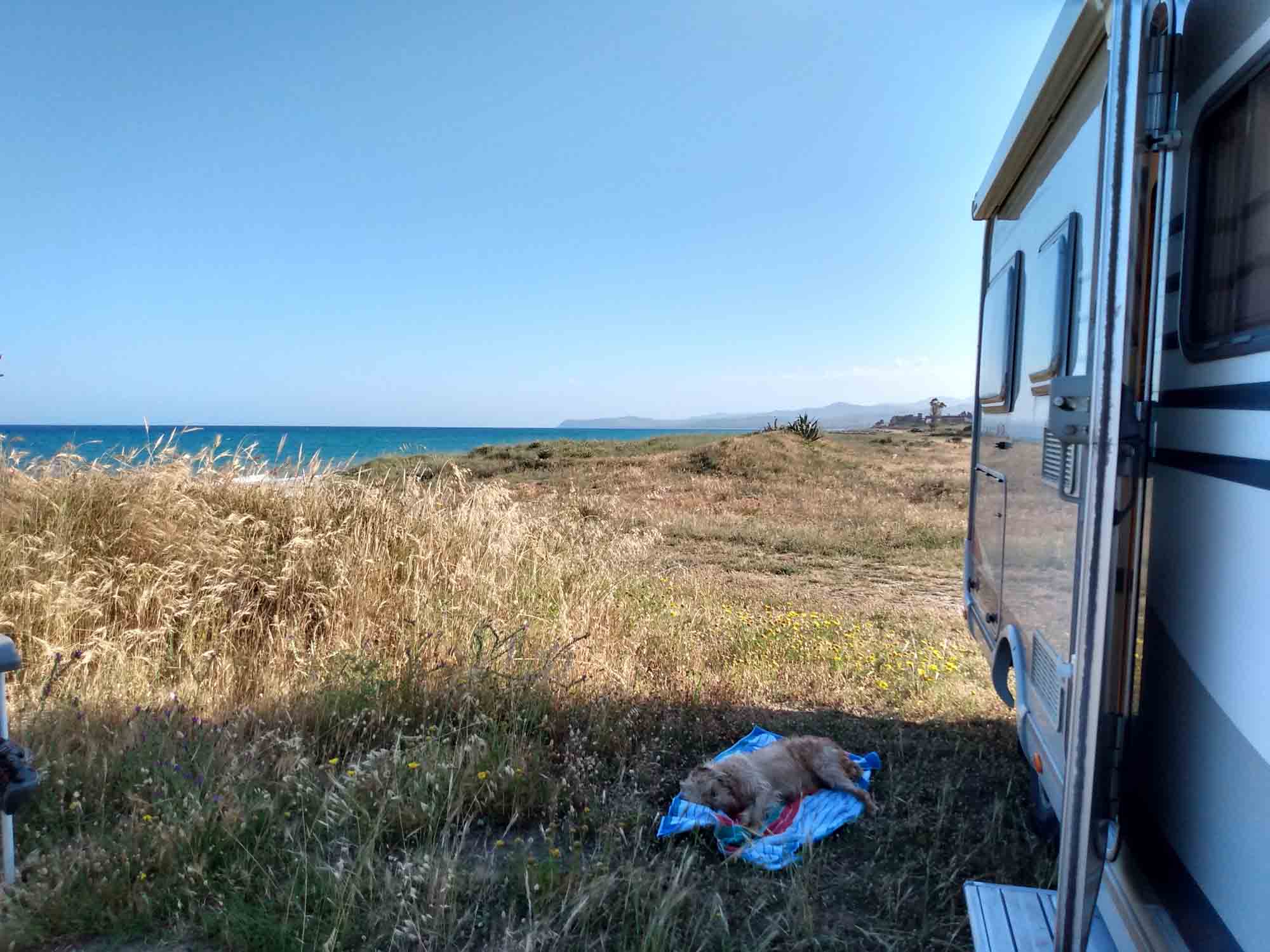 Ganze drei Tage blieben wir an diesem wunderschönen Strand. Wir standen direkt an der kleinen Düne und hatten auf unseren Stühlen freien Blick auf das Meer. Die Entsorgung war fußläufig, Abwaschwasser konnten wir direkt versickern lassen und Frischwasser war 20 m weit weg. Strom hatten wir dank Solaranlage ebenfalls mehr als genug. So könnten wir es hier beinahe unendlich lange aushalten. Zumindest solange, wie die Lebensmittel hielten, bzw. dem Kühlschrank das Gas ausgehen würde. Also ca. 4 - 5 Wochen. Wir genossen die Zeit, Berta brauchte nicht ein einziges Mal an die Leine und blieb sowieso den ganzen Tag im Schatten beim Wagen. Zum Herumlaufen war es ihr viel zu heiß. Nach den Spaziergängen trank sie kurz ein wenig Wasser und legte sich dann gleich wieder hin. Die anderen Wohnmobile störten überhaupt nicht. Im Gegenteil: Unsere Nachbarn aus Pfaffenhofen waren sehr nett und brachten uns sogar eine Wassermelone vom Supermarkt mit. Und auch mit einem netten Mann aus Bayern, der einen sehr schönen Setter hatte, unterhielten wir uns einige Male. So vergingen die drei Tage am Strand völlig unbeschwert.