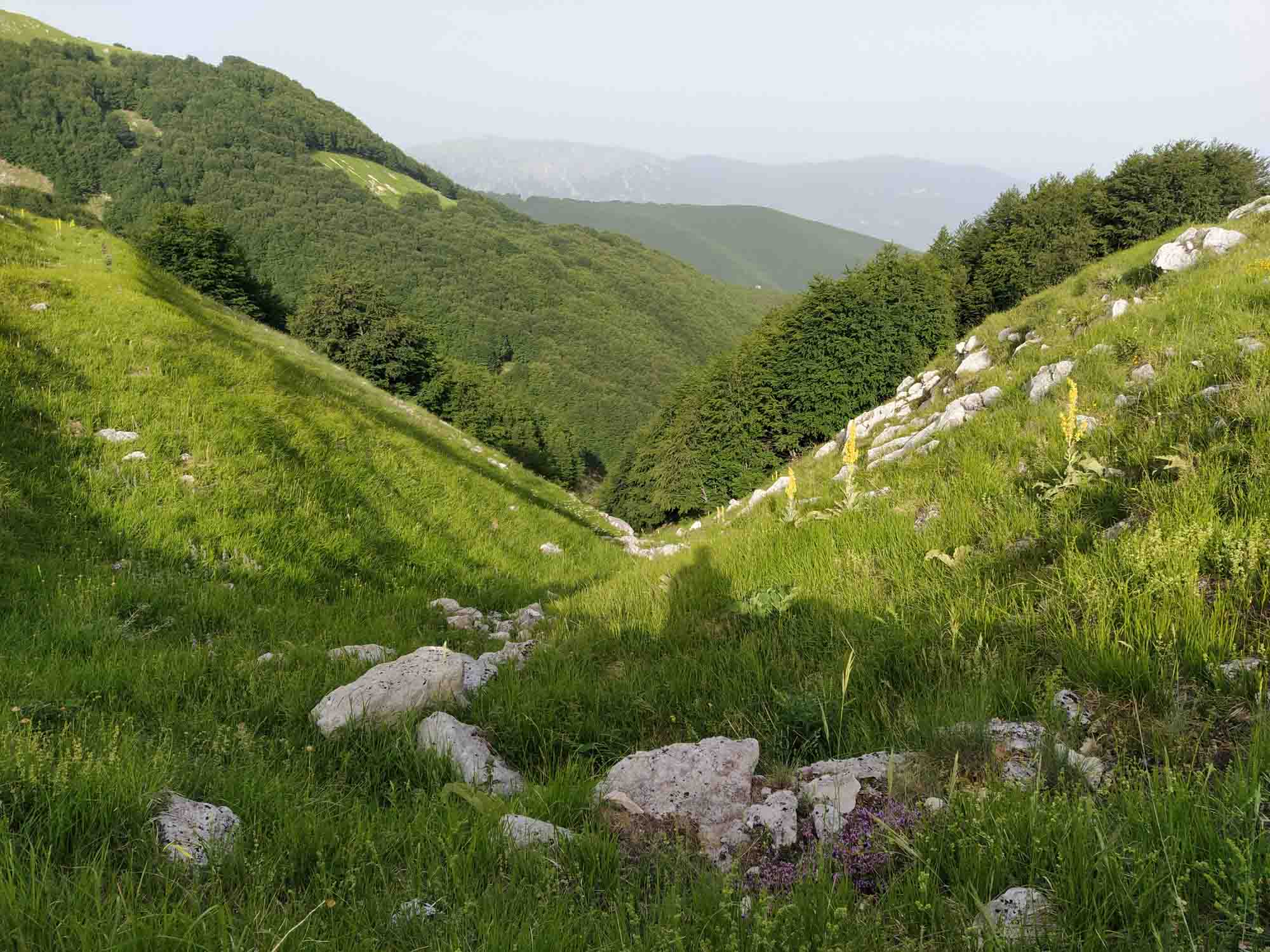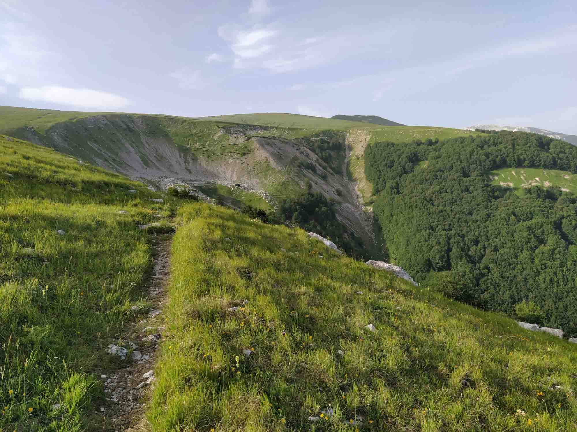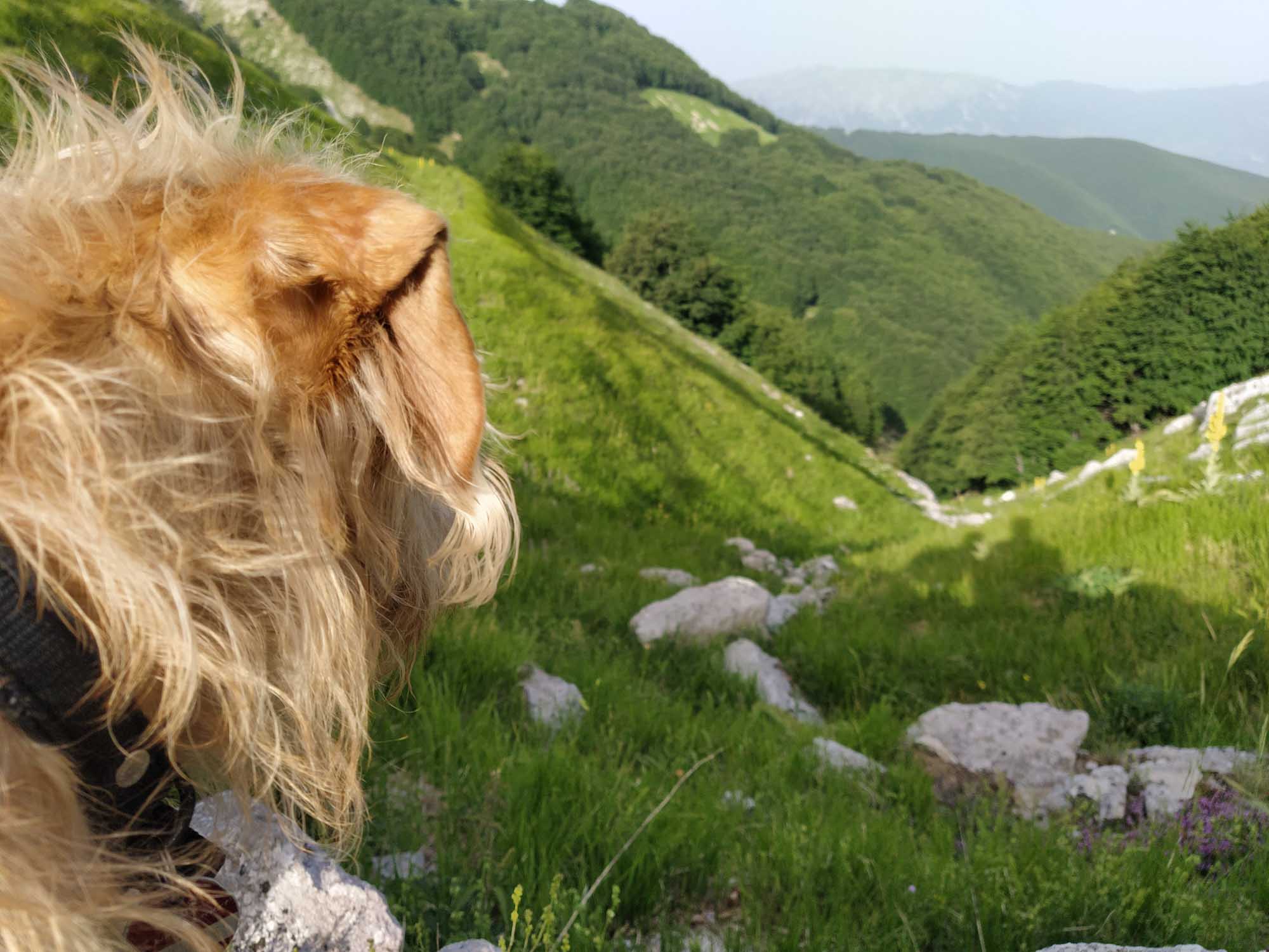 Wieder einmal hatten wir eine ruhige kühle Nacht, auch wenn es auf dem Pass in der Nacht ziemlich windig wurde. Der morgendliche Spaziergang führte uns auf einem schmalen Pfad entlang der Hangkante auf den Berg. Auf dem Rückweg sahen wir am Waldrand ein Reh, dass uns neugierig anblickte. Obwohl Berta frei lief, blieb sie auf dem Weg, schaute einen Moment gemeinsam mit Michael nach dem Tier und lief anschließend weiter entlang des Weges. Wenn es nur immer so gut laufen würde. Nach dem Frühstück fuhren wir los. Eine zeitlang war die Straße so schmal, dass noch nicht einmal zwei normale Fahrzeuge aneinander vorbeigepasst hätten, geschweige denn irgendein Fahrzeug an unserem Wohnmobil. Zudem ging es ziemlich steil bergab. Aber zum Glück kam wieder einmal kein Wagen entgegen. Nach knapp 9 km Talfahrt zeigten die Bremsen plötzlich kaum noch Wirkung. Der starke Geruch bestätigte dann die schnelle Diagnose: Sie waren heißgelaufen. Also warteten wir am Straßenrand eine Viertelstunde und fuhren anschließend langsam unter vollem Einsatz der Motorbremse weiter bis zur Tankstelle, die wir ebenfalls dringend brauchten. 3 Liter waren noch im Tank gewesen. Das hätte locker noch für weitere 20 km gereicht. Unser nächstes Zwischenziel war Aquila. Dort wollten wir unsere Toilette und den Abwassertank entsorgen. Allerdings hatte Google mal wieder andere Pläne mit uns. Sie hatte die Idee, dass wir von Castiglione a Casauria quer durch die Berge nach Bussi sul Tinno fahren sollten. Das klang anfangs nach einer recht guten Idee. Die Landschaft war sehr schön, die Straße asphaltiert und glatt, wenn auch ein wenig kurvig. So schlängelten wir uns knapp 25 km quer durch die Berge bis fast auf den Gipfel. Fast. Denn plötzlich hörte der Asphalt auf und die für vielleicht 300 m gute Schotterpiste wechselte schlagartig in "Hier-geht-es-nur-mit-Allrad-weiter". Also durften wir zunächst 300 m rückwärts fahren und anschließend die 25 km zurückkurven um dann in Torre de Passen an der richtigen Stelle rechts abzubiegen, die kurze Verbindungsstraße bis zur SR5 zu nehmen und anschließend in kaum 45 Minuten auf der perfekt ausgebauten Bundesstraße bis nach Aquila fahren. Dort entledigten wir uns des schmutzigen Wassers und hielten noch einmal an einer Eisdiele, um das wohl schlechteste und teuerste Eis zu kaufen, dass es in Italien gab. Danach wollten wir eigentlich zu einem schönen Platz im Parco Nazionale del Monti Sibillini fahren. Aber dieses mal stimmte leider eine Breitenbeschränkung, die wir am letzten Abzweig 5 km zurück gesehen hatten. Denn wir standen vor einer Ortsdurchfahrt, an der das gleiche Schild mit der Angabe 2 m 20 hing. Es war auf einen Blick ersichtlich, dass der schmale Spalt zwischen den Häuserwänden für unser Wohnmobil zu eng war. Also erneut gedreht und umgeplant. Bevor wir jedoch den avisierten Picknickplatz kurz vor Assisi erreichten, sahen wir auf der linken Seite eine Einfahrt zu einem Friedhof. Hier standen wir vollkommen ruhig und konnten sogar noch einen tollen Abendspaziergang in Richtung der nahen Berge machen. Und Berta konnte noch einmal ihrem Jagdtrieb frönen. Es großes laut grunzendes Tier lief neben uns durch den Wald. Berta schaute kurz und schon hüpfte sie wie ein junges Reh durch das hohe Gras in den Wald, dem Tier hinterher. Erst war ein kurzes Bellen dann ein Grunzen zu hören. Danach war Ruhe. 30 Sekunden später tauchte Berta wieder aus dem Wald auf und wir konnten gemütlich unseren Spaziergang beenden.