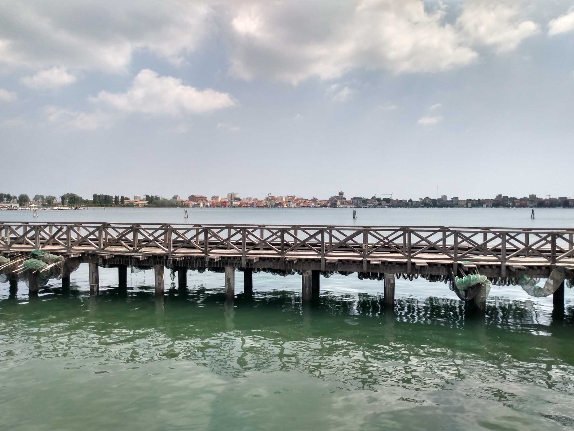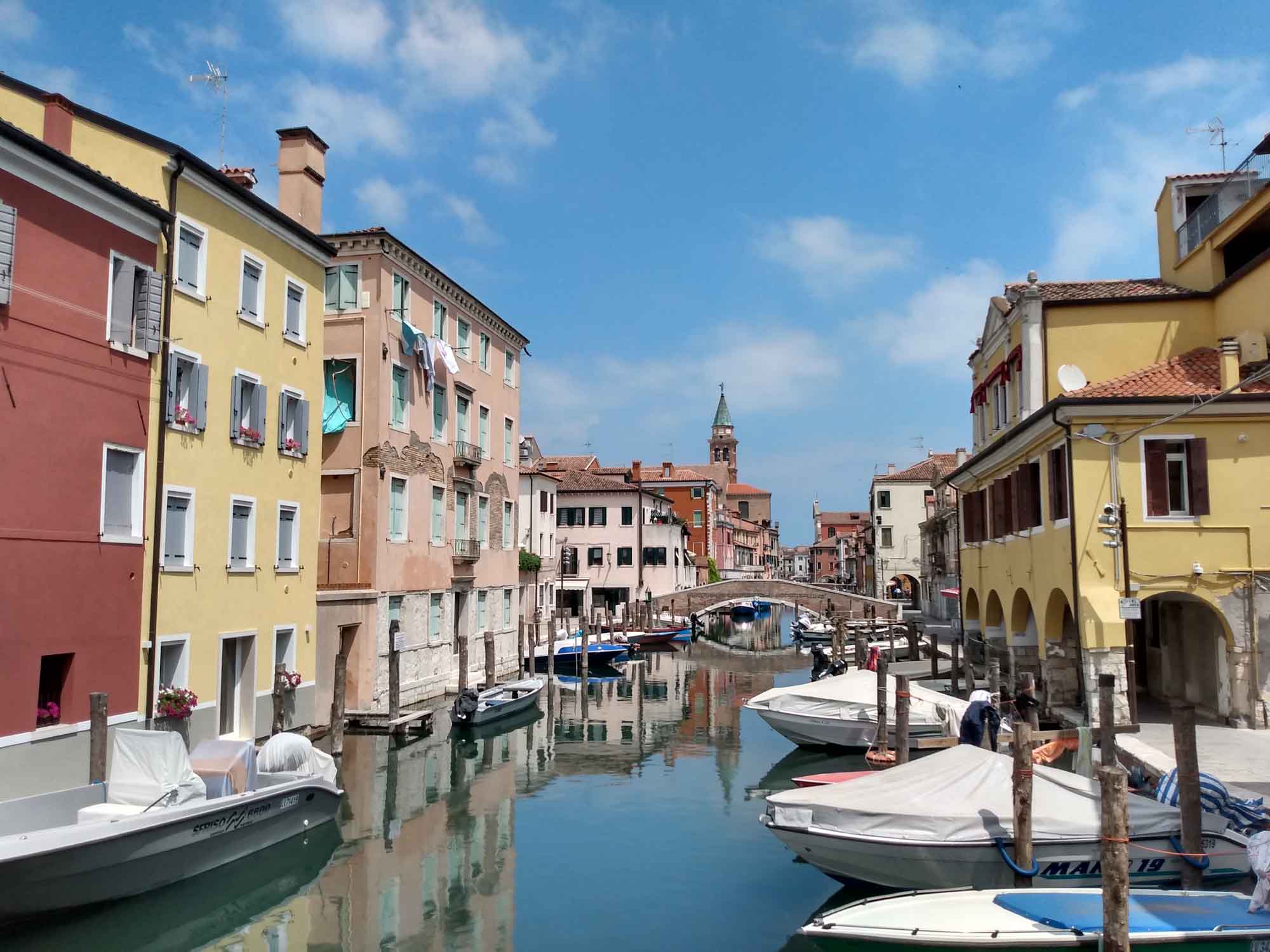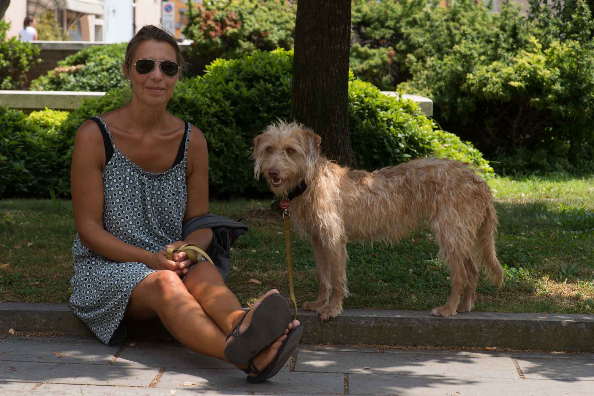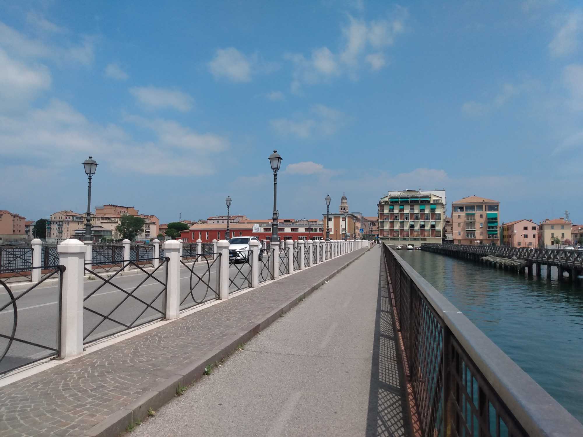 Morgens spazierten wir mit Berta ausnahmsweise an der Leine. Das Risiko noch einmal stundenlang Kletten aus ihr herauspulen zu müssen, wollten wir nicht eingehen. Auch so brauchten wir noch einmal eine halbe Stunde, bis sie endlich halbwegs wieder sauber war. Gegen halb 10 fuhren wir los und wären auch noch recht zeitig in Chioggia angekommen, wenn uns nicht ein längerer Stau an einer Baustelle aufgehalten hätte. So war es dann schon 11:30 Uhr als wir dort ankamen und von unserem Parkplatz in die Altstadt spazierten. Auf dem Hinweig gab es noch ein paar Schatten und wir versuchten so gut wie möglich im Schatten zu laufen. In Chioggia gibt es (fast) wie in Venig kleine Kanäle mit Brücken, an denen zahlreiche Boote liegen. Ein niedliches kleines Örtchen und eine echte Alternative, wenn man dem Troubel in Vendig entgehen will. Hier konnten wir ungestört laufen, ein Eis genießen, Berta beim Baden in einer Vogeltränke zusehen, die Sonne auf uns herniederbrennen lassen, den Ausblick genießen und jede Menge schwitzen. Auf dem Rückweg stand die Sonne im Zenit und auch das letzte bisschen Schatten war verschwunden. Michael ging daher das Auto alleine holen, während Aneta mit Berta unter einem Baum wartete. Dann fuhren wir weiter die Küste entlang. Bei Vendig schüttete es plötzlich wie aus Kübeln. Und da hieß es doch, dass derzeit in Norditalien Dürre herrsche. Dies betrifft aber nur den westlichen Teil von Norditalien. Im Veneto war alles sehr grün, nur der Po führte deutlich weniger Wasser als sonst üblich, wie wir an den freiliegenden und mit toten Muscheln besetzten Uferbänken erkennen konnten. Nach knapp 2 Stunden hielten wir bei Palmanova an, um die Drohne über der Stadt fliegen zu lassen. Palmanova ist eine kleine Stadt, die im Zentrum einer alten Zitadelle errichtet worden ist. Und das kann man natürlich am besten aus der Luft sehen. Also Drohne hoch und noch ein bisschen höher, einmal über den zentralen Platz geflogen und wieder zurück. Danach fuhren wir in die Stadt und nahmen von dort eine Pizza mit. Als wir zu Fuß durch die Stadt gingen, bemerkten wir außer dass wir durch ein altes Festungstor hineingefahren waren, nichts von der besonderen Anlage der Stadt. Die Pizza aßen wir dann an unserem Stellplatz, der heute am Fluß Torre lag. Berta legte sich nach dem Abendessen gleich draußen hin und schlief selig, bis wir sie wieder hereinholten, als auch wir zu Bett gingen.