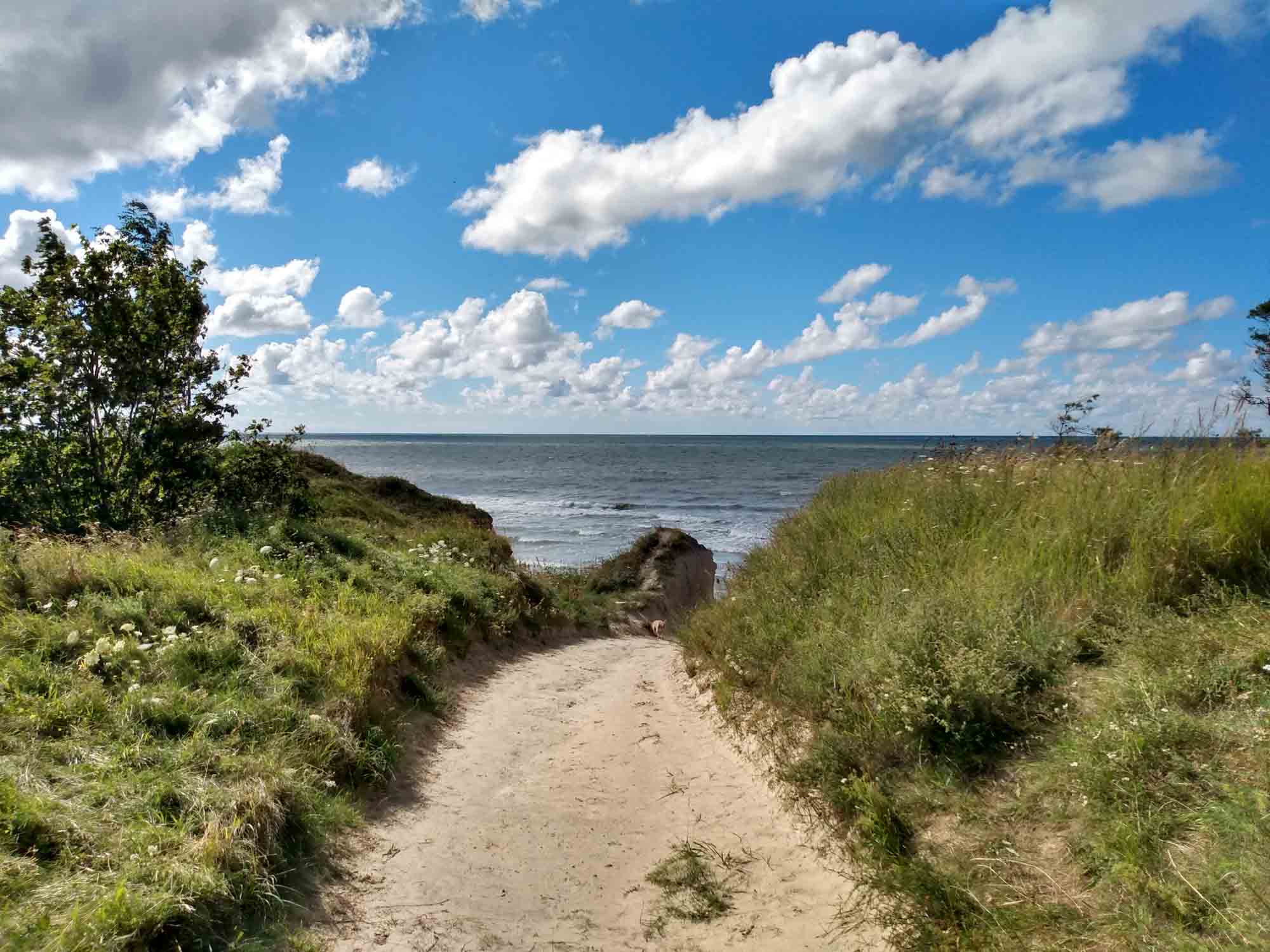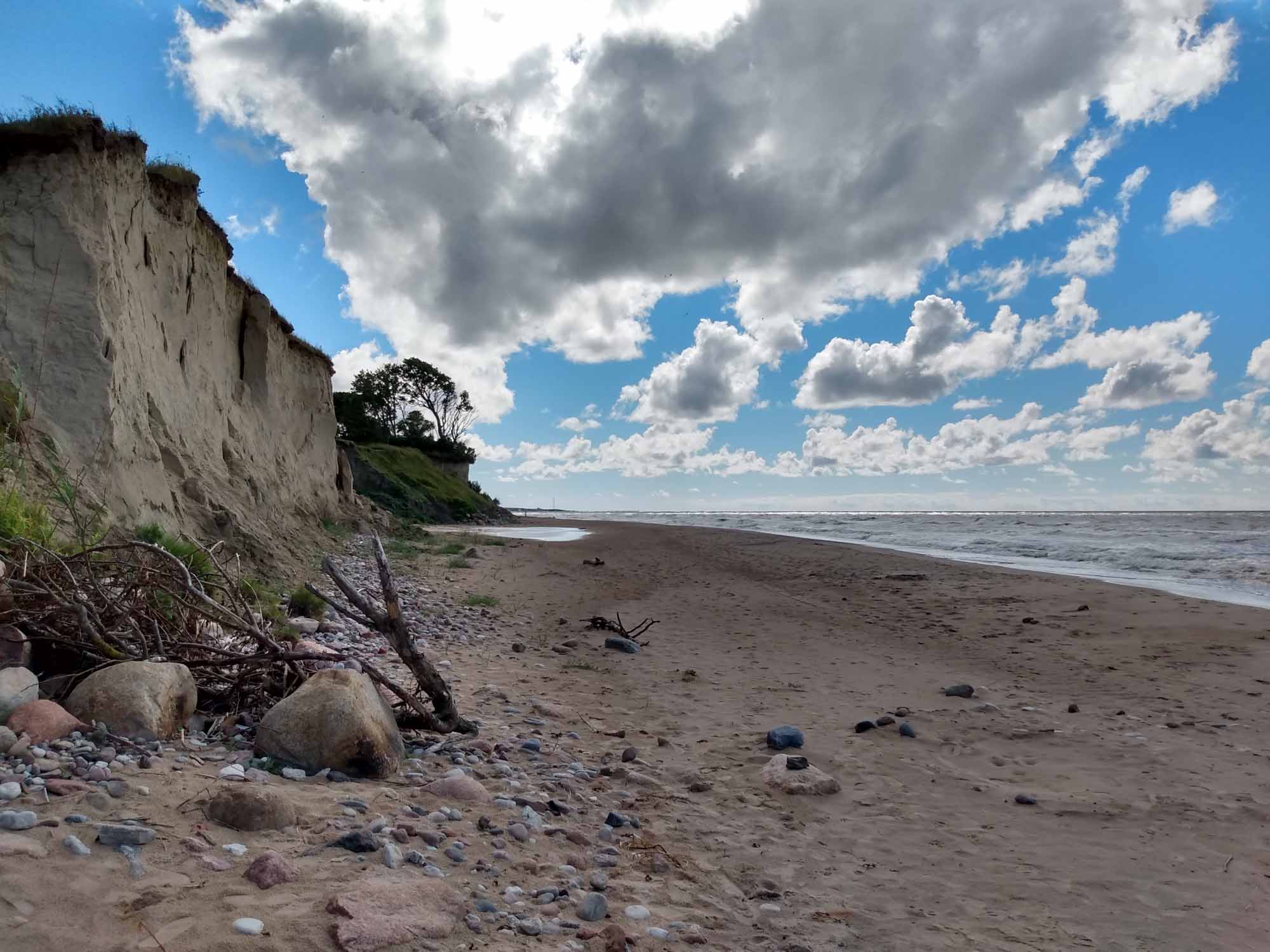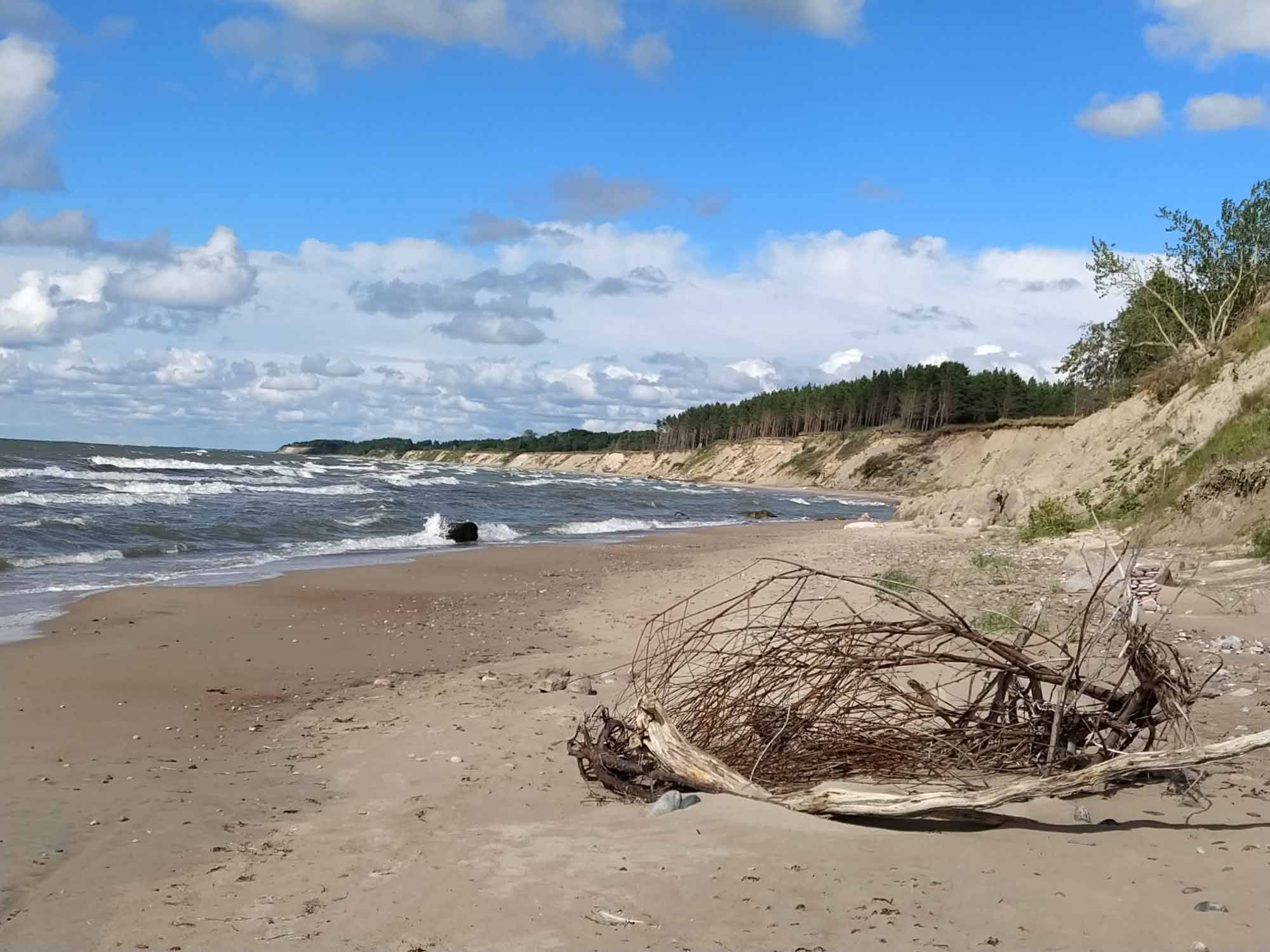 Der Tag fing gut an. Als wir aufstanden, um den ersten Spaziergang zu machen fing es kräftig an zu schütten. Zum Glück war es nur ein Schauer und eine viertel Stunde später konnten wir los. Die Regenpause hielt auch genau so lange durch, wie wir brauchten. Bereits beim anschließenden Frühstück machten wir uns so unsere Gedanken, was der viele Regen der letzten Tage wohl mit dem Boden unter unseren Reifen gemacht hatte. Aber als erstes wollten wir noch einen Drohnenflug zu den Wildpferden machen. Den Gedanken verwarfen wir dann aber schnell wieder, als wir sahen, dass der Ranger gerade angekommen war. Also kein Drohnenflug, schnell alles eingeräumt, eingestiegen und los gehts. Nicht. Jetzt hatten wir zumindest Gewissheit: Wir waren eingesackt und die Vorderräder fanden auf dem glitschigen Gras keinen Halt. Dies war jedoch vom Ranger nicht unbemerkt geblieben. Er ging zu seinem kleinen Jeep, fuhr vor uns, machte ein Abschleppseil fest und half uns so aus den vier kleinen Kuhlen, in denen unsere Reifen steckten. Den Rest schafften wir alleine. So lernten wir auch noch den Ranger kennen, der ursprünglich aus England kam und sich hier in die Landschaft und das Klima verliebt hatte. Es war ein sehr uriger Typ und es machte Spaß sich mit ihm zu unterhalten. Letztlich wollten wir aber doch los, bedankten und verabschieden uns herzlich und fuhren dann nach Liepãja. Zunächst zum Einkaufen und dann nach Karosta, der nördlich des Flusses gelegenen alten Sowjetstadt mit einem Sowjetgefängnis, das mit einer geführten Tour besichtigt werden kann. Danach schauten wir uns die russisch-orthodoxe Kirche an, die zwischen alten Häusern aus der Zarenzeit und Betonburgen aus der Sowjetzeit steht. Außen schimmern die Kuppeln golden. Aber von innen ist es nur ein einfacher nicht allzu hoher Raum, an dessen Wänden etliche Ikonen hingen. Eher schlicht und auch ein wenig düster. Die Haare mit einem Bauerntuch bedeckt kamen sowohl die Frauen zum Beten, war aber auch die Frau, die aufpasste, dass man auch ja keine Fotos machte. Draußen machten wir noch einen Flug mit der Drohne bevor wir weiter nach Pãvilosta fuhren, das für seine Fischräuchereien bekannt sein sollte. Wir fuhren durch den gesamten Ort und fanden dank eines eher unscheinbaren Schildes 300 m von der Hauptstraße entfernt tatsächlich eine Räucherei mit einem üppigen Angebot von frisch geräuchertem Fisch. Wir konnten uns kaum entscheiden, wählten dann jedoch Hering, Seehecht und Lachs. Eine sehr gute Wahl, wie wir sehr viel später beim Abendbrot feststellten. Kurz hinter Pãvilosta stellten wir unseren Wagen auf einem kleinen privaten Parkplatz ab und wanderten von dort aus an einem frisch gemähten Feld entlang bis zur Steilküste, die ca. 12 m bis zum Meer hin steil abfällt. Wie es der Zufall wollte, gab es genau hier einen Weg zum Strand hinunter und so konnten wir einen ausgiebigen Strandspaziergang unterhalb der Steilküste machen. Ein wunderschöner Anblick und das bei strahlendem Sonnenschein und natürlich einer kräftigen Briese. Auch Berta genoß den Strandspaziergang wie immer sehr. Danach fuhren wir noch etwa eine Stunde weiter, bis wir in der Nähe von Kuldiga mitten im Wald einen einsamen Stellplatz für die Nacht fanden. Dort ließen wir uns dann endlich den leckeren Fisch schmecken.