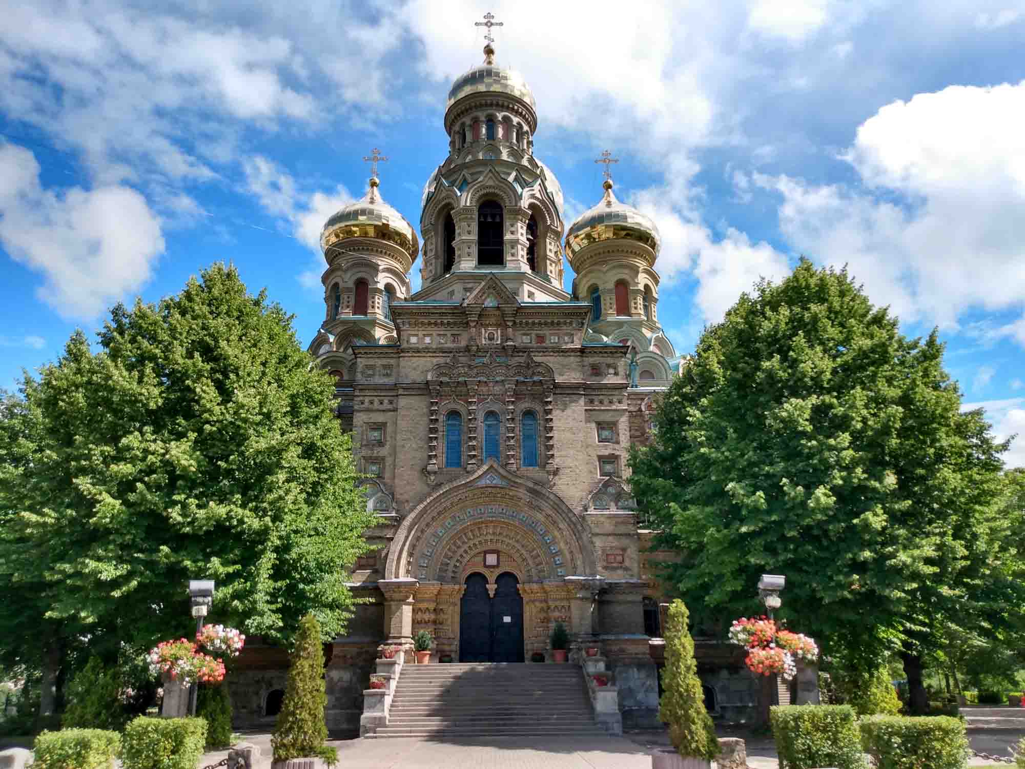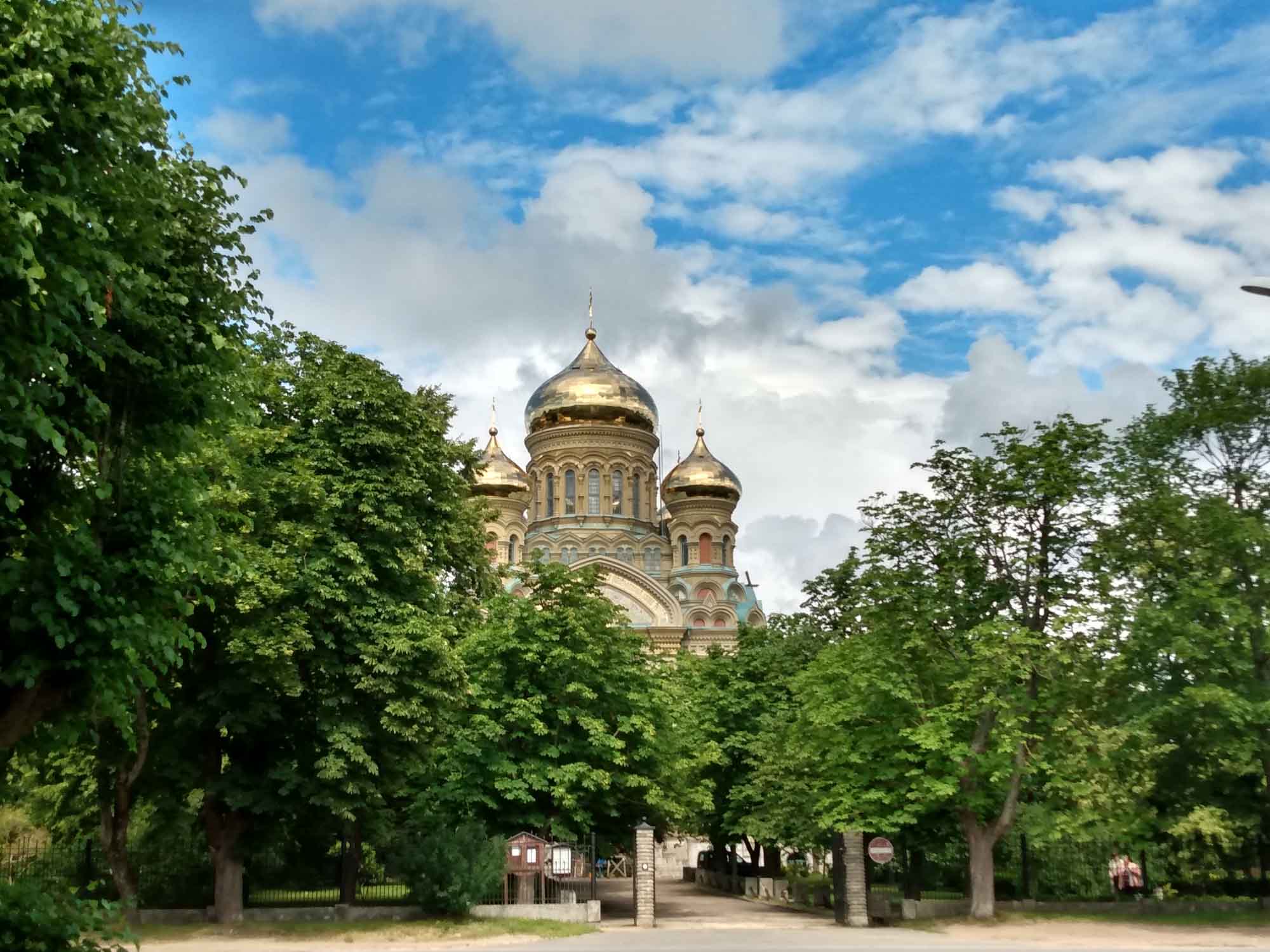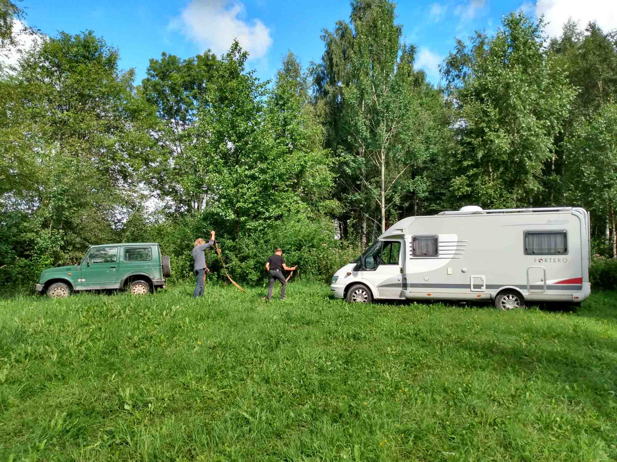 Der Tag fing gut an. Als wir aufstanden, um den ersten Spaziergang zu machen fing es kräftig an zu schütten. Zum Glück war es nur ein Schauer und eine viertel Stunde später konnten wir los. Die Regenpause hielt auch genau so lange durch, wie wir brauchten. Bereits beim anschließenden Frühstück machten wir uns so unsere Gedanken, was der viele Regen der letzten Tage wohl mit dem Boden unter unseren Reifen gemacht hatte. Aber als erstes wollten wir noch einen Drohnenflug zu den Wildpferden machen. Den Gedanken verwarfen wir dann aber schnell wieder, als wir sahen, dass der Ranger gerade angekommen war. Also kein Drohnenflug, schnell alles eingeräumt, eingestiegen und los gehts. Nicht. Jetzt hatten wir zumindest Gewissheit: Wir waren eingesackt und die Vorderräder fanden auf dem glitschigen Gras keinen Halt. Dies war jedoch vom Ranger nicht unbemerkt geblieben. Er ging zu seinem kleinen Jeep, fuhr vor uns, machte ein Abschleppseil fest und half uns so aus den vier kleinen Kuhlen, in denen unsere Reifen steckten. Den Rest schafften wir alleine. So lernten wir auch noch den Ranger kennen, der ursprünglich aus England kam und sich hier in die Landschaft und das Klima verliebt hatte. Es war ein sehr uriger Typ und es machte Spaß sich mit ihm zu unterhalten. Letztlich wollten wir aber doch los, bedankten und verabschieden uns herzlich und fuhren dann nach Liepãja. Zunächst zum Einkaufen und dann nach Karosta, der nördlich des Flusses gelegenen alten Sowjetstadt mit einem Sowjetgefängnis, das mit einer geführten Tour besichtigt werden kann. Danach schauten wir uns die russisch-orthodoxe Kirche an, die zwischen alten Häusern aus der Zarenzeit und Betonburgen aus der Sowjetzeit steht. Außen schimmern die Kuppeln golden. Aber von innen ist es nur ein einfacher nicht allzu hoher Raum, an dessen Wänden etliche Ikonen hingen. Eher schlicht und auch ein wenig düster. Die Haare mit einem Bauerntuch bedeckt kamen sowohl die Frauen zum Beten, war aber auch die Frau, die aufpasste, dass man auch ja keine Fotos machte. Draußen machten wir noch einen Flug mit der Drohne bevor wir weiter nach Pãvilosta fuhren, das für seine Fischräuchereien bekannt sein sollte. Wir fuhren durch den gesamten Ort und fanden dank eines eher unscheinbaren Schildes 300 m von der Hauptstraße entfernt tatsächlich eine Räucherei mit einem üppigen Angebot von frisch geräuchertem Fisch. Wir konnten uns kaum entscheiden, wählten dann jedoch Hering, Seehecht und Lachs. Eine sehr gute Wahl, wie wir sehr viel später beim Abendbrot feststellten. Kurz hinter Pãvilosta stellten wir unseren Wagen auf einem kleinen privaten Parkplatz ab und wanderten von dort aus an einem frisch gemähten Feld entlang bis zur Steilküste, die ca. 12 m bis zum Meer hin steil abfällt. Wie es der Zufall wollte, gab es genau hier einen Weg zum Strand hinunter und so konnten wir einen ausgiebigen Strandspaziergang unterhalb der Steilküste machen. Ein wunderschöner Anblick und das bei strahlendem Sonnenschein und natürlich einer kräftigen Briese. Auch Berta genoß den Strandspaziergang wie immer sehr. Danach fuhren wir noch etwa eine Stunde weiter, bis wir in der Nähe von Kuldiga mitten im Wald einen einsamen Stellplatz für die Nacht fanden. Dort ließen wir uns dann endlich den leckeren Fisch schmecken.