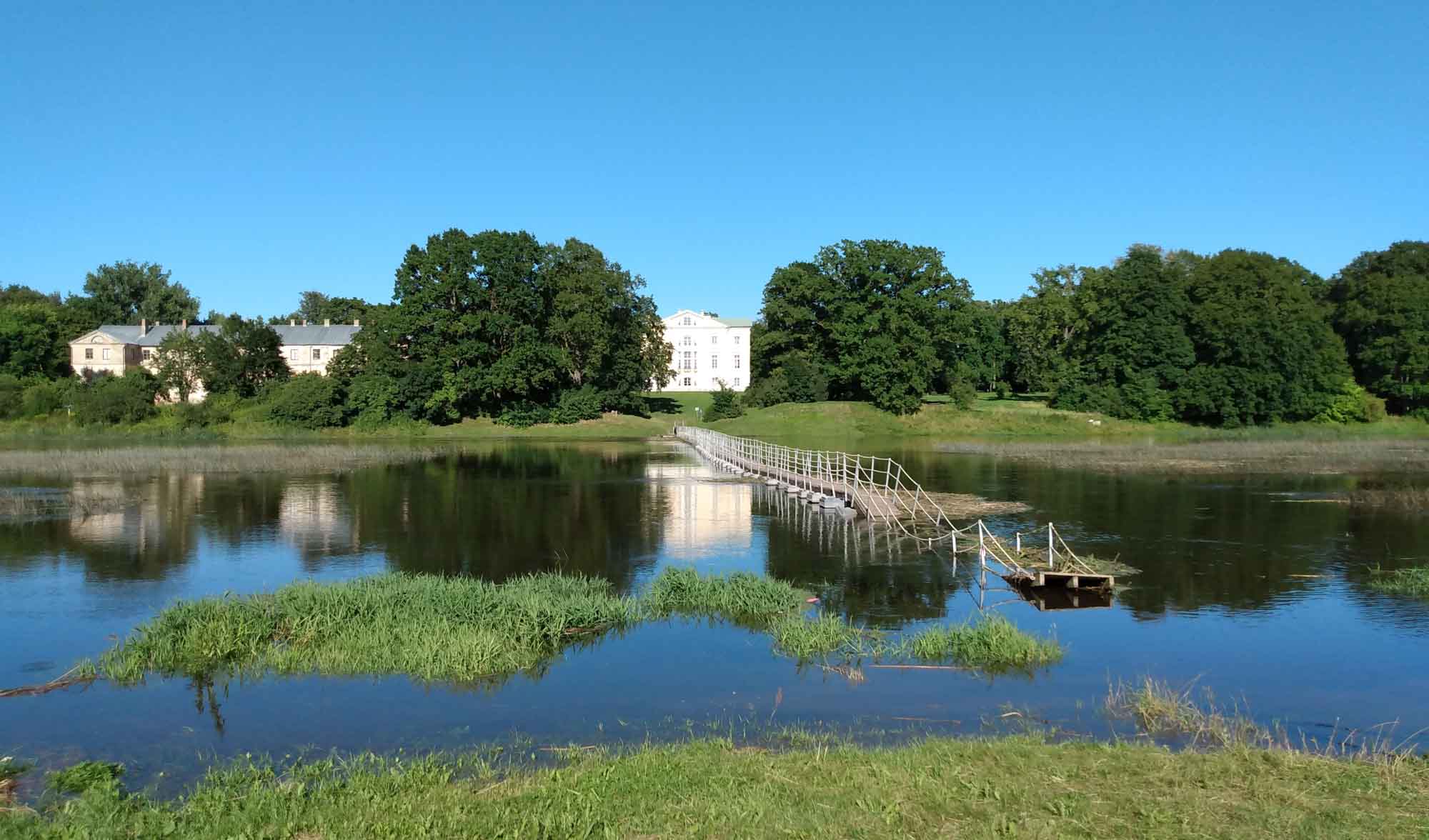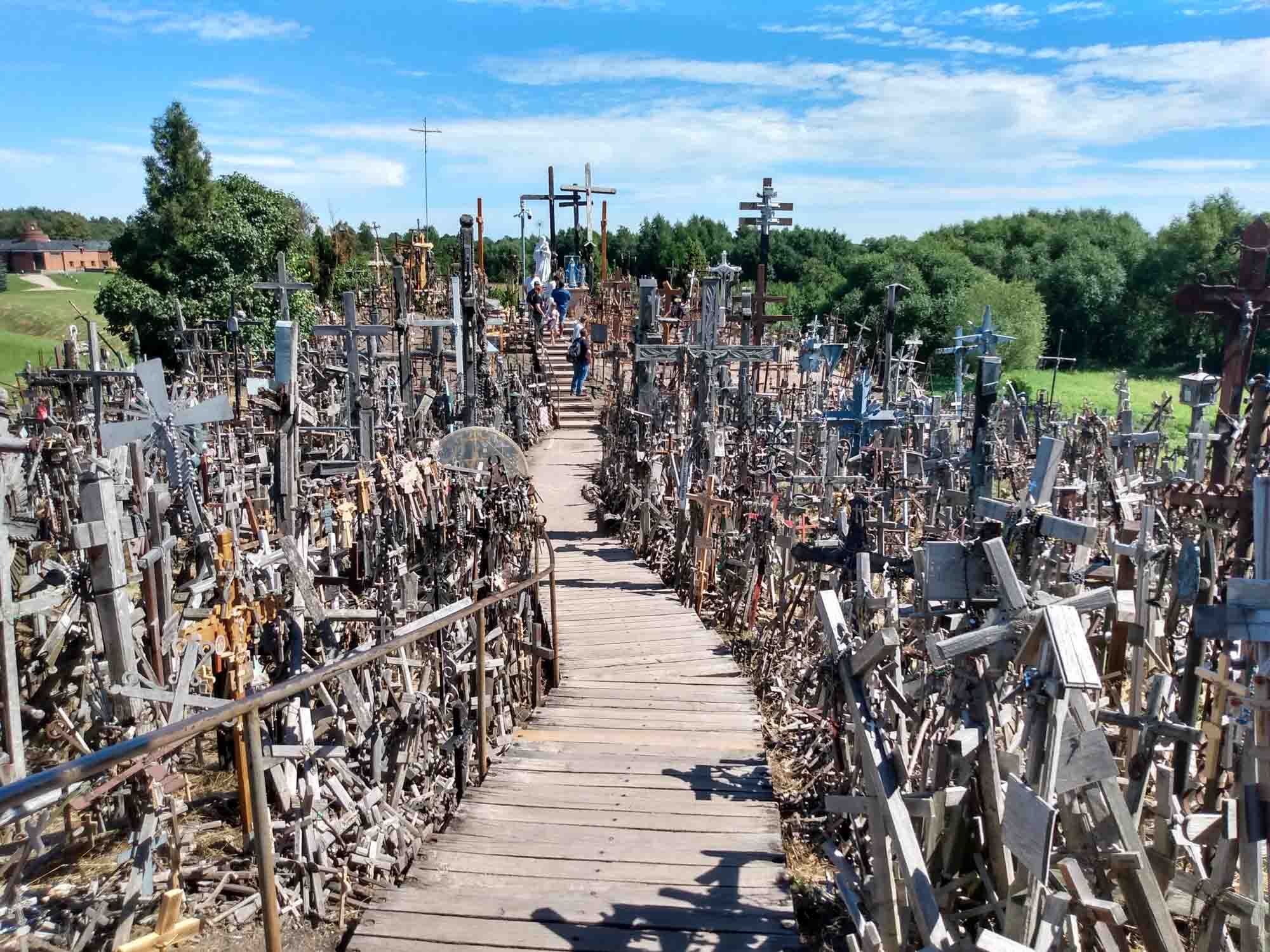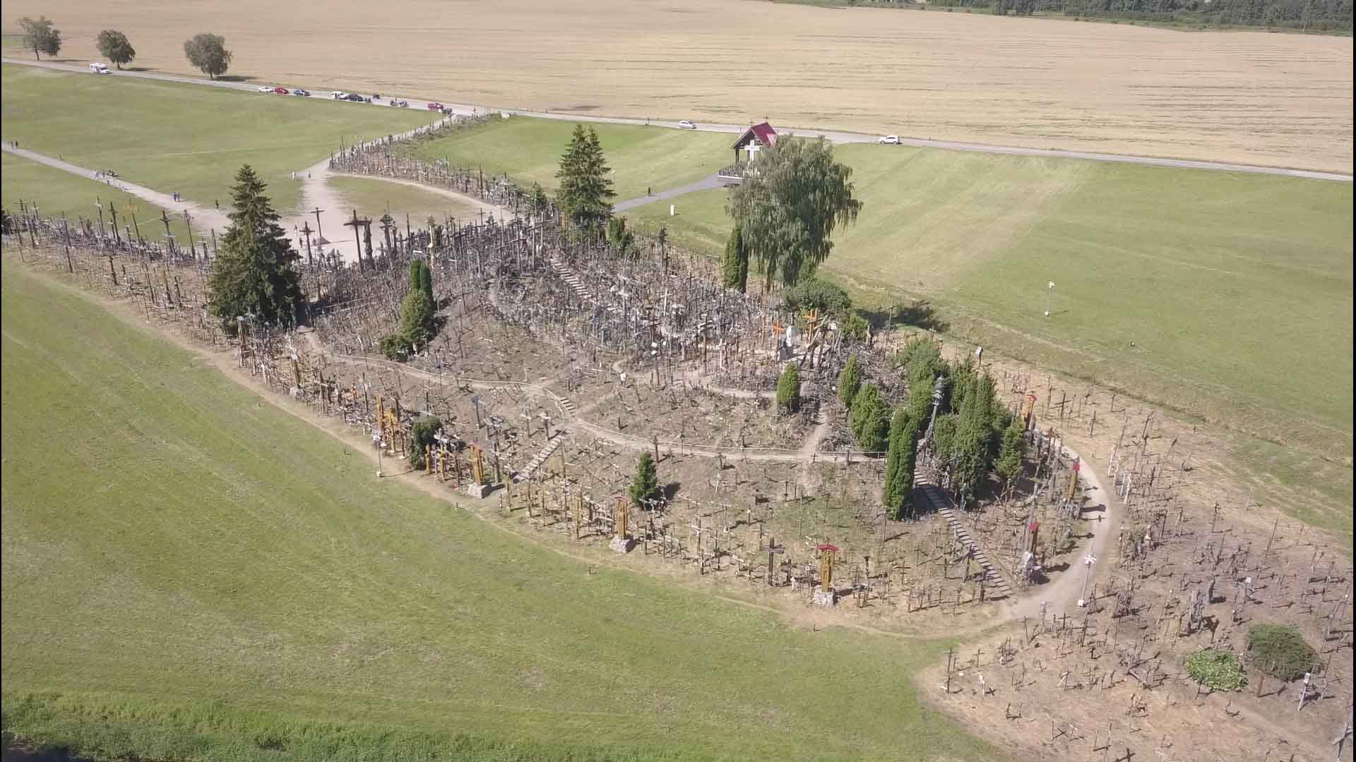 Die Nacht im Wald war herrlich ruhig und beim morgendlichen Spaziergang fanden wir sogar ein paar riesige Brombeeren, die eine perfekte Ergänzung zum Frühstück waren. Danach ging es weiter in Richtung Süden. Nach ca. 20 km überquerten wir die Grenze und waren wieder in Litauen. Ein halbe Stunde später erreichten wir bei Šiauliai den Berg der Kreuze. Mehr als 7000 Kreuze sind hier auf einem kleinen Hügel aufgestellt worden und täglich kommen weitere dazu. Nachdem wir den Hügel zunächst zu Fuß durchwandert haben, ließen wir es uns nicht nehmen, auch die Drohne noch einmal darüberfliegen zu lassen. Danach ging es wieder in Richtung Norden. Wir fuhren noch über die lettische Grenze nach Lettland zurück und fanden dann am Fluß Lielupe (den hatten wir schon einmal kurz vor Riga) einen Platz direkt am Wasser. Eine halb eingefallene Pontonbrücke führte auf die andere Seite, wo das Schloß Mesoten stand. Kurz vor Sonnenuntergang nutzten wir die goldene Stunde für einen letzten Drohnenflug über das Wasser und machten noch einen schönen Rundflug über die Schloßanlage. Danach warfen wir mal wieder unseren Grill an und legten Rippchen, Würstchen und Kräuterbutterbrötchen darauf.