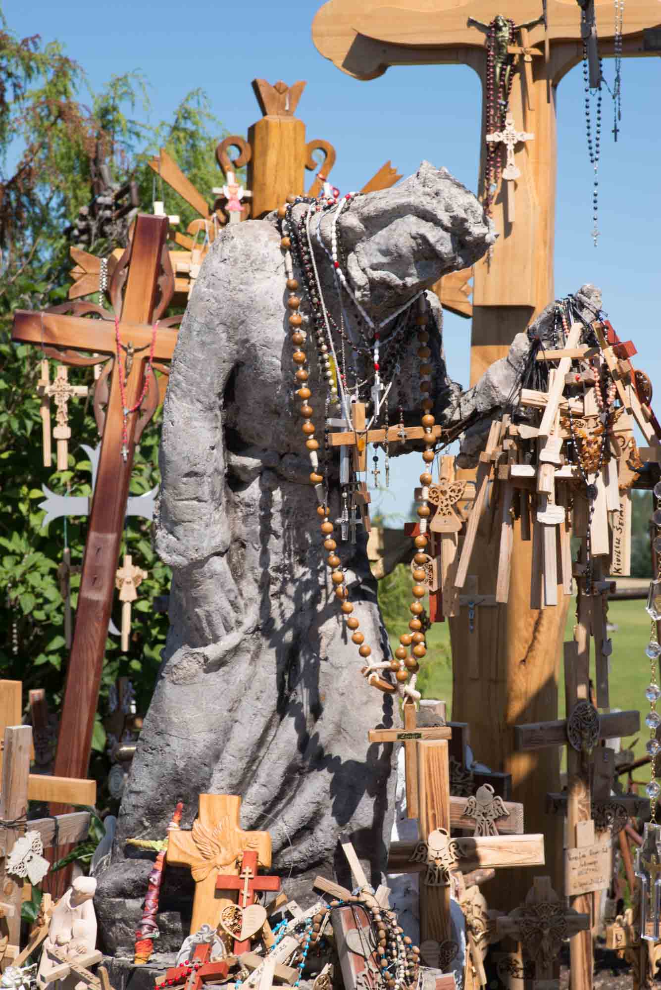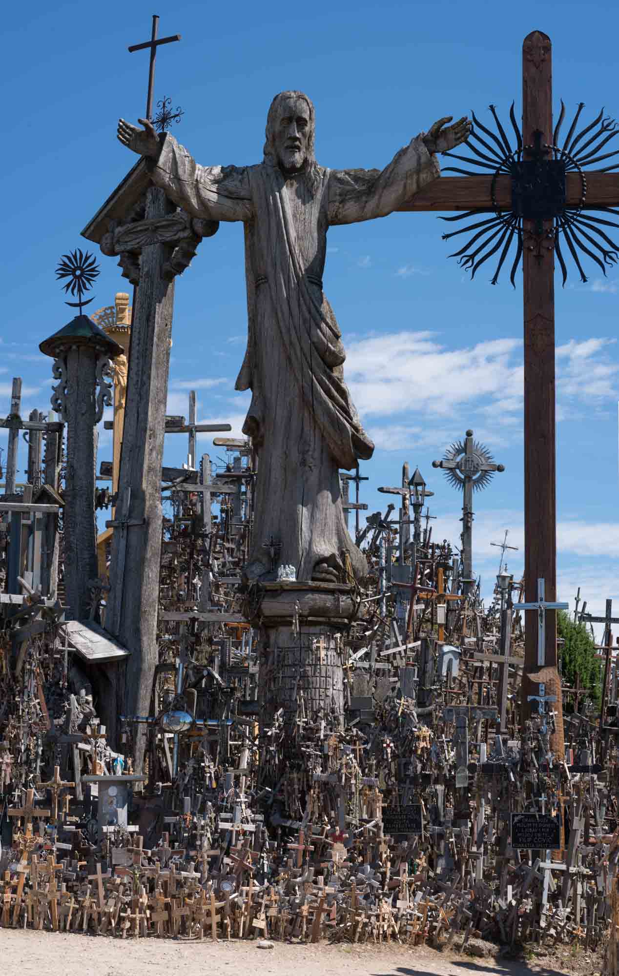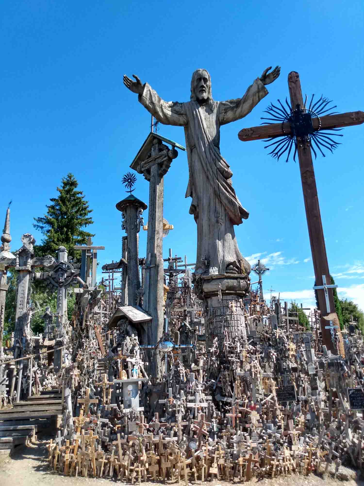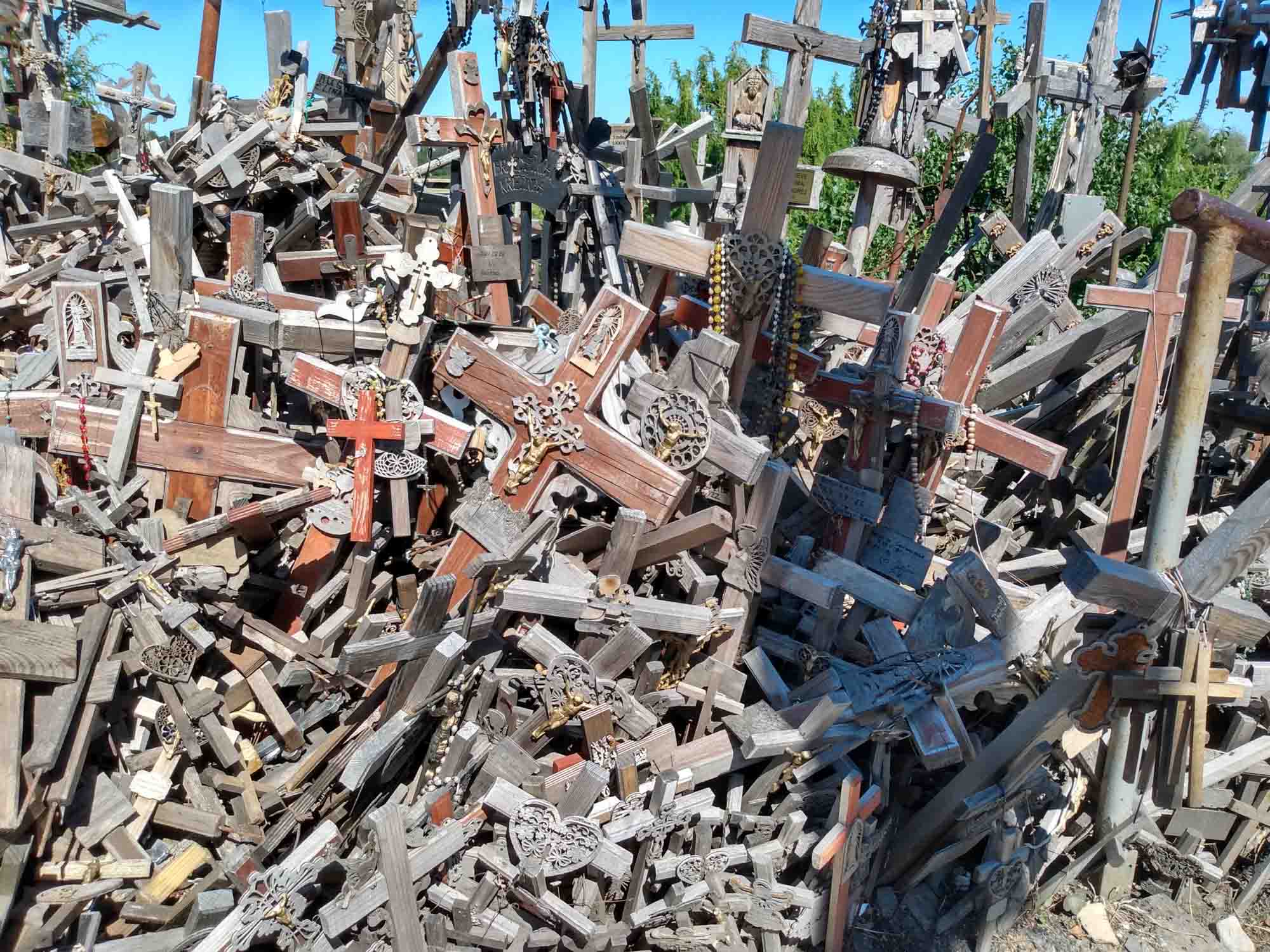 Die Nacht im Wald war herrlich ruhig und beim morgendlichen Spaziergang fanden wir sogar ein paar riesige Brombeeren, die eine perfekte Ergänzung zum Frühstück waren. Danach ging es weiter in Richtung Süden. Nach ca. 20 km überquerten wir die Grenze und waren wieder in Litauen. Ein halbe Stunde später erreichten wir bei Šiauliai den Berg der Kreuze. Mehr als 7000 Kreuze sind hier auf einem kleinen Hügel aufgestellt worden und täglich kommen weitere dazu. Nachdem wir den Hügel zunächst zu Fuß durchwandert haben, ließen wir es uns nicht nehmen, auch die Drohne noch einmal darüberfliegen zu lassen. Danach ging es wieder in Richtung Norden. Wir fuhren noch über die lettische Grenze nach Lettland zurück und fanden dann am Fluß Lielupe (den hatten wir schon einmal kurz vor Riga) einen Platz direkt am Wasser. Eine halb eingefallene Pontonbrücke führte auf die andere Seite, wo das Schloß Mesoten stand. Kurz vor Sonnenuntergang nutzten wir die goldene Stunde für einen letzten Drohnenflug über das Wasser und machten noch einen schönen Rundflug über die Schloßanlage. Danach warfen wir mal wieder unseren Grill an und legten Rippchen, Würstchen und Kräuterbutterbrötchen darauf.