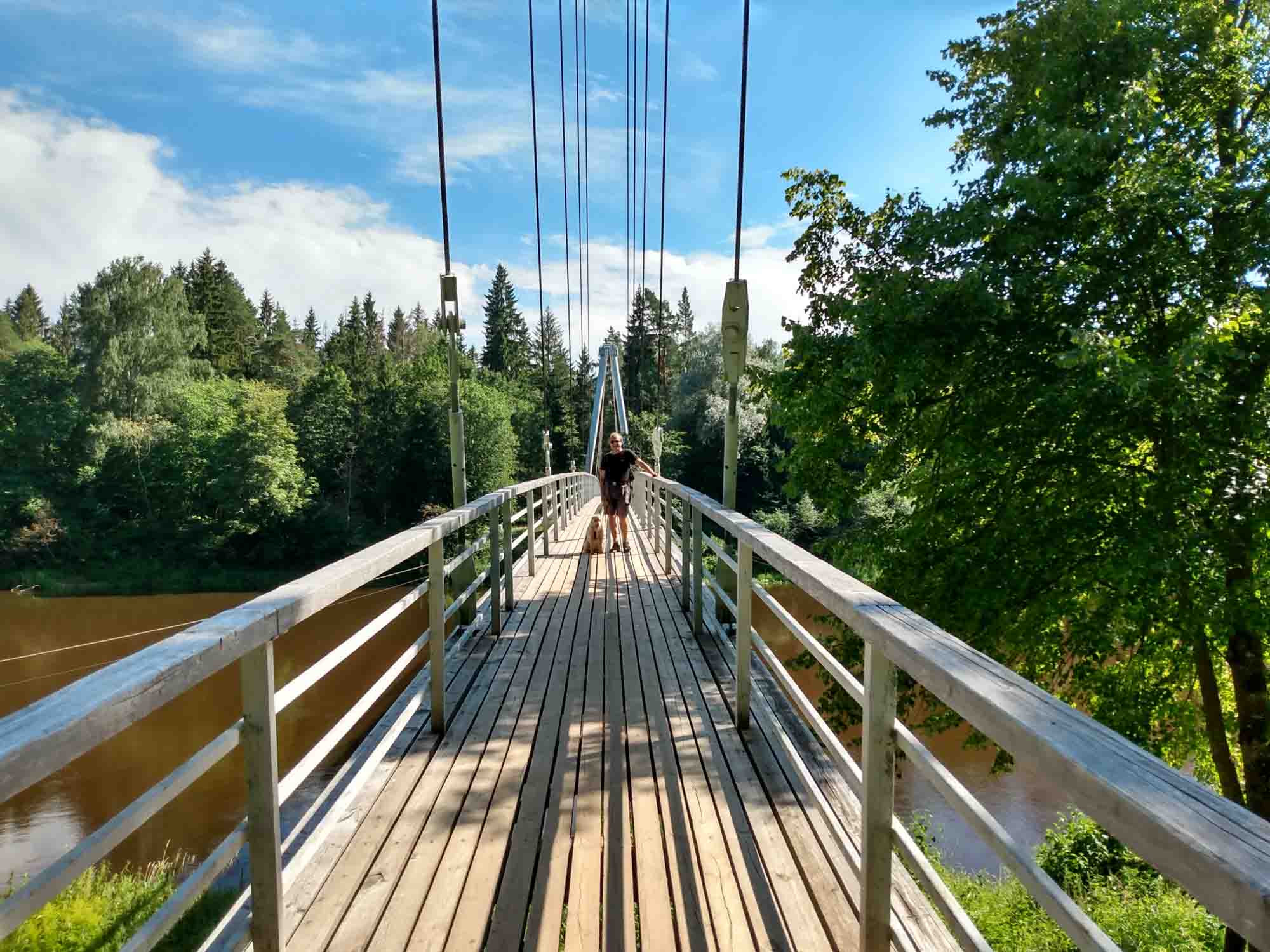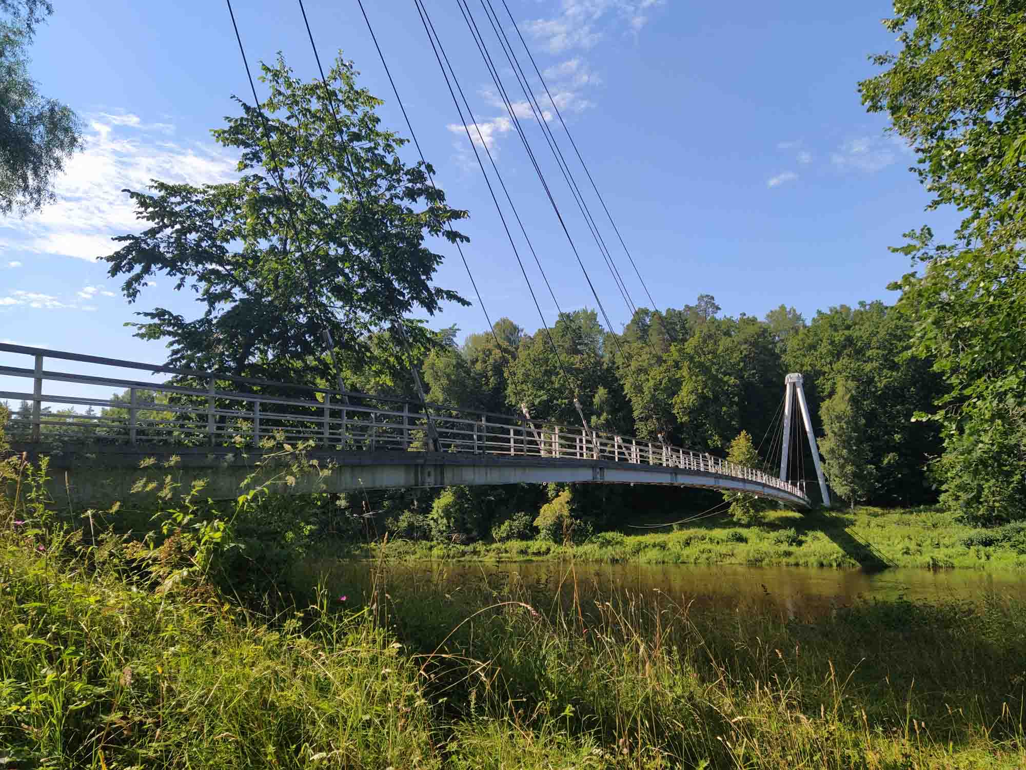 Wir hatten mal wieder eine schöne ruhige Nacht. Morgens gingen wir noch auf den Burghügel, wo jedoch nichts mehr von einer Burg übrig war. Von dort hatten wir aber noch einmal einen tollen Blick entlang des Flusses. Dann fuhren wir weiter nach Norden, an Riga vorbei zum Gauja Nationalpark. Beim "Info-Center" fanden wir immerhin eine Karte, die wir fotographieren konnten. Ansonsten von Info keine Spur. Das machte aber nichts, da wir sowieso einen Stellplatz an der Teufelshöhle ausgesucht hatten. Und dieser erwies sich als perfekt. Mitten im Wald gelegen, menschenleer und dort begannen zahlreiche Wanderrouten, von denen wir gleich den zur Klippe und zur Teufelshöhle ausprobierten. Unterwegs überquerten wir die Gauja auf einer stählernen Hängebrücke aus dem Jahr 1979. Sehr vertrauenserweckend sah sie nicht mehr aus und auch Berta ging vorsichtig über die schwankende Brücke, durch deren Bodenbretter man sehr schön den Fluß sehen konnte. Von der gegenüberliegenden Flußseite konnte man sehr gut die roten Klippen und die Teufelshöhle sehen. Noch besser war es natürlich mit der Drohne, die wir für die Wanderung eingepackt hatten. Wieder zurück machten wir es uns gemütlich und ließen den wunderbar warmen und sonnigen Tag im Schatten des Waldparkplatzes ausklingen.