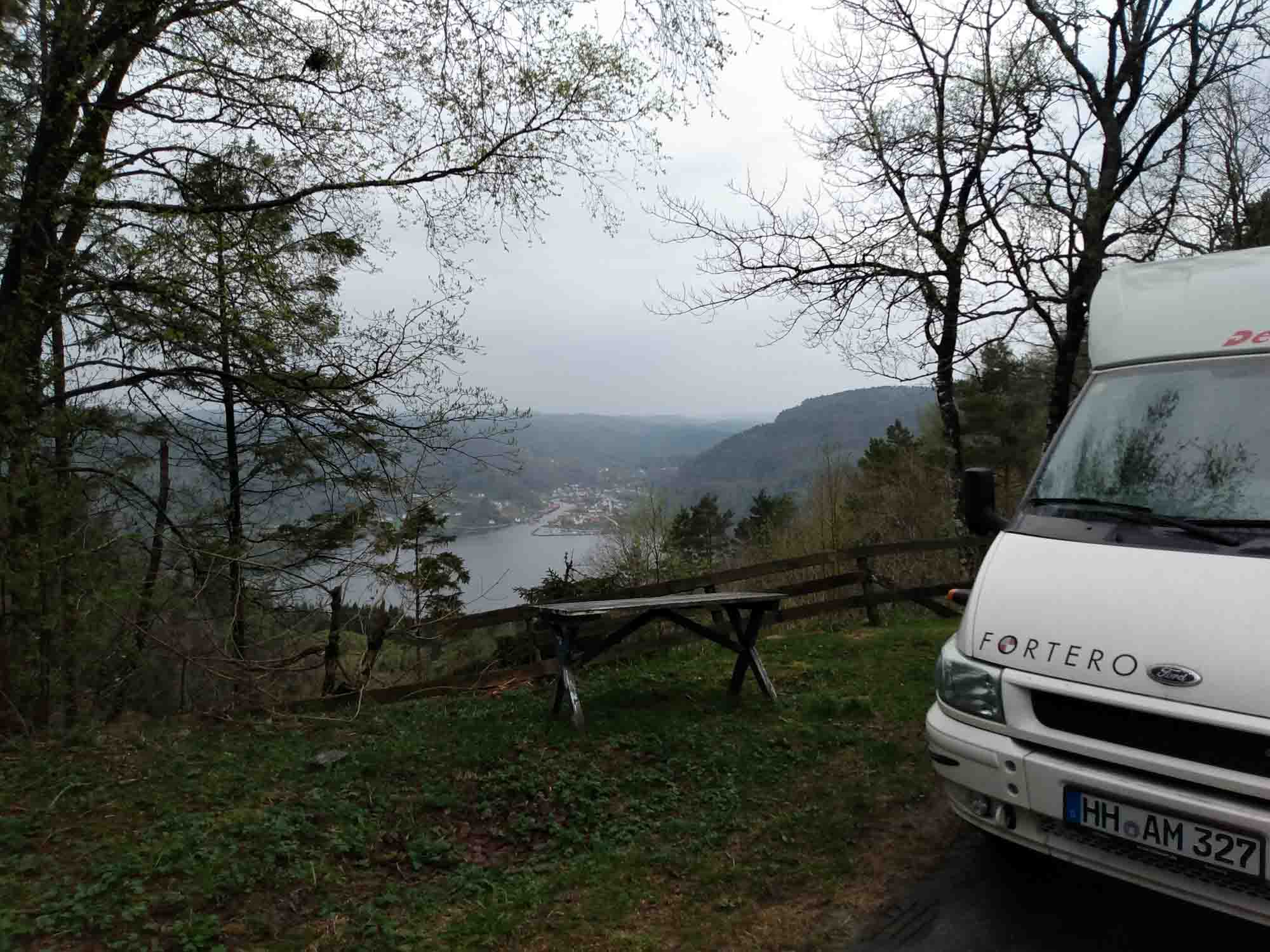 Auch in der Nacht hatte der Regen nicht aufgehört. So standen wir unüblich früh auf, was ganz praktisch war, denn so waren wir bereits angezogen, als uns die nette Dame vom Museum um kurz nach 9 Uhr freundlich bat etwas weiter vorzufahren, da gegen 10 Uhr zwei Busse ankommen würden. So war noch Zeit für unseren Morgenspaziergang. Der Regen machte extra dafür eine kleine Pause, setzte dann aber erwartungsgemäß wieder ein, als wir losfuhren. Es ging zum südlichsten Punkt Norwegens, dem Leuchtturm bei Lindesnes. Trotz des Regens erkletterten wir die Granitfelsen dieser rustikalen Landschaft, verzichteten dann aber auf eine längere Wanderung über die Felsen und fuhren über Lyngdal nach Liknes um erneut unser Glück beim Gastanken zu versuchen. Kurz bevor wir Liknes erreichten knallte es kräftig von vorne gegen unserer Auto. Wir hatten nur schemenhaft etwas auf uns zufliegen sehen. Was war passiert? Wir hielten kurze Zeit später und begutachteten den Schaden. Eine tiefe Delle war in unserer Motorhaube und noch eine kleine Schramme in der Verkleidung oberhalb der Windschutzscheibe. Es muss ein ziemlich großer Stein gewesen sein, den der entgegenkommende LKW hochgeschleudert hatte. Zum Glück hat er nicht die Windschutzscheibe getroffen. Ein solches Geschoß wäre möglicherweise glatt durchgegangen und was dann passiert wäre, wollten wir uns nicht einmal ausmalen. Noch einmal Glück gehabt. Wir nutzten die Pause zu einem kleinen Spaziergang um den See herum, an dem wir gerade standen und fuhren dann weiter nach Liknes zur Gastankstelle. Diesmal war das Gerät scheinbar intakt und nahm die Kreditkarte an. Als es dann aber darum ging, Gas in unsere Flasche zu pumpen, versagte das Gerät kläglich. So langsam wird es eng. Aber für eine Nacht sollte das Gas noch reichen. Wir fuhren weiter und eine halbe Stunde später erreichten wir unseren Übernachtungsplatz mit einem herrlichen Blick über den Fjord Indrevika.