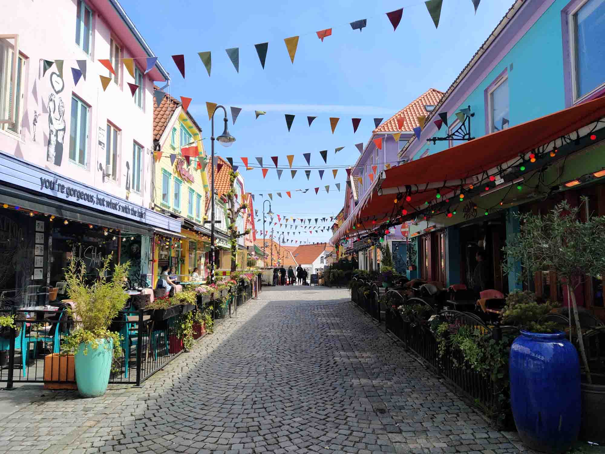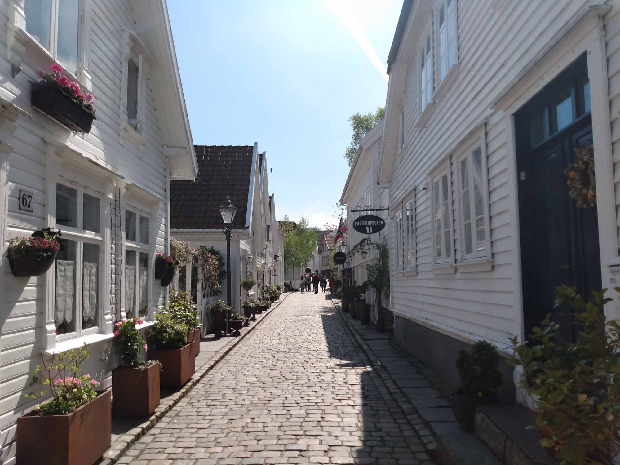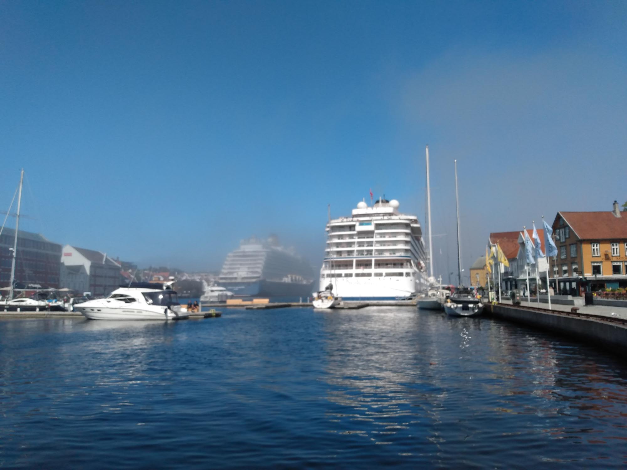 Endlich schien auch morgens wieder die Sonne. Wieder einmal perfekt für eine Stadtbesichtigung. Diesmal war es Starvanger, das auf uns wartete. Wir parkten unser Wohnmobil passend am Yachthafen und bewunderten die vielen dort liegenden Motorboote. Dann liefen wir zunächst zum kleinen Hafen, in dem zwei Kreuzfahrtschiffe lagen. Auf der linken Seite waren die kleinen weißen Häuser der Altstadt, durch die sich zwei kleine Gassen zogen. Vor dem Ölboom der 1970er Jahre und zwei kleineren Booms aufgrund des Heringsfangs war der Ort völlig unbedeutend und es lebten nur etwa 500 Menschen hier. Der Fischfang brachte jedoch die erste Größe und es entstand sogar ein Dom. Besichtigen konnten wir die Kirche jedoch nicht. Die Bauarbeiten werden erst im Jahr 2025 abgeschlossen werden. Auch die Ostseite des Hafens war recht hübsch. Bunte Häuser in kleinen verwinkelten Gassen und ein kleiner Berg mit einem Turm darauf. Etwas merkwürdig mutete eher die entstehende neue City an. Neben einem großen Hotel entstehen etliche moderne Hochhäuser als Bürogebäude und dazwischen stehen immer wieder kleine alte weißgestrichene Holzhäuser. Wir gingen wieder zum Auto zurück und fuhren durch einen 14 km langen Tunnel 300 m unter dem Meeresspiegel nach Tau und von dort weiter zu einem kleinen Kiesparkplatz in den Bergen oberhalb von Jørpeland. Dort genossen wir dann die Wärme der Sonne, die an diesem Tag noch bis halb zehn weiter schien, bevor sie sich hinter den Bergen versteckte.