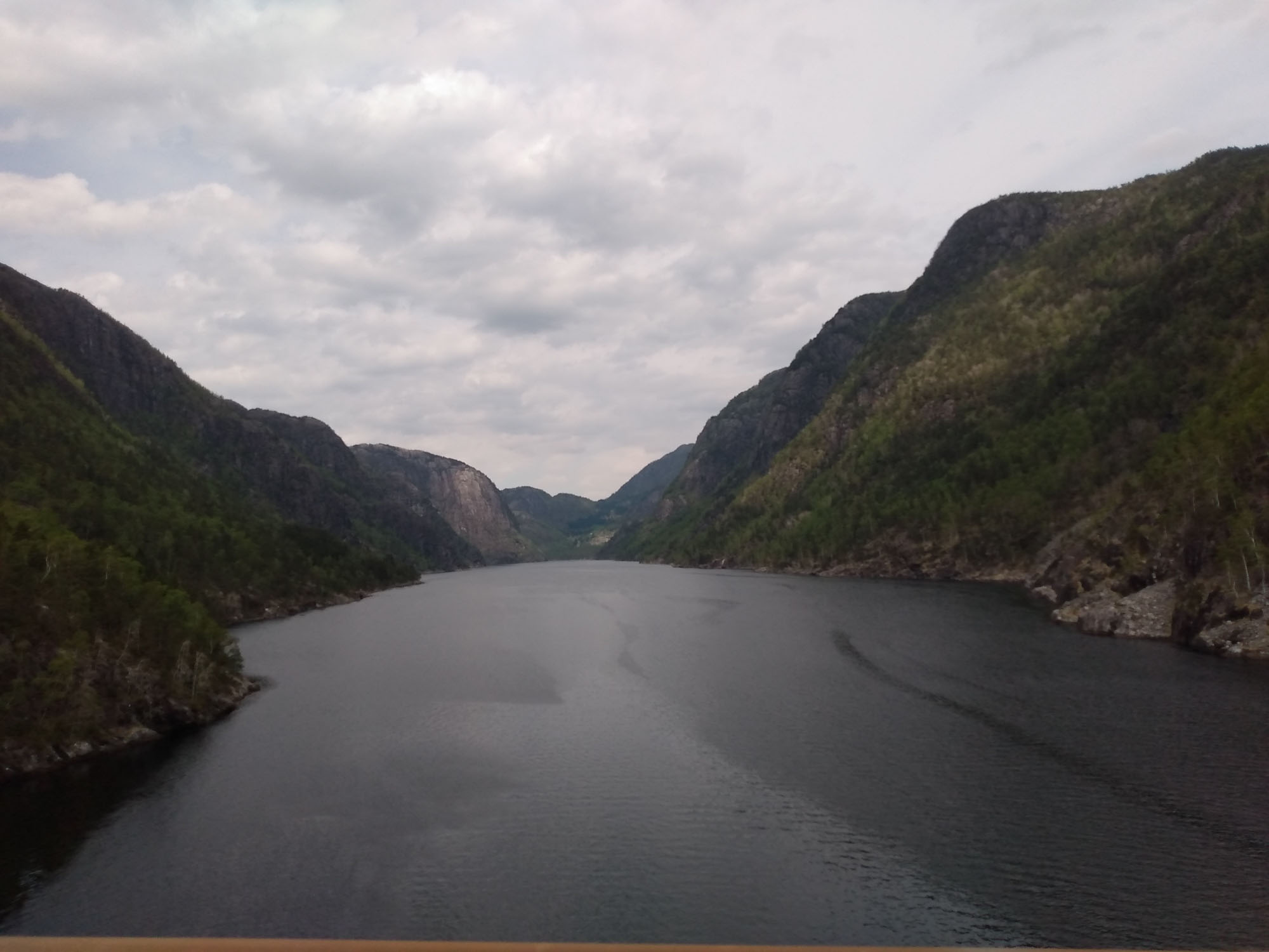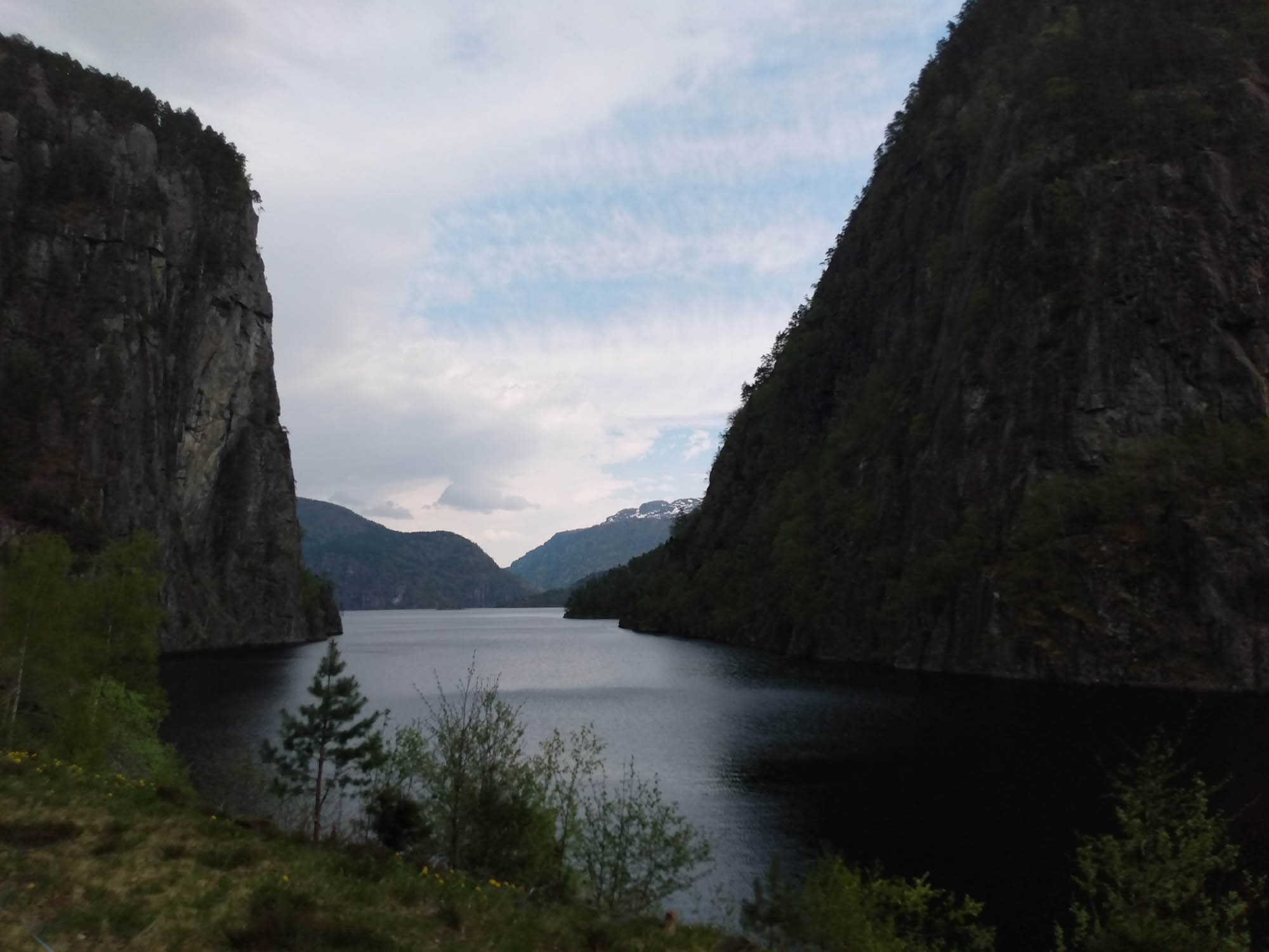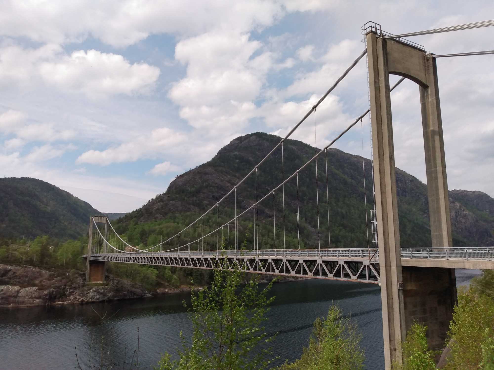Nachdem wir ausgeschlafen, einen Spaziergang gemacht und gefrühstückt hatten, fuhren wir der Landschaftsroute Ryfylke folgend auf der N13 in Richtung Norden. Hier wechselten sich Kulturlandschaft, Fjorde und Berge ab. Von Hjelmeland nach Nesvik nahmen wir die Fähre, die gerade auf uns gewartet hatte. Kaum waren wir auf der Fähre, schlossen sich hinter uns die Tore und es ging los. Völlig geräuschlos und ohne jede Vibration brachte sie uns von Brennstoffzellen angetrieben in 13 Minuten über den Boknafjorden. Wir folgten weiter der N13 am Fjord entlang. Weiter ging es über Erfjord und Sand zur Suldalsporten, wo sich ein kleiner See zwischen zwei Bergen hindurchzuzwängen scheint. Kurz danach fanden wir bei Solheimsvik ein hübsches Plätzchen direkt am Wasser, wo wir uns neben ein weiteres Wohnmobil aus Deutschland stellten. Hier machten wir es uns gemütlich, spielten und bereiteten unser Abendessen zu. Schade nur, dass sich dann ein weiteres Wohnmobil direkt dazwischen quetschen musste. Es blieb aber noch Platz für ein Handtuch, auf dem Berta ihr Abendessen bekam. Zu blöd nur, dass die Dazwischenquetscher auch einen Hund hatten und zudem noch direkt bei Berta anhielten, um sich darüber lustig zu machen, wie sie sichtlich aufgeregt ihr Essen verteidigte. Aufessen durfte sie dann ungestört im Wohnmobil. Nachdem auch wir gegessen hatten, entschieden wir uns, einen anderen Schlafplatz aufzusuchen und fuhren ein Stück die Straße zurück, die wir gekommen waren und dann in die Berge. Nach 12 km fanden wir einen asphaltierten Platz neben der kleinen Straße, an dem sogar ein Müllcontainer stand. Hier waren wir wieder alleine und ungestört. In der Nacht haben wir sehr schlecht geschlafen. Uns machte beiden der Magen Probleme. So blieben wir auch am nächsten Tag an diesem Platz, um uns ein wenig zu erholen.