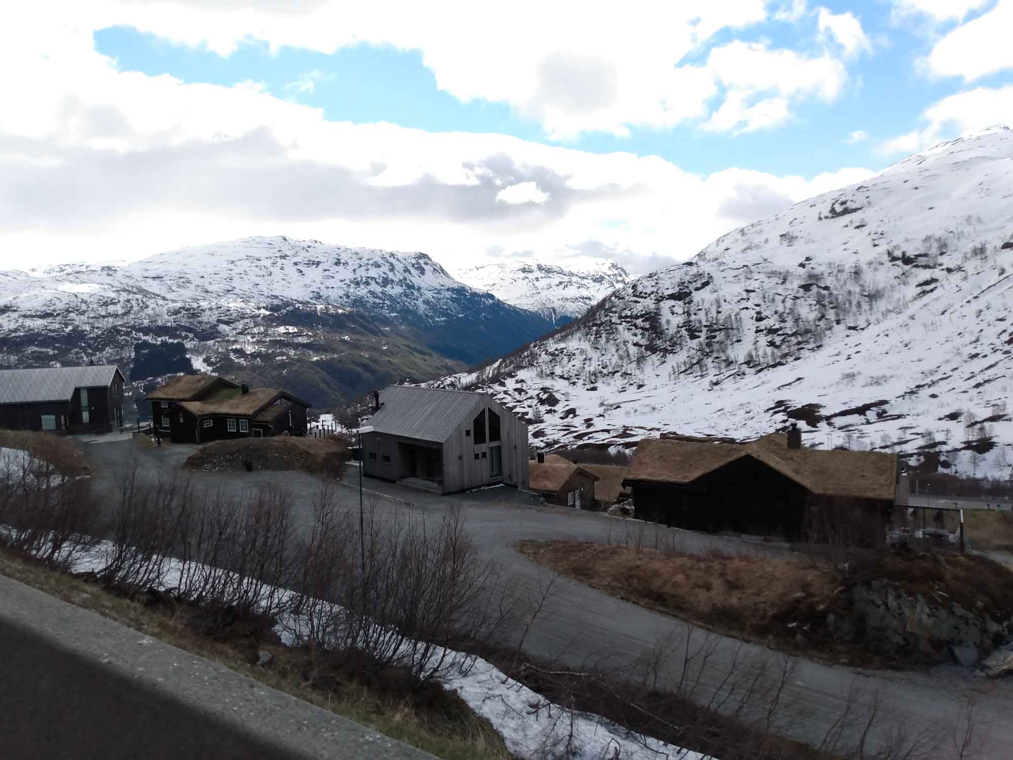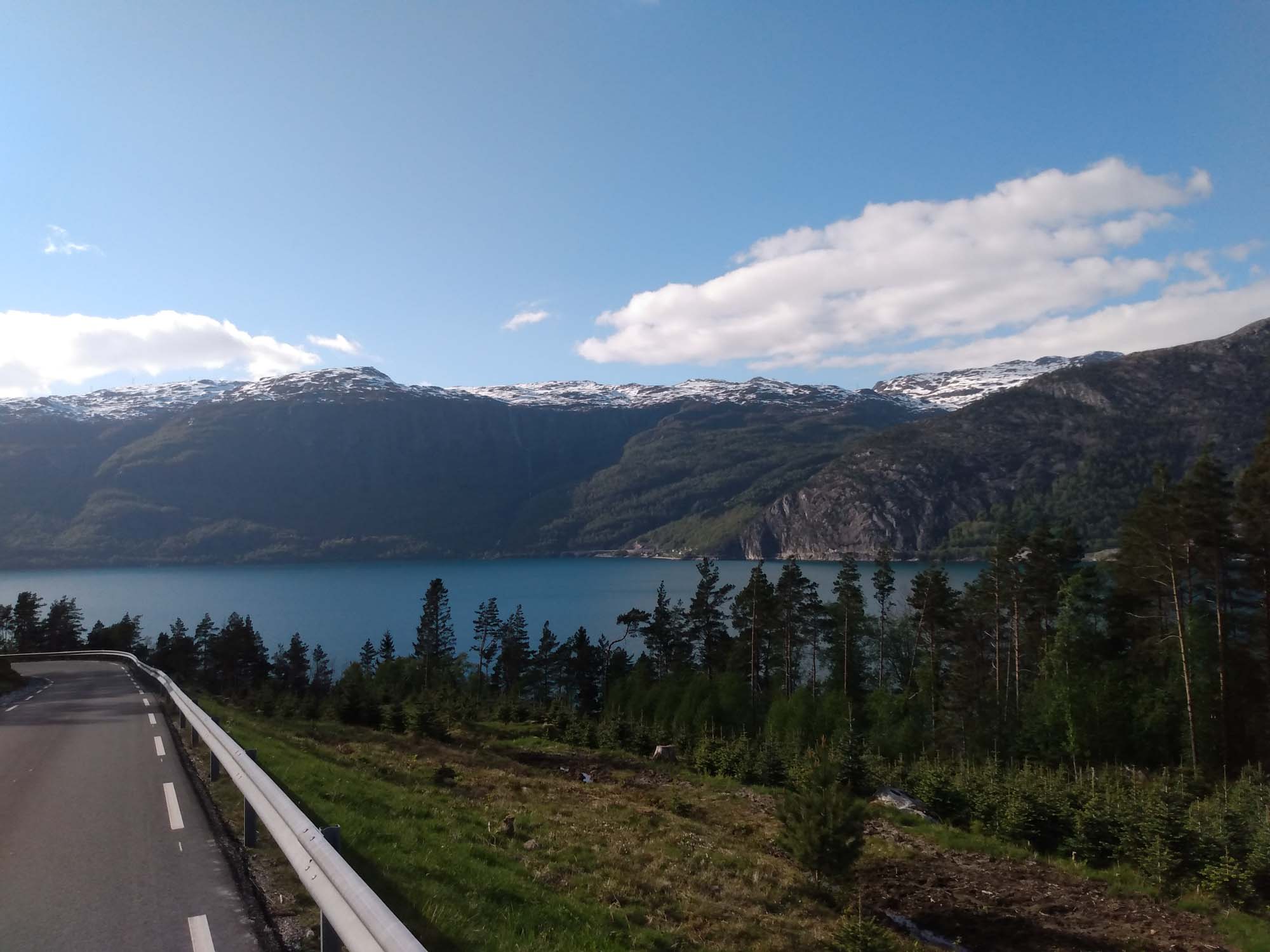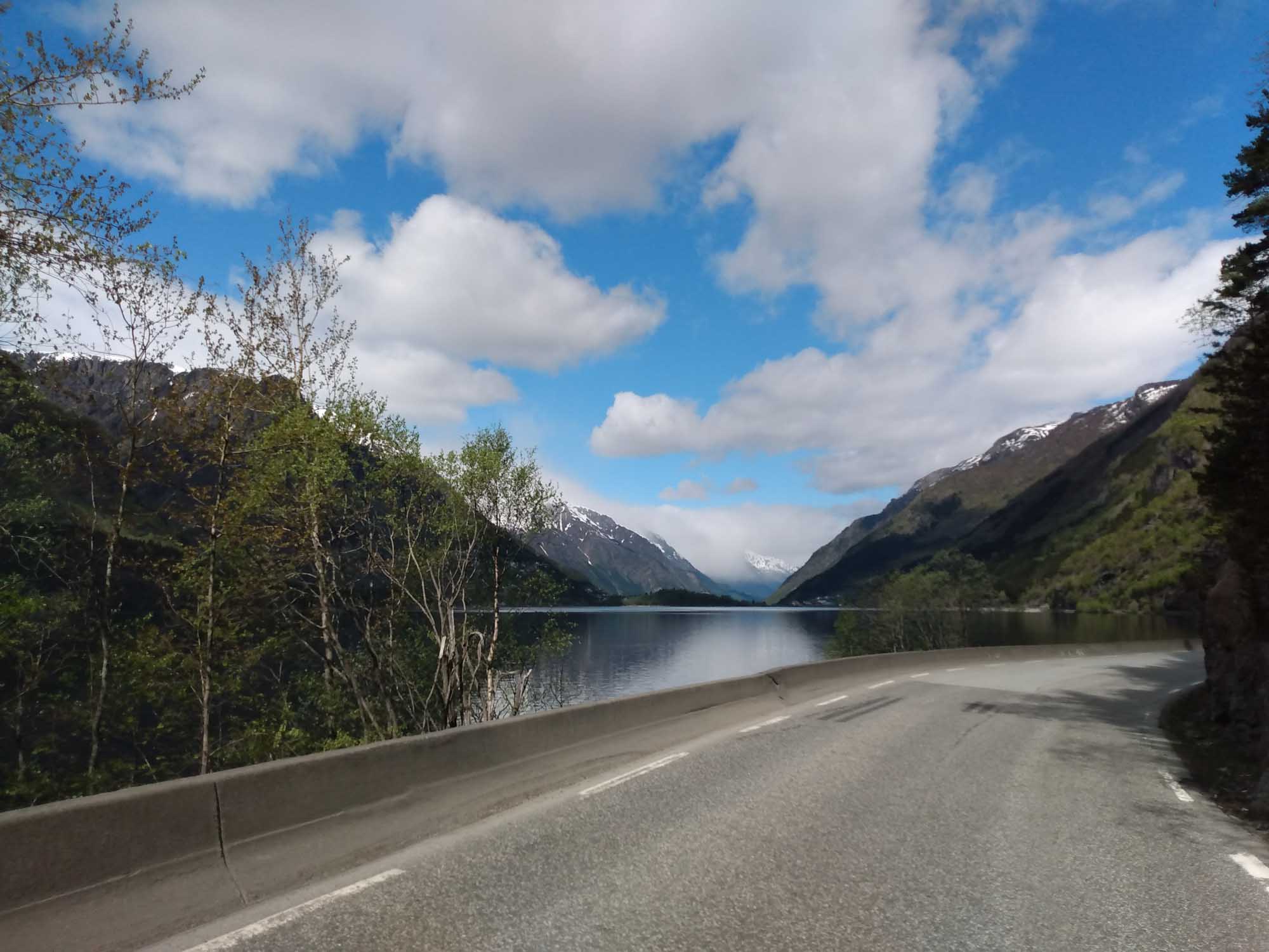 Die Sonne lachte mal wieder. Nachdem wir Berta noch einmal eine Runde über den Platz am Wasser geführt und gefrühstückt haben, fuhren wir weiter der Landschaftsroute Ryfylke folgend bis zum See Raldalsvatnet. Diesen bekamen wir nur kurz zu sehen, weil die Straße entlang des Sees die meiste Zeit durch einen Tunnel führte. Danach folgten wir der E13 nach Nordwesten und kamen immer höher, bis wir uns plötzlich mittem im Schnee in einem Skigebiet wiederfanden. Die Saison war vorbei und die Lifte standen. Aber es wäre immer noch reichlich Schnee für eine Abfahrt da gewesen. Danach ging es schnell wieder abwärts. Am Wasserfall Låtefossen machten wir einen Halt für Fotos und einen Drohnenflug. Das Tal war sehr eng und der Wasserfall ziemlich hoch. Kein Wunder, dass der kleine Parkplatz direkt an der Straße lag. Wir fuhren weiter und erreichten bei Odda einen Seitenarm des Hardangerfjords. Da heute Nationalfeiertag war, scheiterte der Versuch eines Einkaufs kläglich. Alles aber auch wirklich alles war geschlossen. Stattdessen sahen wir viele Norweger, die in Nationaltracht herumliefen. Sie versammelten sich an verschiedenen Plätzen in dem kleinen Ort, um dem Festumzug zuzusehen. Auch wir mussten einen Moment anhalten, um den Musikern und dem nachfolgenden Tross zuzusehen. Danach folgten wir dem Wasser bis nach Kirsavik. Hier fuhren wir ein kleines Stück in das Landesinnere und wanderten von dort zum nächsten Wasserfall, dem Tveitafossen. Wir hätten auch noch 3 weitere Wasserfälle erwandern können, aber das war uns denn doch zu weit. Anschließend ging es mit der Fähre nach Utne, einem kleinen sehr hübschen weißen Dorf, das wir uns aber lediglich im Vorbeifahren ansahen. Weiter ging es jetzt am Hardangerfjord entlang auf einer kleinen einspurigen Straße bis kurz hinter Jondal, wo wir morgen die Fähre nehmen würden. Den Stellplatz, den wir uns ausgesucht hatten, erreichten wir leider nicht. 150 m vor dem Parkplatz war ein Schild, dass auf eine private Mautstraße hinwies. Bezahlen konnte man nur mit Bargeld. Und das hatten wir nicht, da in Norwegen ansonsten alles mit Karte bezahlt wird. Aber es fand es sich ein Parkplatz entlang der wenig befahrenen Straße, der uns für eine Nacht völlig genügte.