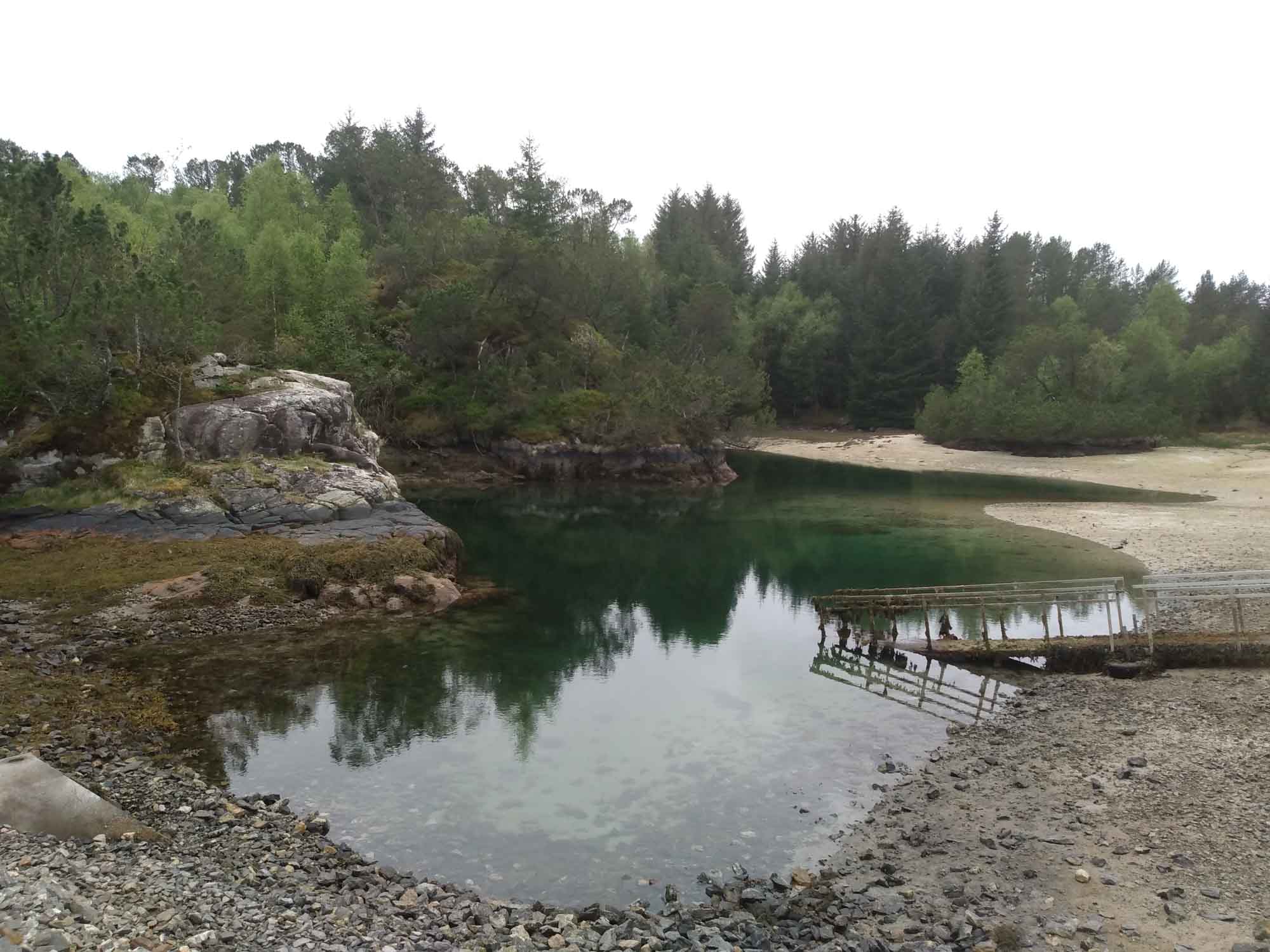 Der Spaziergang führte uns heute ein Stück die Straße entlang, an der wir standen. Es gab schlicht keine Wege irgendwohin. Dann fuhren wir nach Jondal und nahmen die Fähre nach Tørvykbygd. In Norheimsund verließen wir die Landschaftsroute Hardanger nach Westen und machten noch einen Halt am Steindalsfossen, einem Wasserfall unter dem man hindurchgehen kann. Danach ging es durch die malerische Landschaft Vestlands, südlich an Bergen vorbei über eine große Brücke nach Askøy, einer Bergen vorgelagerten Insel. Dort fanden wir einen großen Parkplatz, von dem aus man zu mehreren Badestellen gehen konnte und stellten uns an die hinterste Ecke. Dann machten wir noch einen kleinen Spaziergang zu einer der Badestellen. Berta konnte endlich mal wieder frei laufen und genoss sichtlich das Laufen über die Wiese und den Sand an dem kleinen Strand.
