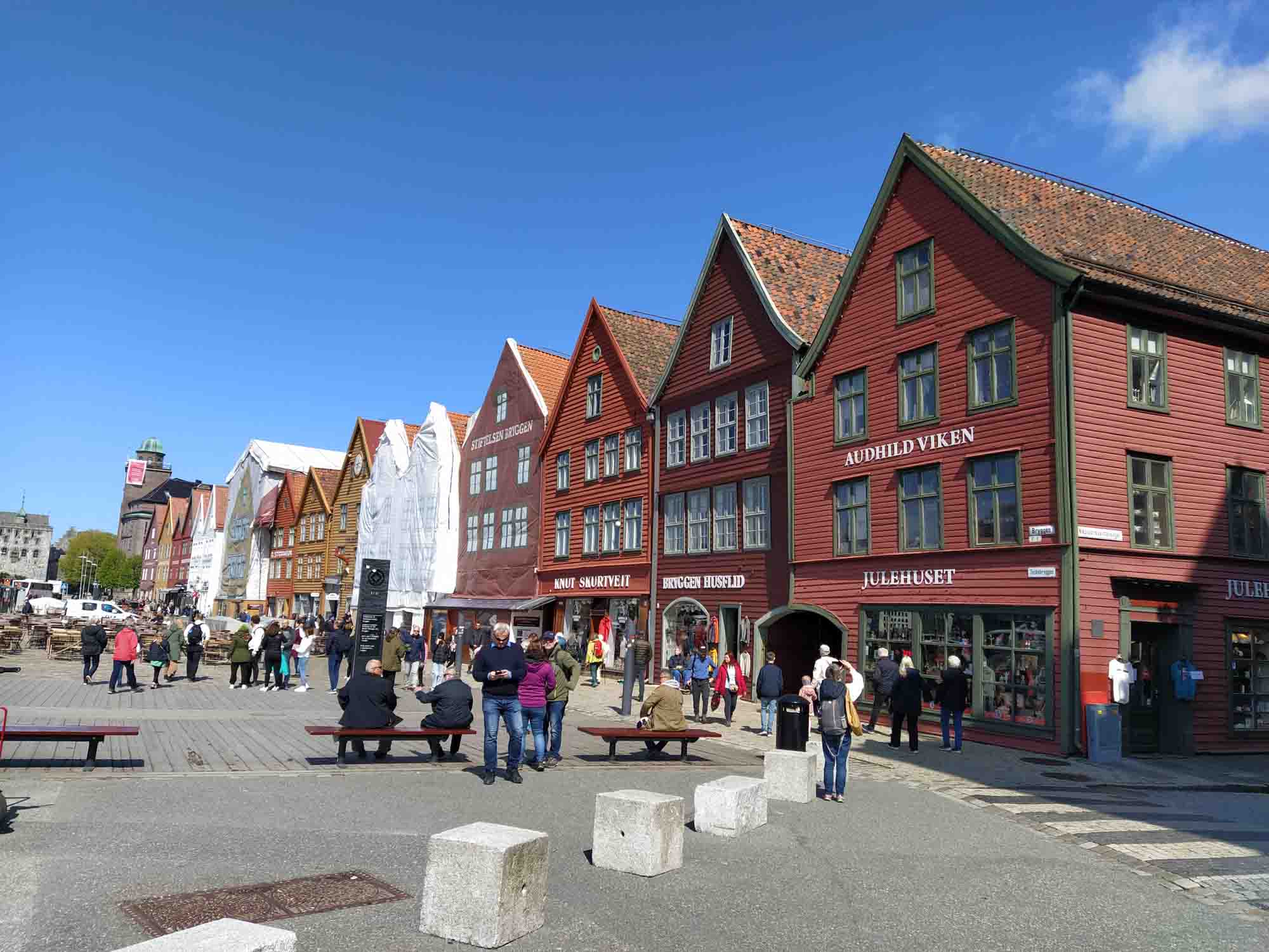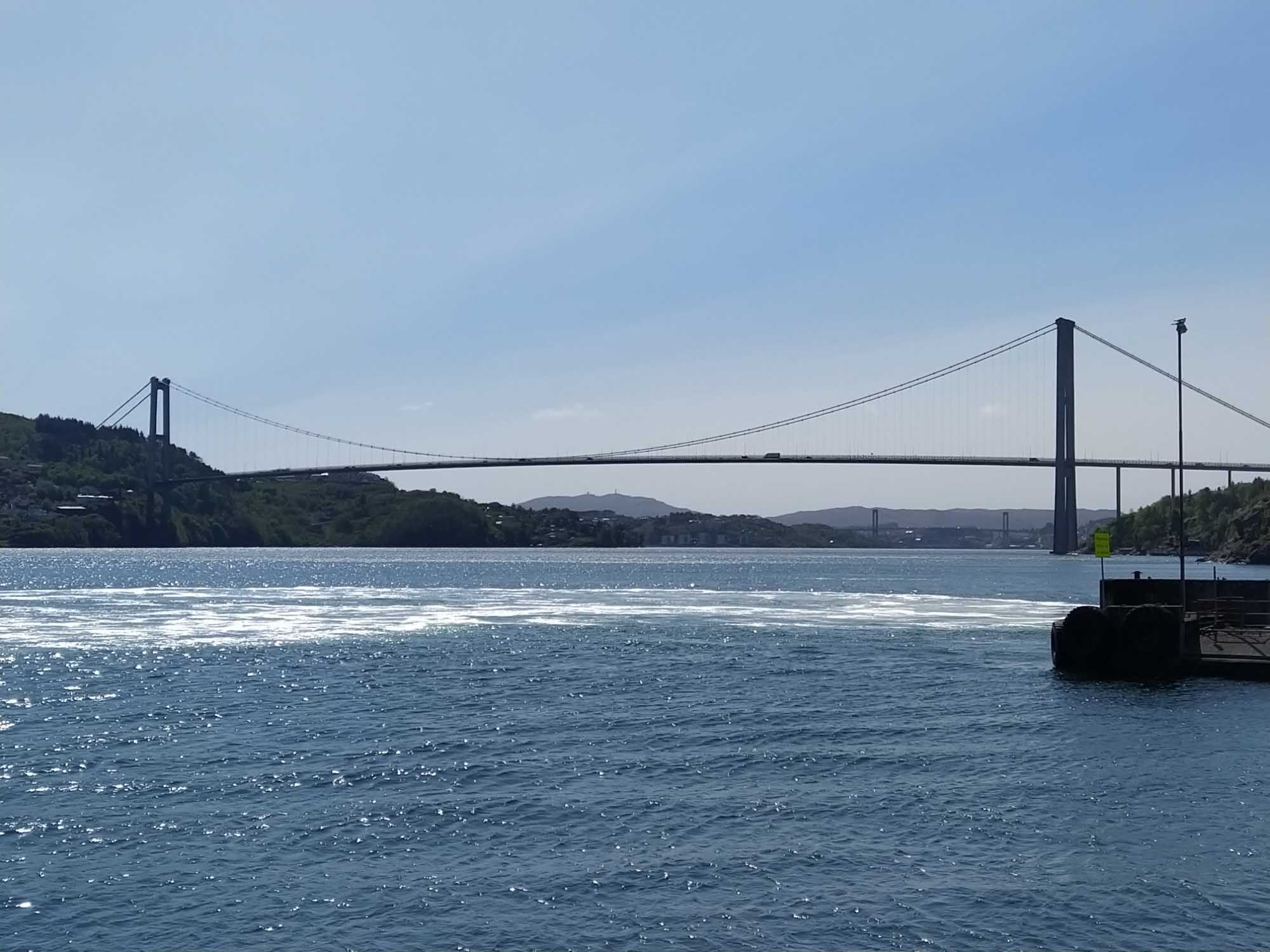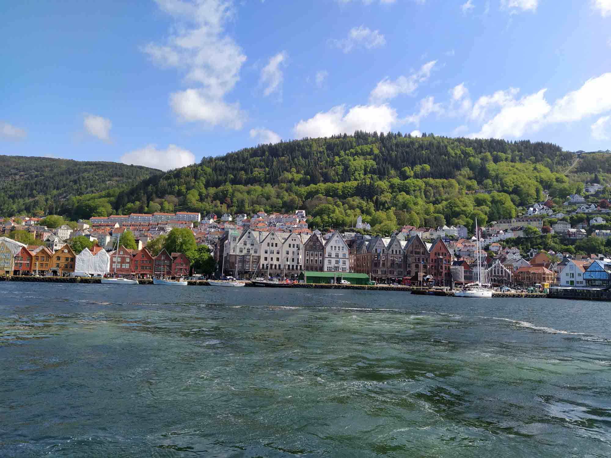 Michael war noch nicht wieder ganz hergestellt, aber das Wetter für die nächsten Tage versprach außer Regen nichts Gutes. Also mussten wir heute weiterfahren. Mit dem Auto fuhren wir jedoch zunächst nur bis zum Fährhafen in Kleppestø am südlichen Ende von Askøy. Dort nahmen wir die Schnellfähre nach Bergen, die uns zu Fuß in knapp 10 Minuten bis zum Pier in Bergen brachte. Dort schauten wir uns den Fischmarkt und die wiederaufgebauten historischen Häuser der alten Hansestadt an. Zum Mittagessen gönnten wir uns ein Hotdog mit Renntierwürstchen, das ausgesprochen lecker war. Wir ließen es langsam angehen und verzichten aufgrund Michaels Rücken auch auf die Fahrt mit der Zahnradbahn auf den Fløyfjellet, einen Berg von dem man einen schönen Blick auf Bergen haben soll. Aber wir haben auch so einen Eindruck von der an und für sich recht hübschen Altstadt rings um das Hafenbecken herum gewonnen, den wir allerdings mit zahlreichen Touristen aus aller Welt teilten, da hier etliche Kreuzfahren beginnen und enden und es sich natürlich auch die Passagiere nicht nehmen ließen, die Stadt zu erkunden. Wir nahmen die Fähre zurück und fuhren dann über die Autobahn an Bergen vorbei und folgten dann der E39 am Osterfjord nach Nordosten. Kurz vor Ostereidet bogen wir nach links auf die einspurige 395 ab und machten einen Picknickplatz an einem kleinen See zu unserem Übernachtungsplatz. Von Schafen umgeben standen wir hier wieder einmal wunderbar ruhig, abgesehen von den gelegentlich vorbeifahrenden Autos natürlich.