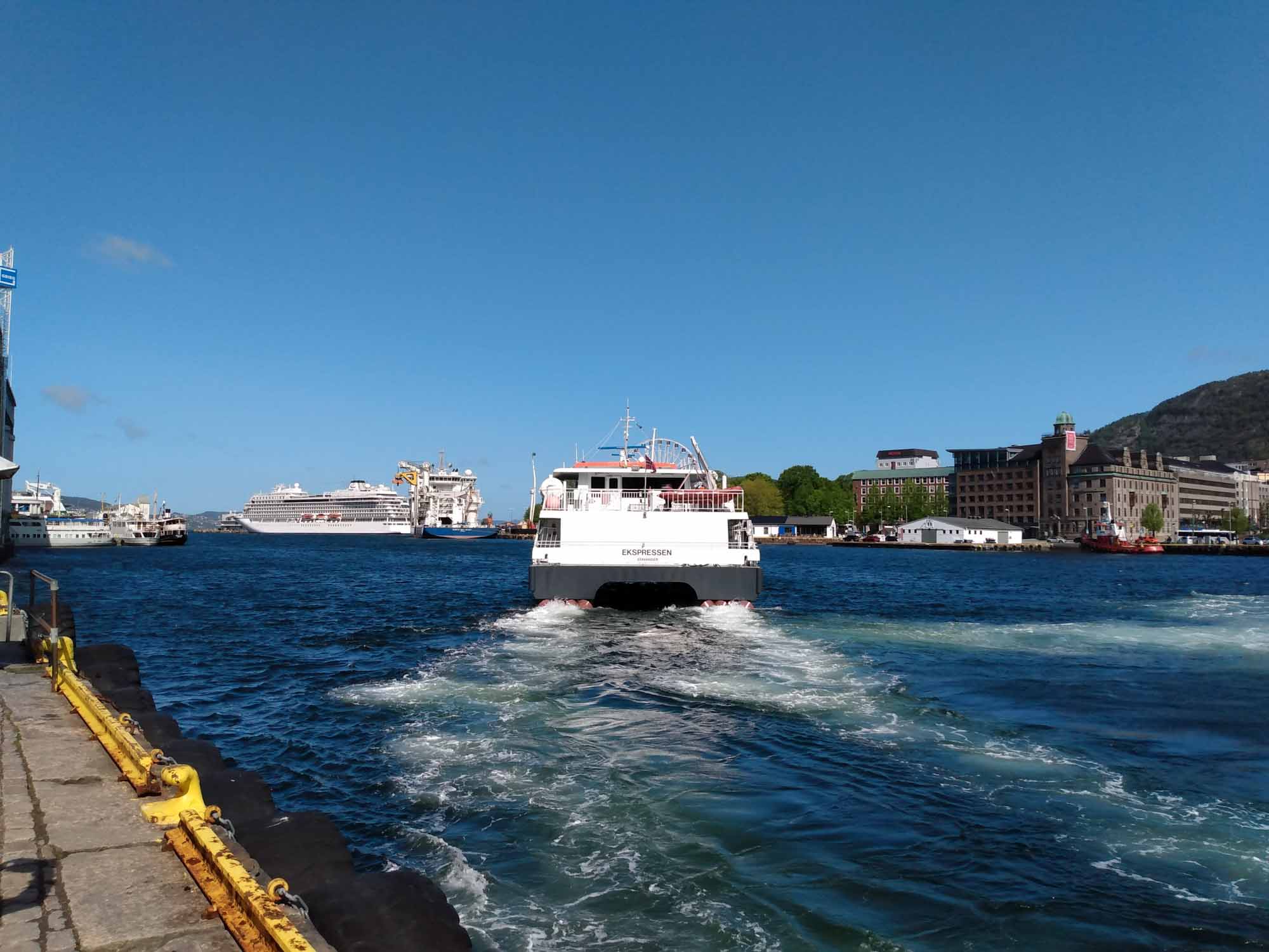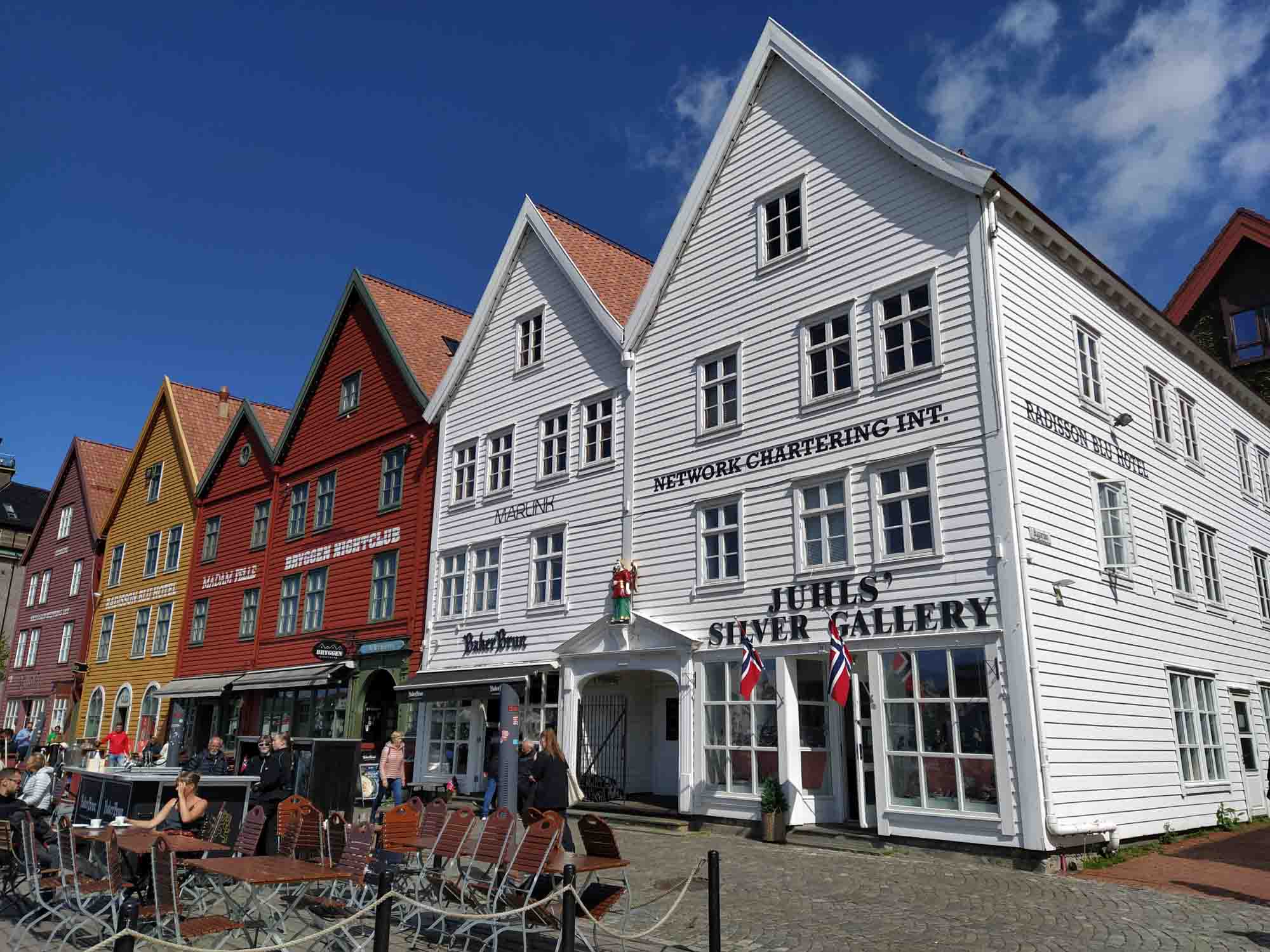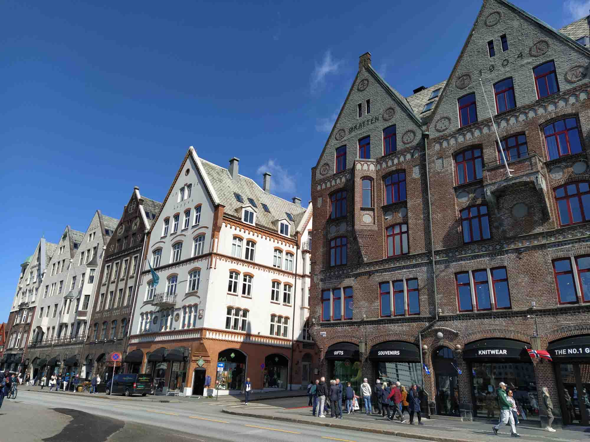 Michael war noch nicht wieder ganz hergestellt, aber das Wetter für die nächsten Tage versprach außer Regen nichts Gutes. Also mussten wir heute weiterfahren. Mit dem Auto fuhren wir jedoch zunächst nur bis zum Fährhafen in Kleppestø am südlichen Ende von Askøy. Dort nahmen wir die Schnellfähre nach Bergen, die uns zu Fuß in knapp 10 Minuten bis zum Pier in Bergen brachte. Dort schauten wir uns den Fischmarkt und die wiederaufgebauten historischen Häuser der alten Hansestadt an. Zum Mittagessen gönnten wir uns ein Hotdog mit Renntierwürstchen, das ausgesprochen lecker war. Wir ließen es langsam angehen und verzichten aufgrund Michaels Rücken auch auf die Fahrt mit der Zahnradbahn auf den Fløyfjellet, einen Berg von dem man einen schönen Blick auf Bergen haben soll. Aber wir haben auch so einen Eindruck von der an und für sich recht hübschen Altstadt rings um das Hafenbecken herum gewonnen, den wir allerdings mit zahlreichen Touristen aus aller Welt teilten, da hier etliche Kreuzfahren beginnen und enden und es sich natürlich auch die Passagiere nicht nehmen ließen, die Stadt zu erkunden. Wir nahmen die Fähre zurück und fuhren dann über die Autobahn an Bergen vorbei und folgten dann der E39 am Osterfjord nach Nordosten. Kurz vor Ostereidet bogen wir nach links auf die einspurige 395 ab und machten einen Picknickplatz an einem kleinen See zu unserem Übernachtungsplatz. Von Schafen umgeben standen wir hier wieder einmal wunderbar ruhig, abgesehen von den gelegentlich vorbeifahrenden Autos natürlich.