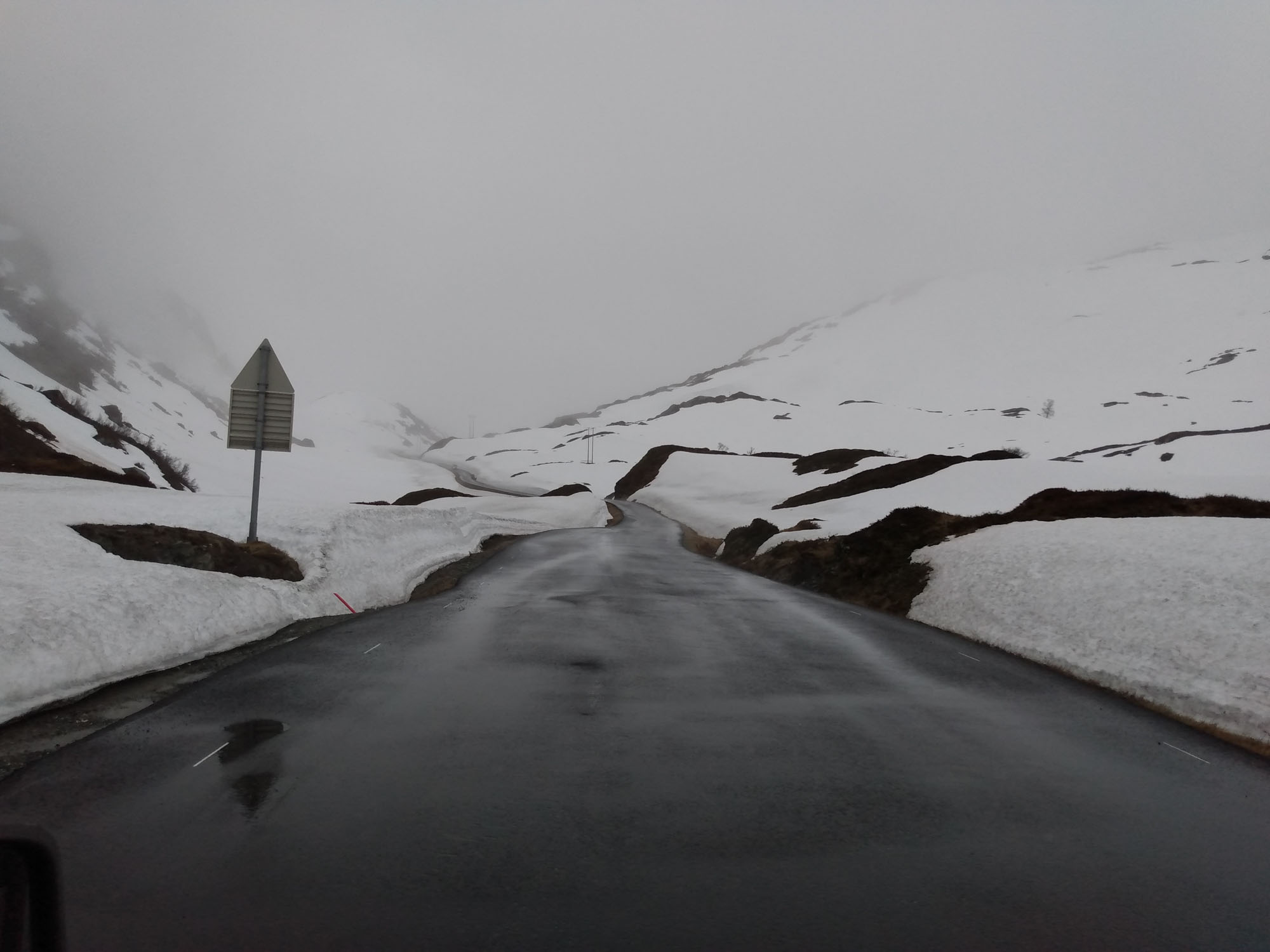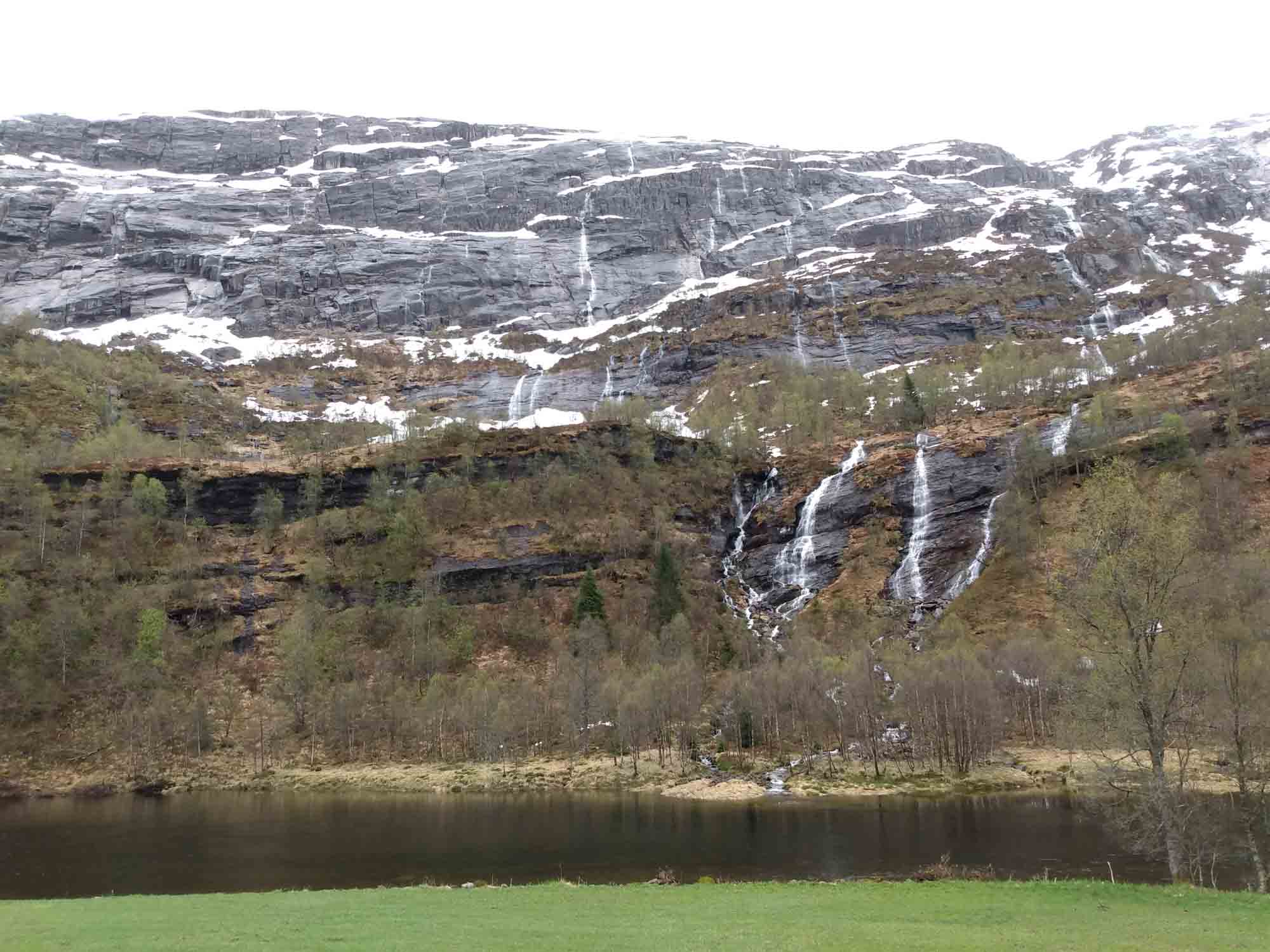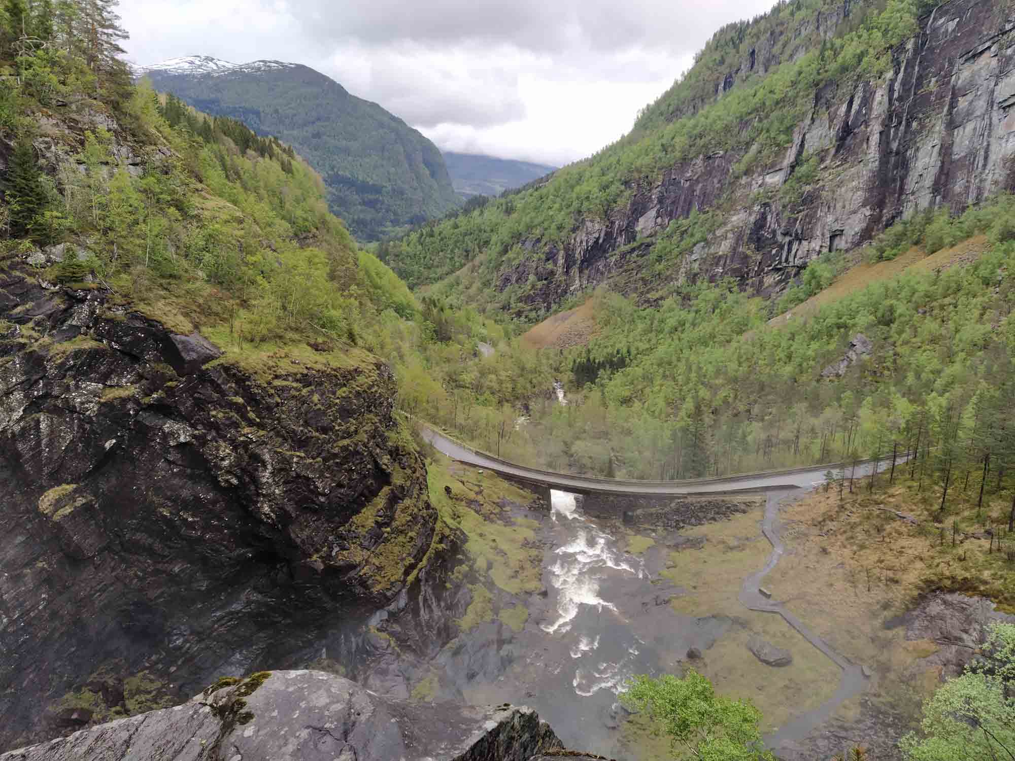 In der Nacht hatte es wie erwartet geregnet. Aber als wir dann losfuhren, legte er sich und bei der Fahrt entlang des Osterfjords erst über die E39 und dann über die kleine 569 bis nach Mo strahlte sie wunderbar vom Himmel herunter. Recht hatten wir allerdings mit Bergen. Dort regnete es heute tatsächlich. Gut, dass wir gestern dort waren. In Mo kamen wir zufällig an einer Entsorgungsstation vorbei, die es in Norwegen angenehm häufig gibt. So ließen wir altes Wasser ab und füllten unseren Wassertank mit frischem Quellwasser aus den Bergen. Danach folgte wieder einmal ein Tunnel durch den schneebedeckten Berg und dann bogen wir auf die noch kleinere 5410 ab und folgten dem Fluß Ekso ostwärts bergauf. Diesmal ging es über einen Pass, wo wir uns wieder mittem im Schnee befanden. Schließlich erreichten wir wieder die gut ausgebaute E16 und folgten ihr bis nach Vossvangen, wo wir unsere Gasflasche füllten. Nach einem Halt beim Wasserfall Skjervefossen fuhren wir zu unsem nächsten Stellplatz bei Ulvik, inmitten eines Skilanglaufgebietes. Dort machten wir noch einen kleinen Spaziergang, bevor wir uns von der langen - weil sehr langsamen - Fahrt auf den kleinen Straßen erholten.