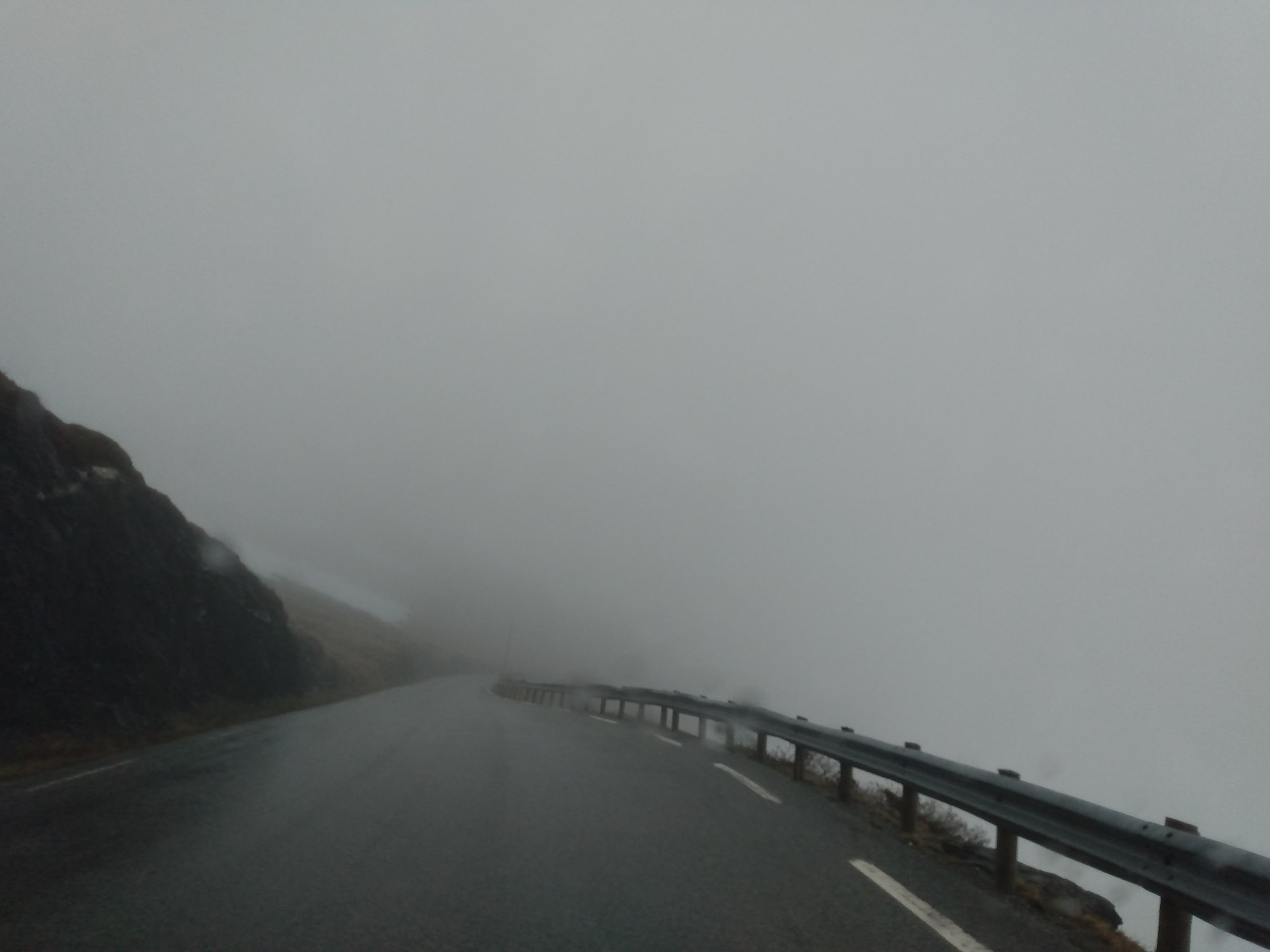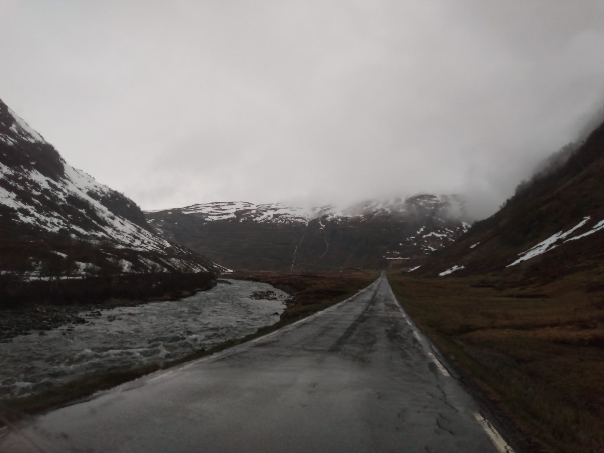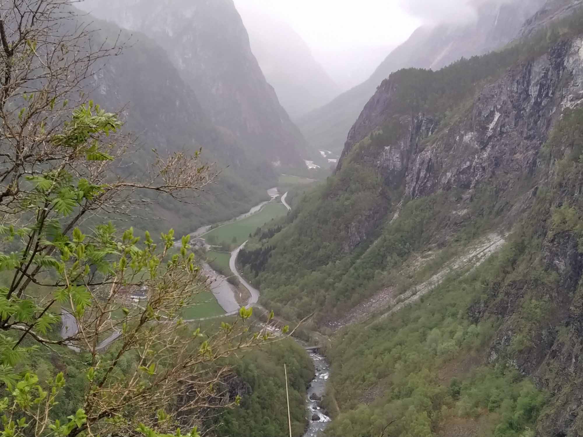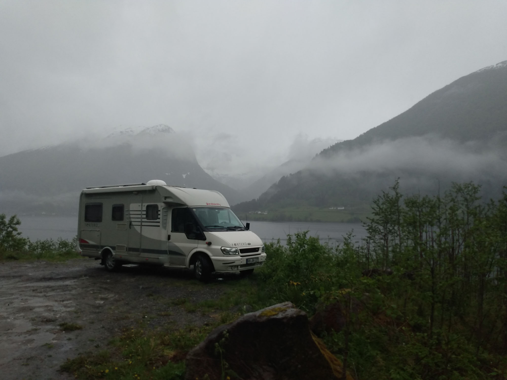 An der Straße war zum Glück kein Verkehr so daß wir trotz der schrägen Lage ruhig geschlafen haben. Nach einem ausgedehnten Spaziergang entlang der Straße und über einen Wanderweg am Fluß entlang, setzte dann Regen ein, der uns auch für den Rest des Tages begleiten sollte. Wir folgten der E 16 nach Westen und machten Halt bei der Stalheim Panorama Terasse. Die Terasse gehört zu einem Hotel und man hat von dort einen schönen Blick über das Tal. Noch spektakulärer wäre die Abfahrt über die alte Straße gewesen, die als Einbahnstraße in engen Serpentinen den Berg hinabführt. Diese ist jedoch wegen Bauarbeiten bis 2024 gesperrt. So lange wollten wir nicht warten und fuhren weiter bis wir kurz von Vossvangen auf die 13 nach Norden abbogen. Nach kurzer Zeit ging es wieder auf die schneebedeckte Hochgebirgslandschaft. Oben legten wir eine kleine Pause ein. Berta genoss es sichtlich ein wenig durch den Nieselregen und den Starkwind zu rennen. Wir fanden es etwas weniger gemütlich und fuhren lieber wieder herunter. Bei Vikøyri erreichten wir wieder den Sognefjord, dessen Seitenarme wir gestern bereits gesehen hatten. Hier bogen wir zu einer Stabkirche aus dem Jahr 1130 ab, sahen sie uns aus der Luft und bei einem kleinen Spaziergang im Nieselregen von außen an. Danach fuhren wir der 13 weiter folgend nach Vangsnes, um die Fähre nach Dragsvik zu nehmen. Auch diese Fähre war wieder voll elektrisch. Völlig geräusch- und vibrationslos glitten wir über den Fjord auf die andere Seite nach Hella. Dort mussten wir kurz von der Fähre herunterfahren, wenden und in die andere Richtung wieder auffahren. Dann ging es weiter nach Dragsvik, wo wir als erste die Fähre verließen und zunächste der 55 folgend nach Balestrand fuhren. Aufgrund des Regens verzichteten wir auf die sicherlich sehr schöne Wanderung, die man von hier machen kann. Wir fuhren stattdessen durch den kleinen Urlaubsort und suchten mehr oder weniger vergeblich nach dem Strand, der in unserem geliebten Reiseführer beschrieben war. Dabei fanden wir eine Entsorgungsstation, was auch ziemlich praktisch war. Danach fuhren wir wieder zurück auf der 55, diesmal in Richtung Norden immer entlang des Fjords, um bei Vetlefjorden auf eine einspurige Straße abzubiegen, die weiter am Wasser entlang führte. Dort fanden wir direkt neben einem Wasserfall einen Platz mit einem wunderbaren Blick auf den Fjord an dem wir uns sofort wohl fühlten.