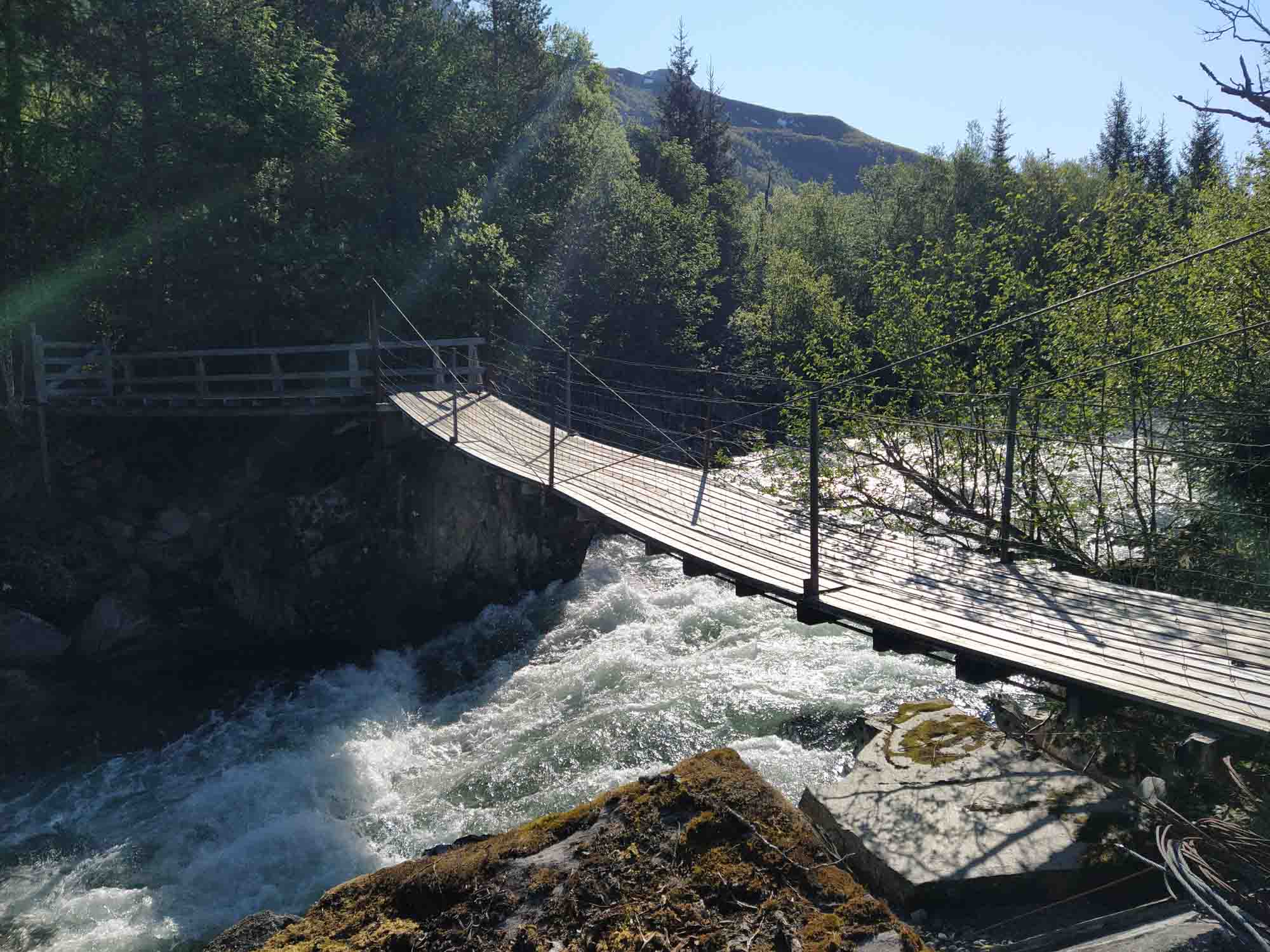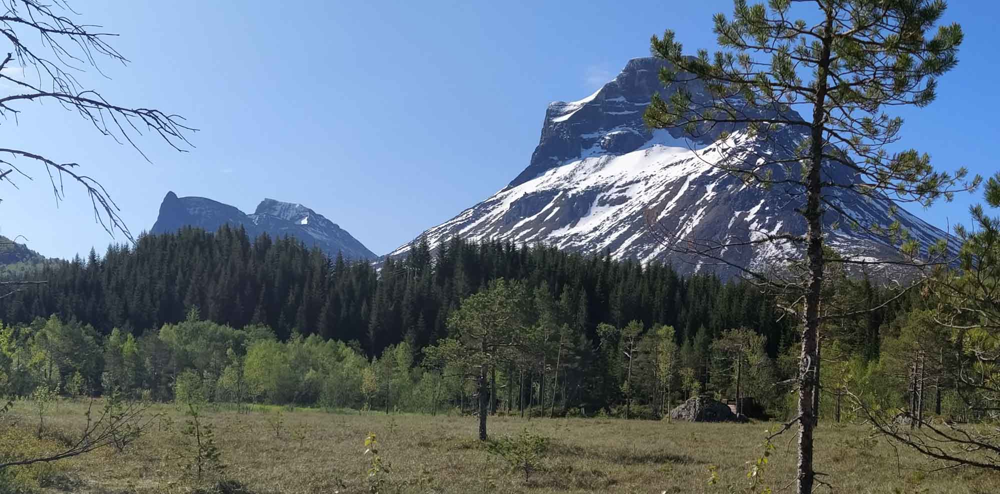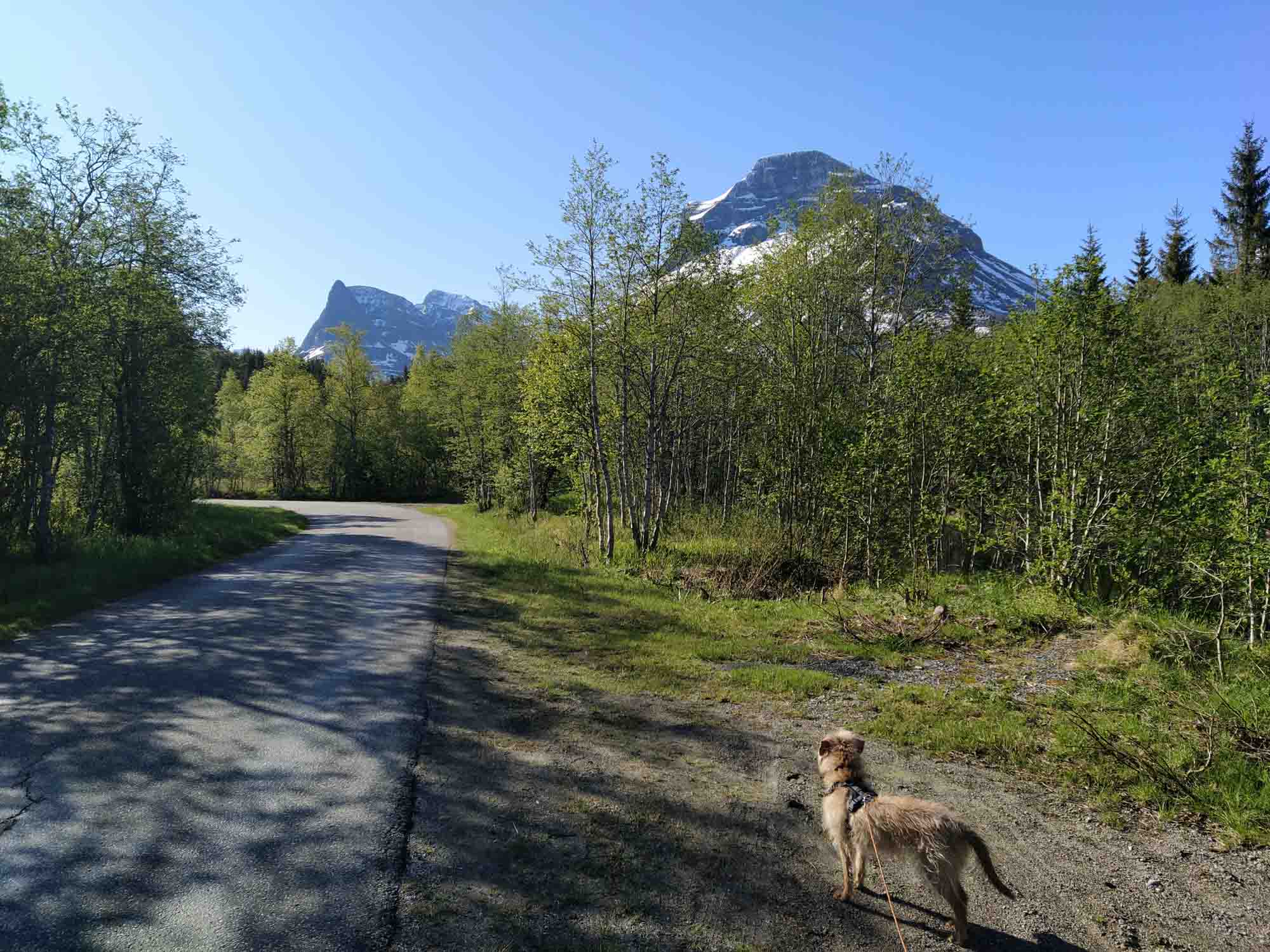 Strahlend blauer Himmel begrüßte uns am Morgen. Die Berge sahen ganz anders aus, als wir sie das erste Mal so richtig zu sehen bekamen. Heute bekam Berta nach ihrem Morgenspaziergang kein Frühstück. Das Essen gab es diesmal während der Fahrt. Dadurch war sie so abgelenkt, dass sie eine Weile vergessen hat, daß sie Angst beim Autofahren hat. Für uns ein voller Erfolg, wenngleich auch nur ein erster Anfang. Als wir das Sonnental weiter in Richtung Oppdal fuhren, passte der Name endlich. In Oppdal hielten wir kurz für einen Einkauf und machten, nachdem wir auf die E6 in Richtung Trondheim abgebogen waren, kurz danach eine Pause in einem Wald. Hier verbrachte Berta die Zeit draußen auf der Decke und konnte sich ein wenig erholen ehe wir weiterfuhren. Ca. 60 km vor Trondheim bogen wir nach rechts in die Berge ab und richteten uns auf dem Parkplatz einer Entsorgungsstation in Bondal für die Nacht ein. Bei einem Spaziergang entdeckten wir einen noch schöneren Platz bei der örtlichen Langlaufskiarena, entschieden uns aber dennoch dafür, einfach stehen zu bleiben. Danach wie üblich Abendbrot, Spielen, Schlafen gehen.