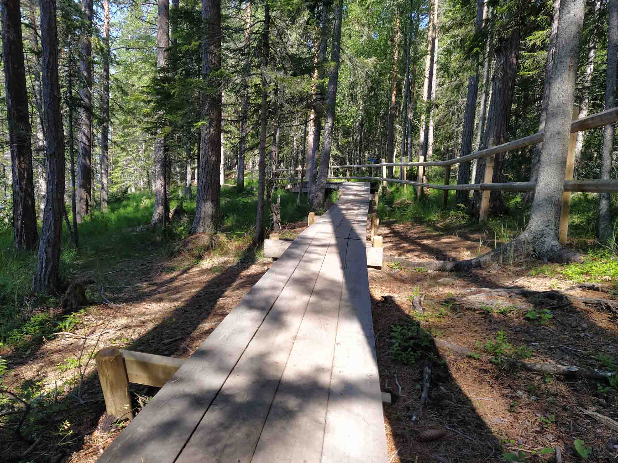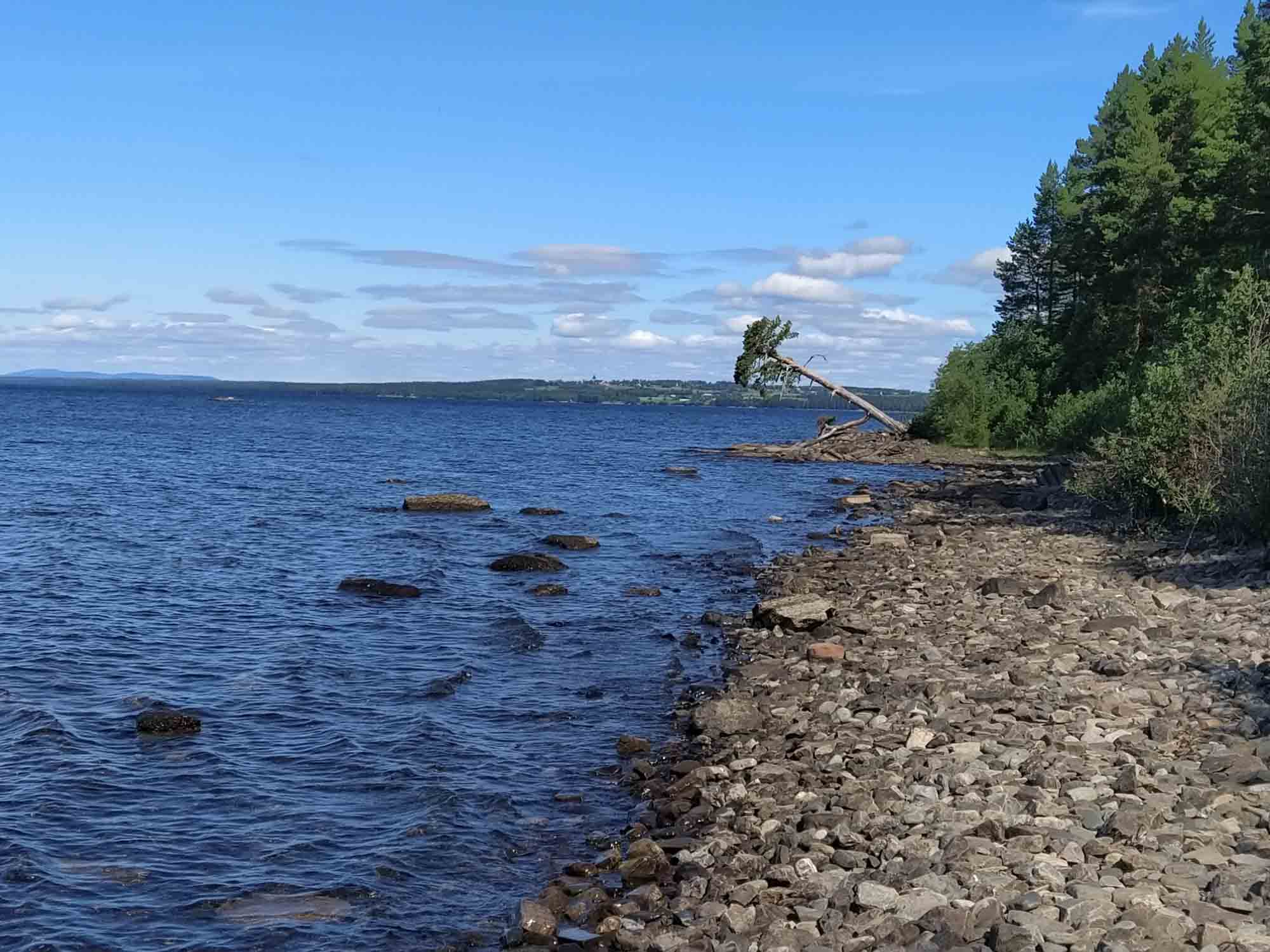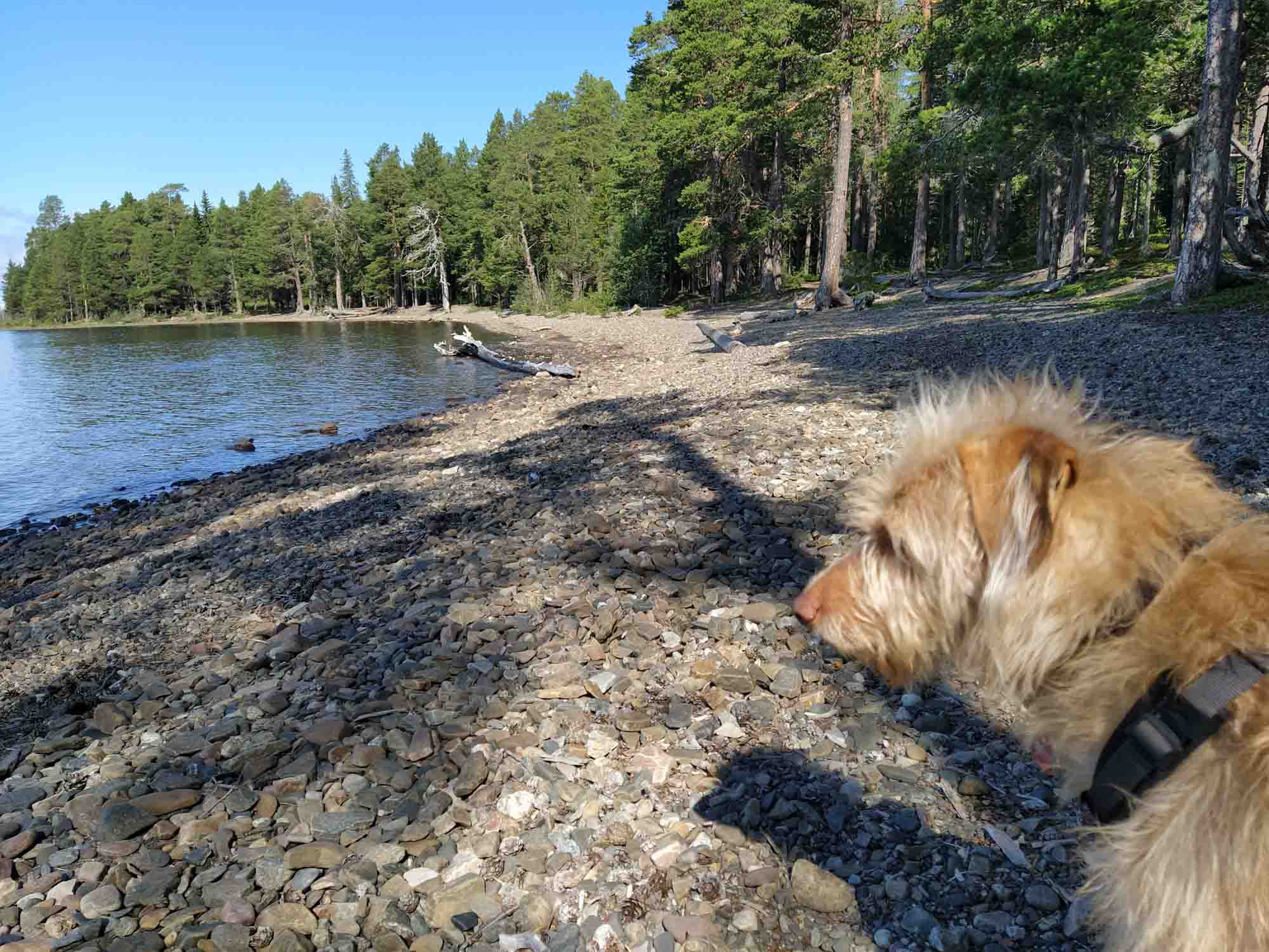 Dies Sonne schien endlich wieder richtig und der Himmel war strahlend blau. Genau richtig für eine morgendliche Wanderung. Rings um das Sperrgebiet gab es einen 7 km langen Weg, der immer entlang des Ufers führte. Wie in Schweden üblich die meiste Zeit über die Wurzeln der Bäume, die bis zum schmalen Kiessrand herunter reichten. Es gab aber auch einige Stege und Brücken. Allerdings immer an einem Holzzaun entlang, hinter dem alle 10 m ein Schild prankte, dass das Betreten des Gebiets dahinter verboten und extrem gefährlich sei. Als wir wieder zurück waren, war es bereits halb zwölf. Eine Stunde später hatten wir gefrühstückt und wir fuhren los. Den ersten Halt machten wir nach 30 Minuten auf einem Parkplatz an der Straße mit Blick auf einen Ausläufer des Starsjön, den großen meerähnlichen See bei Östersund. Danach ging es mit einer kurzen Unterbrechung zum Benzin und Wasser tanken kurz vor dem Ziel weiter bis zu eimem Angelplatz bei Åsarna, den wir uns ausgesucht hatten, um hier das Wochenende zu verbringen. Zum Glück stand hier noch niemand und wir hatten den Platz für uns. Dachten wir zumindenst. Kaum 5 Minuten später kam ein Campervan aus Deutschland und stellte sich fast direkt neben uns. Offensichtlich hatten sie jedoch einen ähnlichen Gedanken wie wir gehabt denn weitere 5 Minuten später waren sie schon wieder weg. Wir machten es uns gemütlich und heizten den Grill an, auf den wir uns schon so lange gefreut hatten. Dabei stellten wir fest, dass unsere Gasflasche mittlerweile fast leer war. In Schweden ist die Versorgung mit Gas, zumindest, wenn man eine Flasche befüllen lassen will, ziemlich schlecht. Im Norden noch schlechter als im Süden. Auf dem gesamten Weg von Norwegen, bis nach Östersund gab es keine einzige Gasstation und die nächste, die auf unserem Weg liegt, ist in Fallun. Bis dahin werden wir noch mindestens zwei Wochen brauchen. Gut, dass wir eine weitere Flasche dabei haben. Bis auf ein gelegentliches Auto, das einmal um unseren Platz herum- und dann unverrichteter Dinge wieder wegfuhr, blieben wir bis zum Schlafengehen allein. Als es soweit war, fing es langsam an zu Regnen und wir schliefen beim Tröpfeln des Regens auf unser Dach ein, das das leise Geräusch der Stromschnellen des Flusses neben uns übertönte.