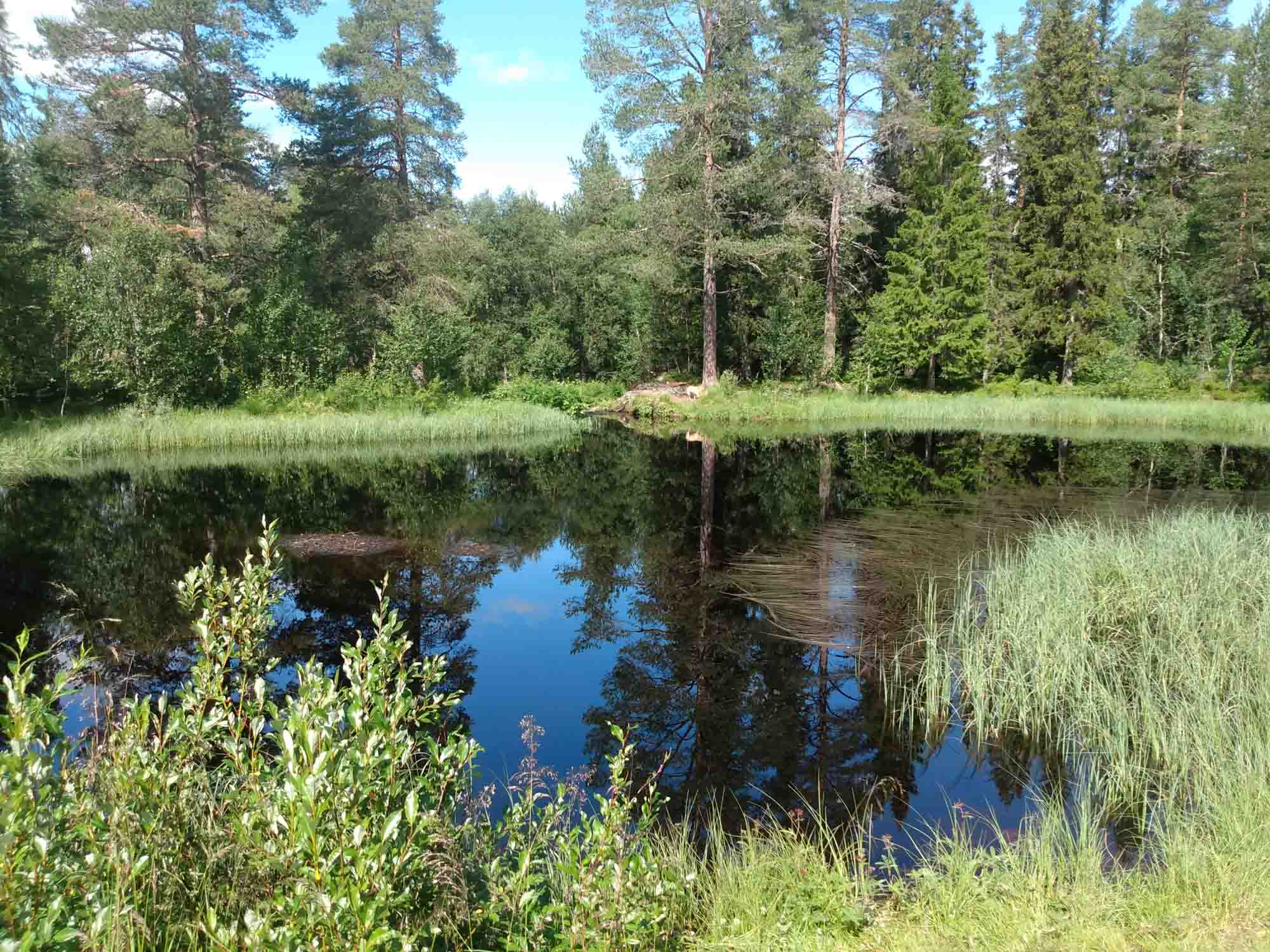 Als wir morgens aufwachten, regnete es gerade fürchterlich. Also blieben wir noch etwas länger liegen. Gegen 11:30 Uhr hatte es aufgehört und wir konnten mit unserem ersten Spaziergang beginnen. Da es schon so spät war und es an unserem nächsten Ziel, dem Wasserfall bei Fulufjället, den ganzen Tag regnen würde, entschieden wir uns einfach hier zu bleiben. Bis auf einen gelegentlichen Schauer blieb es sonnig, aber aber trotzdem zu kühl, um draußen zu sitzen. Wir nutzten den Tag für die Reparatur unseres Brems- und Rückfahrlichts. Dabei stellten wir außerdem fest, das die Abdeckung der oberen Rückleuchte fehlte. Das konnten wir nicht reparieren und klebten es als Regenschutz ab. Hin und wieder hielt ein Auto, die Leute angelten kurz und verschwanden dann wieder. Gefangen hatte keiner etwas. Es wäre auch ein großer Zufall gewesen, hätte sich ein Fisch in diesen eher an einen Dorftümpel erinnernden See verirrt, anstatt im naheliegenden Fluß in der Strömung zu schwimmen.