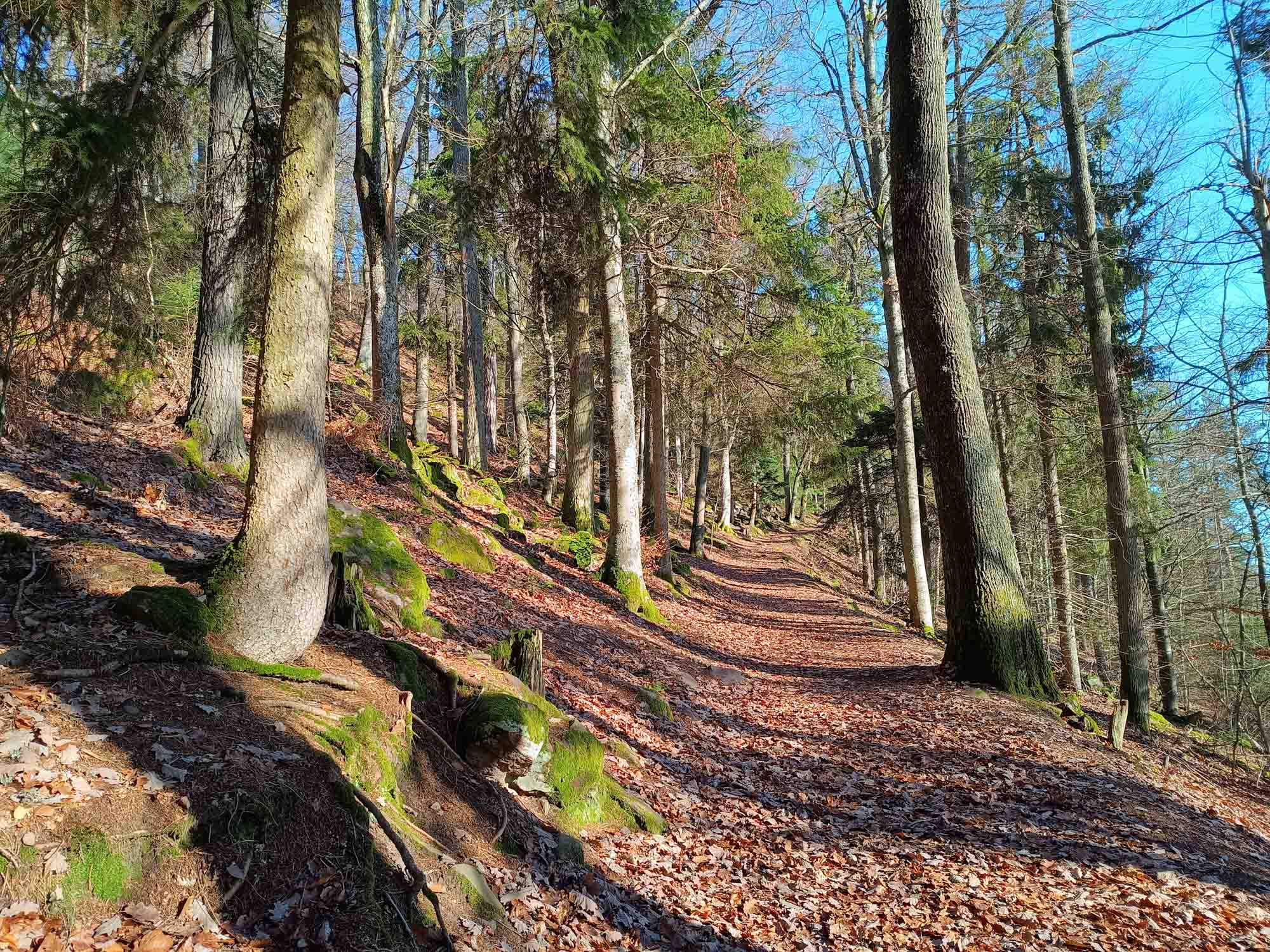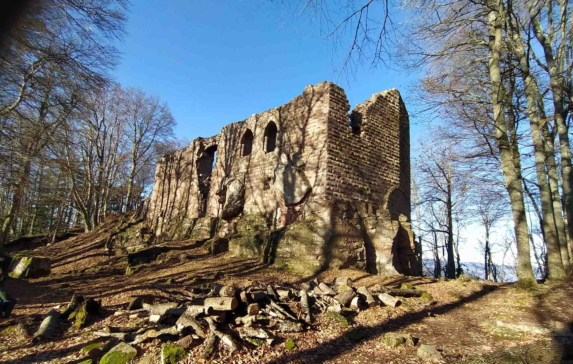 Morgens wurden wir von Schüssen geweckt. Solange wir im Bett waren, interessierte sich Berta dafür nicht. Aber als wir versuchten unseren Morgenspaziergang zu machen, hörten wir auch die Stimmen der Männer unweit unseres Nachtplatzes. Sie waren wohl etwas unterhalb zwischen den Weinreben auf Hasenjagt. Entsprechend kurz fiel der Spaziergang aus und wir fanden uns kurzerhand im Bett mit Berta kuschelnd wieder. Nach dem Frühstück fuhren wir die knapp 8 km bis zur Burg Haut-Königsburg hinauf und bekamen bei herrlichstem Sonnenschein einen tollen Blick auf den unter uns liegenden Nebel. Eigentlich kann man von hier nach links bis nach Straßburg und nach rechts bis nach Colberg sehen, die beide auf der den Vogesen vorgelagerten Ebene liegen. Aber alles unterhalb des Berges, auf dem wir standen blieb unter einem riesigen Meer aus Wolken verborgen. Der Spaziergang war herrlich und wir konnten einmal um die eindrucksvolle Burg herumgehen. Der Zutritt blieb uns jedoch verwehrt: Hunde waren mal wieder nicht willkommen. Am frühen Nachmittag machten wir uns auf die Weiterfahrt und tauchten bald in den Nebel ab. Die Landschaft wurde wunderbar gespenstisch und von der Sonne war nur noch ein heller Fleck zu sehen. Alles wirkte schemenhaft und irgendwie gedämpft. Unser nächstes Ziel war das Örtchen Keysersberg, das sehr hübsch sein soll. Vor allem offensichtlich an einem Sonntag zur Weihnachtszeit, wo es dort wahrscheinlich einen fantastisch gemütlichen Weihnachtsmarkt gibt. In Anbetracht der langen Autoschlange, die sich an der Anfahrt zu dem kleinen Ort versuchte und der Größe unseres Wohnmobils und der damit verbundenen Schwierigkeit, einen passenden Parkplatz zu finden, zogen wir es vor zu wenden und nach Colberg zu einem E. LeClerc zu fahren, unserem lange vermissten Supermarkt. Dort kauften wir nach herzenslust ein und freuten uns über das üppige Angebot an frischen Backwaren und natürlich der Fischtheke. Wir bekamen sogar einen Weinschlauch von unserem gerade leer gewordenen Lieblingswein. Als wir wieder herauskamen war es noch eine halbe Stunde bis zum Sonnenuntergang. Wir hatten uns 20 Minuten entfernt einen Übernachtungsplatz im Nationalpark ausgesucht und freuten uns gemeinsam mit Berta auf einen schönen Spaziergang bei Sonnenuntergang. Leider hatten wir unsere Planung nicht mit dem französischen Straßenbauamt abgestimmt. Das hatte nämlich leider die Straße, die an drei Burgen und unserem Übernachtungsplatz vorbeiführt für die Zeit vom 1.11. bis zum 31.3. gesperrt. Unseren Spaziergang machten wir trotzdem, sogar etwas länger als geplant bis in die Dunkelheit hinein, nachdem wir den Wagen unweit der Straßensperrung am Seitenstreifen abgestellt hatten. Danach mussten wir noch eine halbe Stunde weiter fahren bis wir zu unserem tatsächlichen Übernachtungsplatz kamen. Hierzu mussten wir noch eine steile schmale Straße überwinden und uns zwischen zwei Häusern hindurchquetschen. Zum Glück kam uns niemand entgegen und hoffentlich wird das morgen bei der Weiterfahrt auch so sein. Rückwärts möchten wir jedenfalls beide auf diesem schmalen Weg am Abhang nicht fahren. Dann bereiteten wir uns ein leckeres Abendbrot bestehend aus Fisch mit Bratkartoffeln zu und ließen es uns bei einen Becher Glühwein schmecken. So schön kann Frankreich sein.