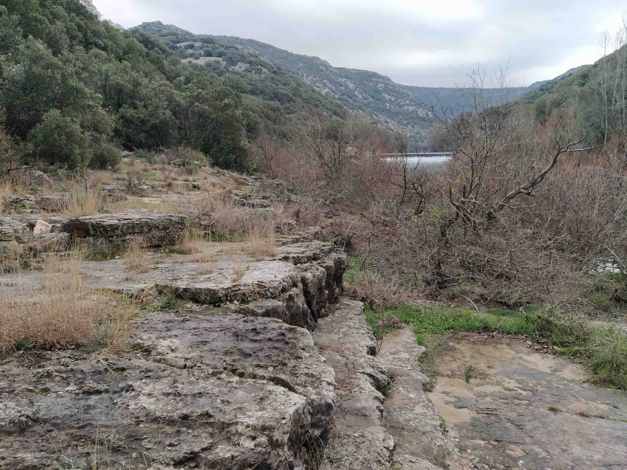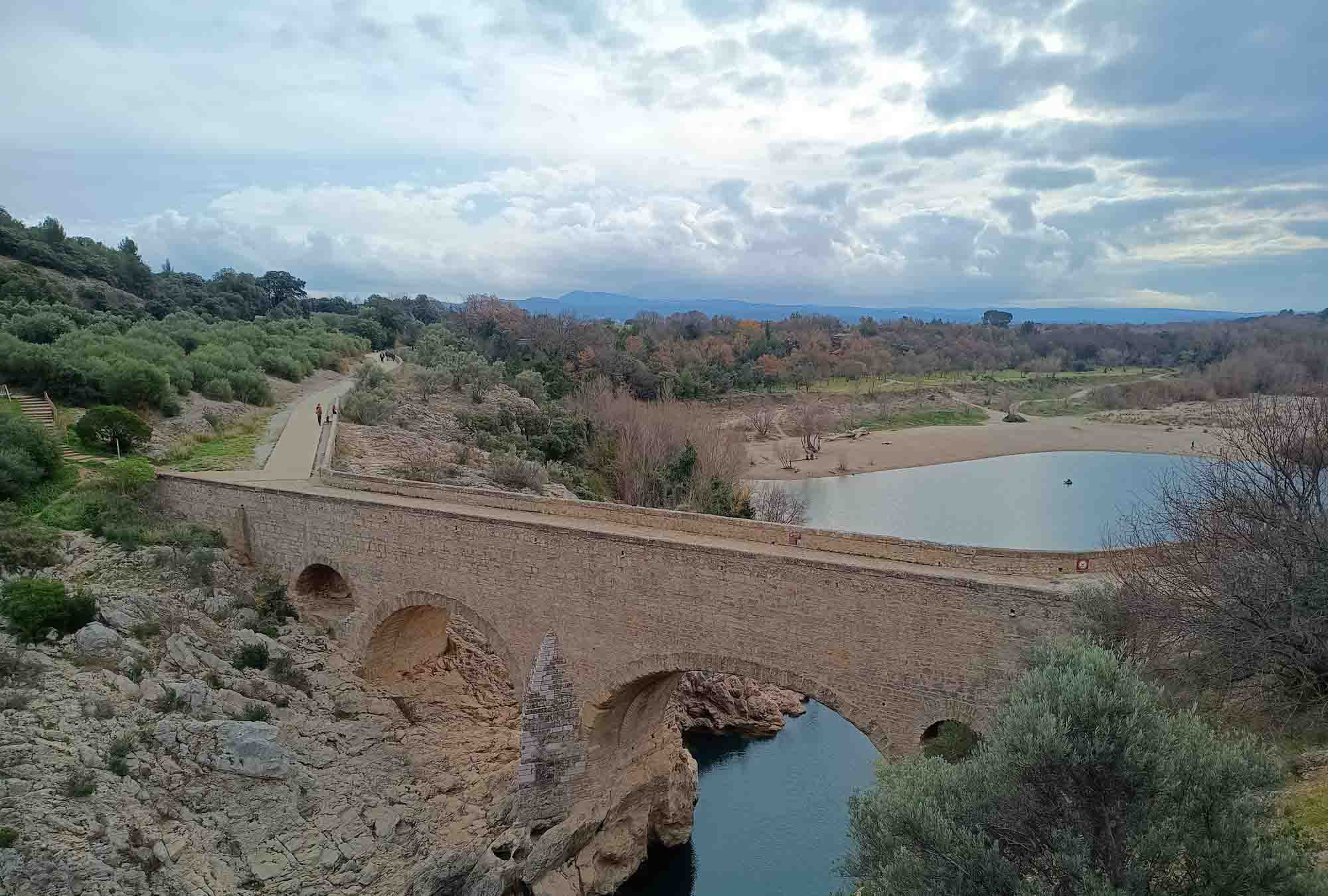 Auch heute hatten wir wieder eine längere Fahrt vor uns und standen erneut um 9 Uhr auf. Als erstes kletterten wir noch einmal am Flußufer des Hérault entlang und kamen diesmal bis zu einer Kanustation oberhalb des Wasserfalls, den wir gestern bereits gesehen hatten. Pünktlich um 11 Uhr fuhren wir weiter. Berta diesmal fast ohne Zittern und das blieb auch während der gesamten Fahrt so. Was für ein Glück. Nach etwa 20 Minuten erreichten wir mehr oder weniger zufällig eine beeindruckende Brücke, die über den Hérault führte und kurz danach war ein großer Parkplatz, der netterweise saisonbedingt kostenlos war. Kurzerhand entschlossen wir uns, gleich noch einen Spaziergang zu machen und wanderten zu der ziemlich alten Pont de Diablo, der Brücke des Teufels. Als wir auf der Brücke standen, bekamen wir flußaufwärts noch einen letzten Blick auf den sich dahinschlängelnden Canyon. Der nächste Teil der Strecke war eher langweilig. Rechts und links sich weit erstreckende Felder mit knorrigen alten Weinreben, an denen im nächsten Sommer die nächste Ernte für den hiesigen Corbière heranwachsen wird. Als wir uns Béziers näherten wurde die Landschaft zunehmend mediterraner. Die Zypressen vor den Häusern erinnerten ein wenig an Italien, die Häuser dagegen hätten auch in Spanien stehen können. Ebenso wie die riesigen Gewerbegebiete, die sich ewig entlang der Nationalstraße zu erstrecken schienen. Wir legeten noch einen weiteren Stopp für einen Spaziergang und eine kleine Stärkung ein, bevor wir uns auf die letzte Etappe des heutigen Tages machten. Nachdem wir auch an Narbonne vorbeigefahren waren, bekamen wir das erste Mal auf unserer Reise weit am Horizont das Mittelmeer zu sehen. Dann war es auch nicht mehr weit bis zu unserem Stellplatz. In Salses-le-Château fuhren wir von der Nationalstraße ab und fuhren auf einer kleinen einspurigen Straße in Richtung L'Étang de Salses, einer Lagune, die nordöstlich von Perpignan liegt. Als wir eine große, sehr alte Pinie und davor eine Parkmöglichkeit entdeckten war uns sofort klar, das dies unser Platz für die Nacht sein würde. Wir waren so früh angekommen, dass wir heute sogar noch vor Sonnenuntergang spazieren gehen konnten. So entdeckten wir auch gleich die Flamingos, die in den flachen Seen im Randbereich der Lagune herumstanden. Berta interessierte sich natürlich auch für sie, durfte aber nicht. Zum Abendbrot zauberten wir uns leckere Crèpes mit karamelisierten Äpfeln.