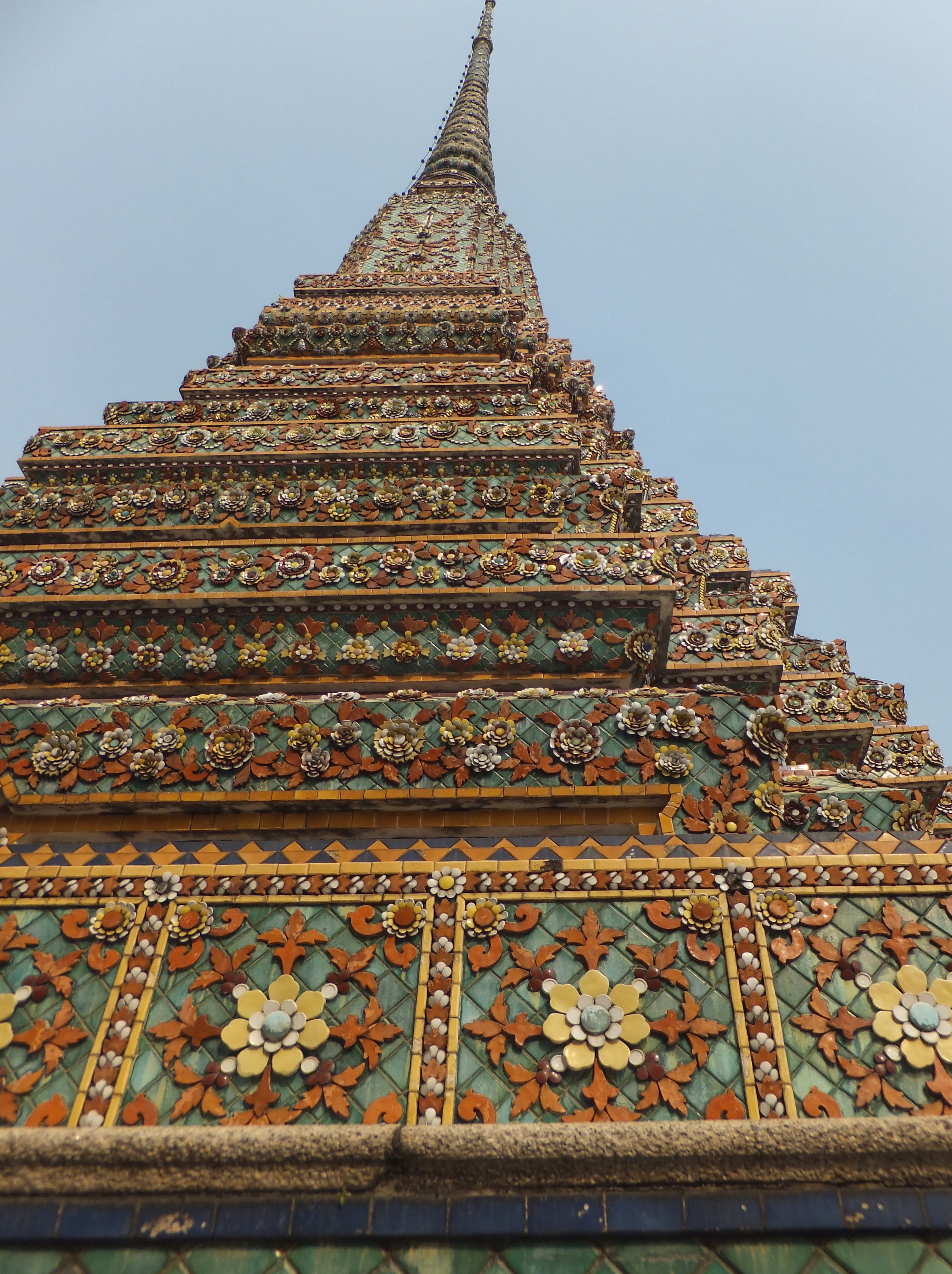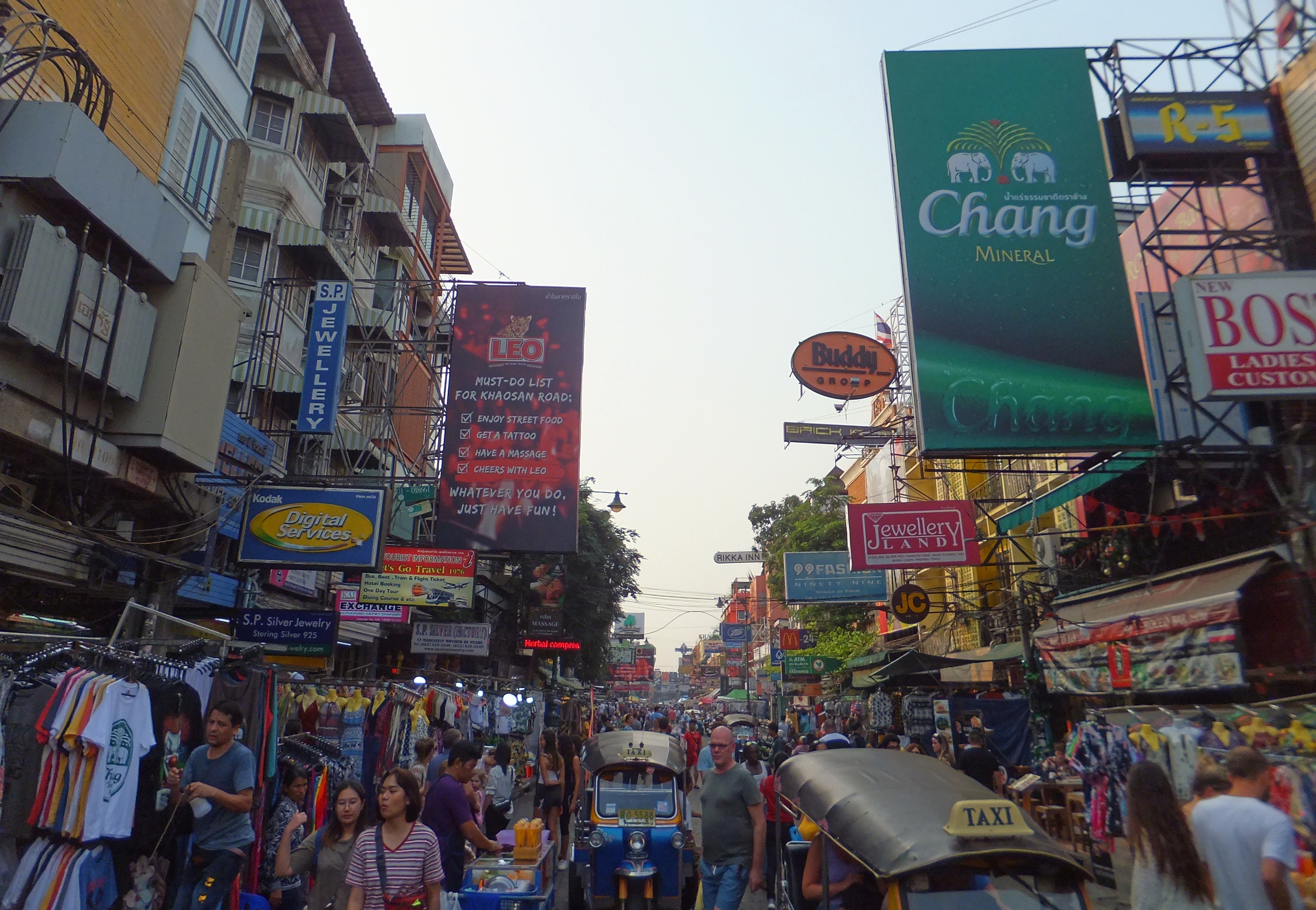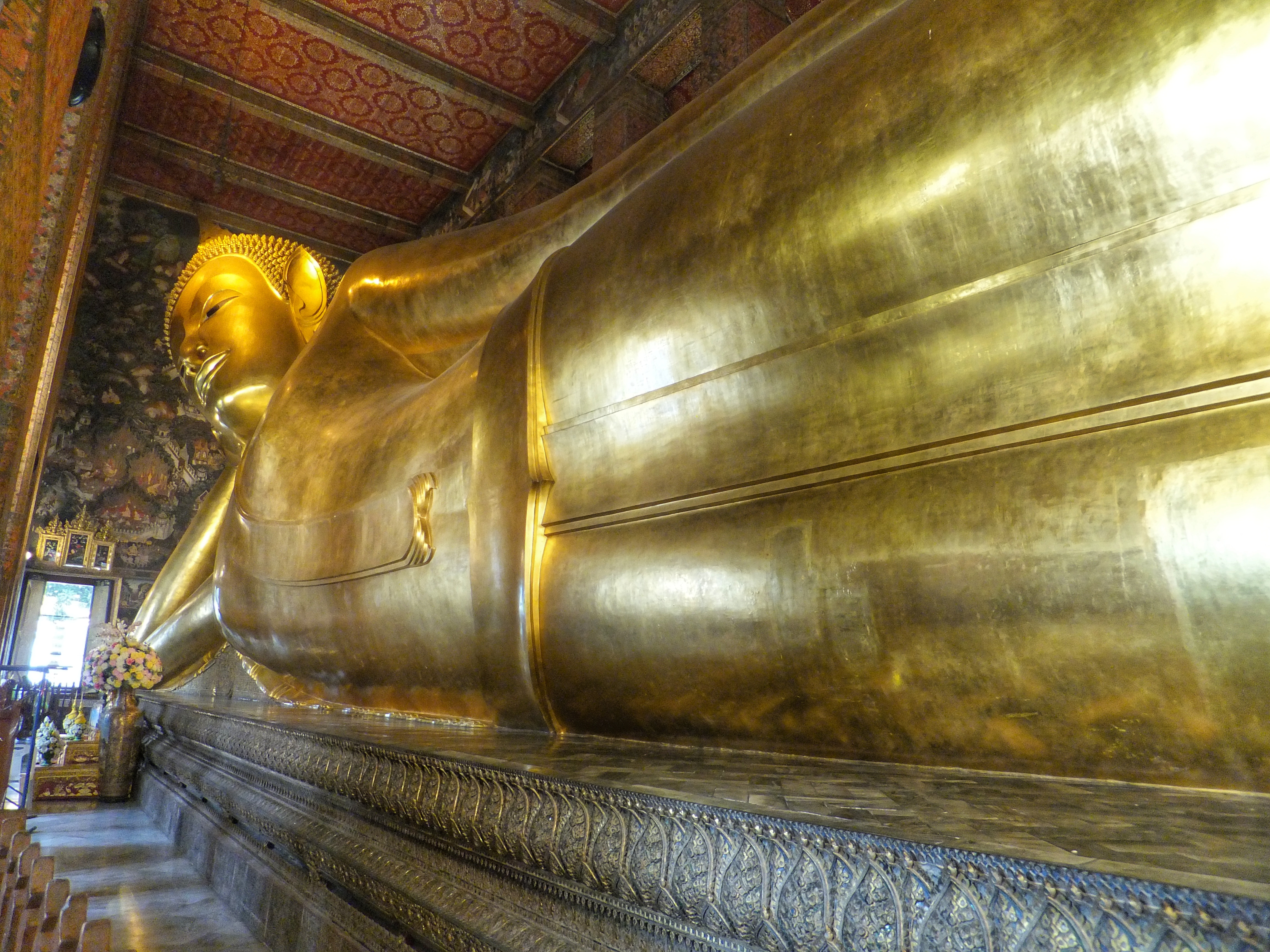 Nach einem gemütlichen Morgenkaffee im Hotel fuhren wir mit dem Taxi zu einem Floating Market in der Nähe. Wir schlenderten eine Weile an den zahlreichen Ständen vorbei und genossen die typischen Düfte und das bunte Treiben auf dem Markt. Auf den Booten wurde vor allem Essen zubereitet und auch wir genehmigten uns Muscheln und eine Suppe zum Mittagessen. Danach ging es auf einem Langboot zurück in die Stadt wo wir uns den liegenden Buddha im Wat Pho ansahen. Zum Glück durfte ich auch in kurzen Hosen hinein. Aneta legte sich ein Tuch über die Schultern. Damit war auch sie angemessen gekleidet. Der Tempel war durchaus sehenswert und die feinen Arbeiten an den Füßen des Buddhas besonders schön anzusehen. Danach gingen wir zu Fuß zu Kho San, einer stark touristisch angehauchten Straße, in der alles vertreten ist, was Thailand für Touris zu bieten hat: Massagen, Bier, gebackene Skorpione, Maden, Heuschrecken und Frösche, Süsses, Herzhaftes und laute Musik. Wir setzen uns und ließen das bunte Treiben bei einem großen kalten Bier an uns vorbeiziehen. Auch in der nächsten Straße war viel los und wir spazierten noch ein Weilchen einfach so durch die Menschenmassen bevor wir uns in der kleinen Gasse in der Nähe unseres Hotels zum Abendessen hinsetzten.