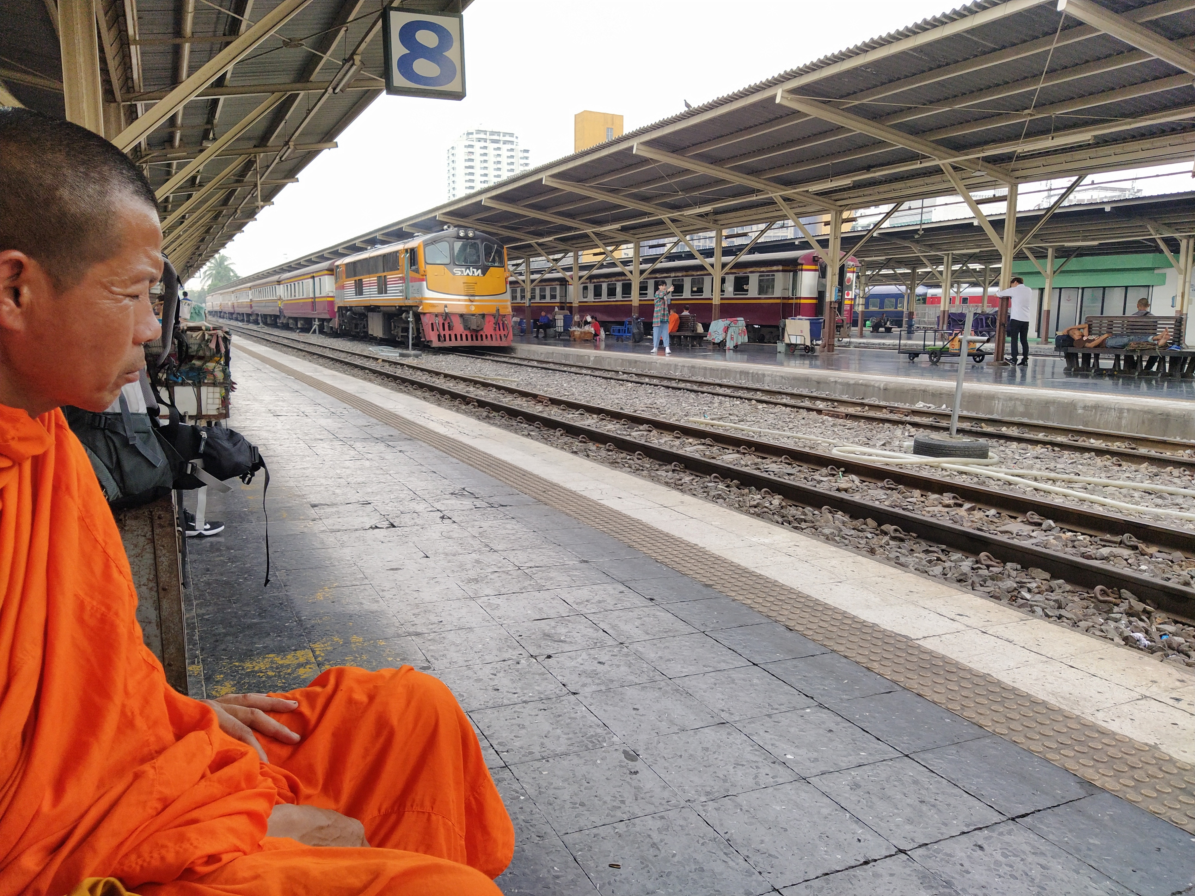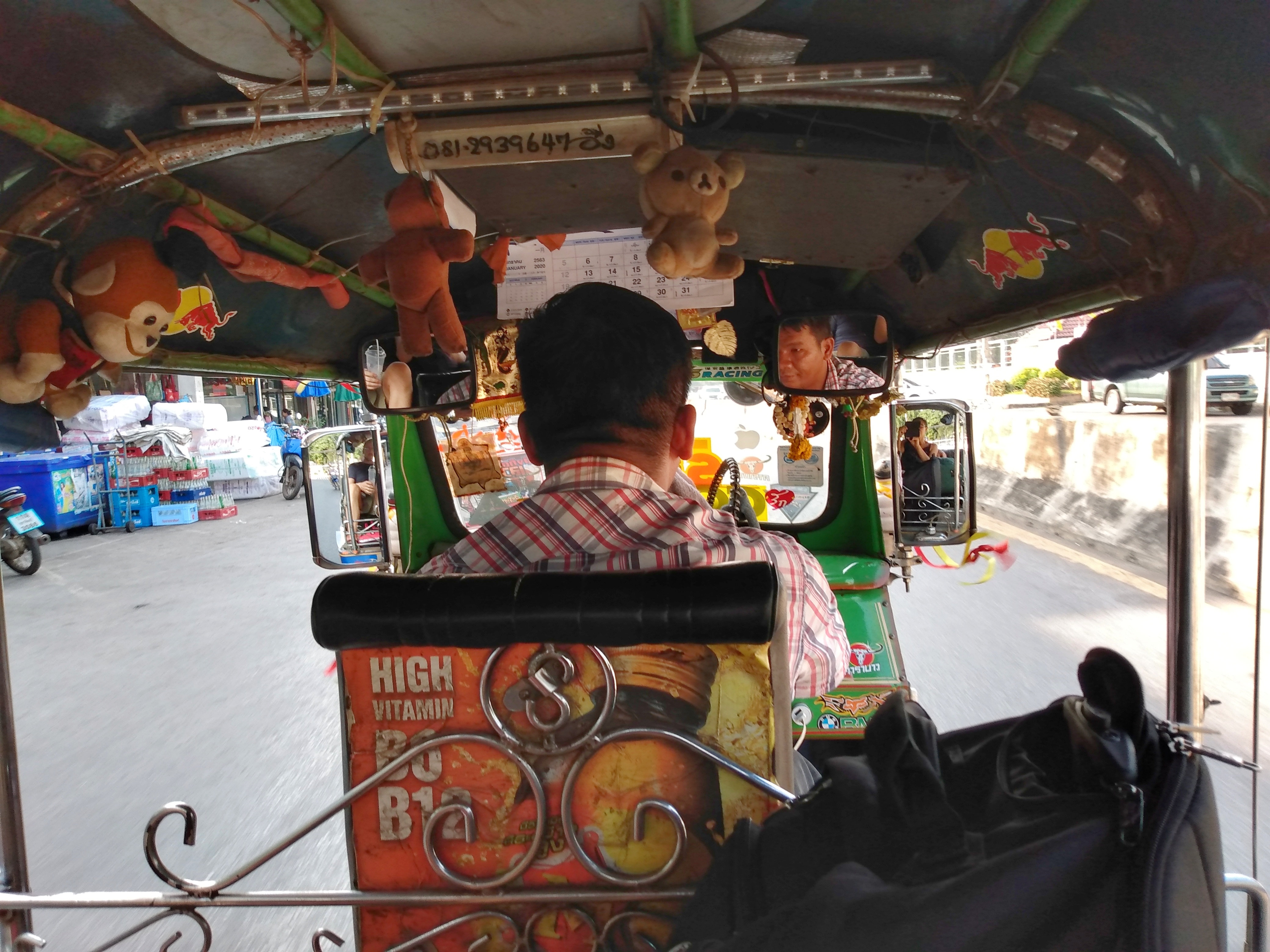 Busfahren in Bangkok, Fahren mit dem Zug, Taxi und Tuk-Tuk: An diesen beiden Tagen haben wir alles ausprobiert, was es an öffentlichen Verkehrsmitteln in Thailand gibt. Gestern haben wir einen Ausflug zu einem Einkaufszentrum in Bangkok gemacht. Die Nummer des Busses haben wir einfach mit Google Maps gefunden. An der Haltestelle freundlich winken, damit der Bus anhält, einsteigen, hinsetzen und warten, bis der Schaffner zum kassieren kommt. 30 Baht kostete die Fahrt im klimatisierten Bus. Für uns beide zusammen! Nahe des Einkaufszentrums wurden nach Sonnenuntergang zahlreiche Stände aufgebaut. Und dann waren wir mittendrin in einem der vielen Nachtmärkte von Bangkok. Wir schauten uns vieles an, aber natürlich nicht alles. Der Markt war viel zu groß. Zurück fuhren wir wieder mit dem Bus, diesmal allerdings mit offenen Fenstern. Daher auch nur 16 Baht für uns beide. Heute dann also mit dem Zug nach Prachin Buri. Die Tickets hatten wir uns in einem Reisebüro zusammen mit einer Tour in den kommenden Tagen bestellt und ins Reisebüro liefern lassen. Es wäre aber auch kein Problem gewesen, die Tickets direkt vor dem Einsteigen am Bahnhof zu kaufen. Zum Bahnhof fuhren wir mit dem Taxi, das wir einfach an der Straße angehalten hatten. Abgerechnet wurde nach Taxameter. Die knapp 4 km lange Strecke durch die Stadt dauerte etwa 20 Minuten und kostete 80 Baht. Der Zug hatte nur 3. Klasse, also keine Klimaanlage und keine Sitzplatzreservierung. Für die 2-stündige ca. 100 km lange Fahrt nach Prachin Buri zahlten wir denn auch nur 26 Baht pro Person. Absolut unglaublich. Der Zug fuhr pünktlich los und kam ebenso pünktlich in Prachin Buri an. Die Fahrt bei offenem Fenster war trotz der 36 Grad gut auszuhalten. Und dank unserer Kopfhörer verschwand auch der Lärm. Am Bahnhof begann das übliche Verhandeln mit den Tuk-Tuk-Fahrern. Für 8 km wollten sie zunächst 200 Baht haben, ließen sich dann aber auf 120 Baht herunterhandeln. Immer noch ein stolzer Preis, im Vergleich zur Zugfahrt, aber deutlich besser als Laufen bei 36 Grad.