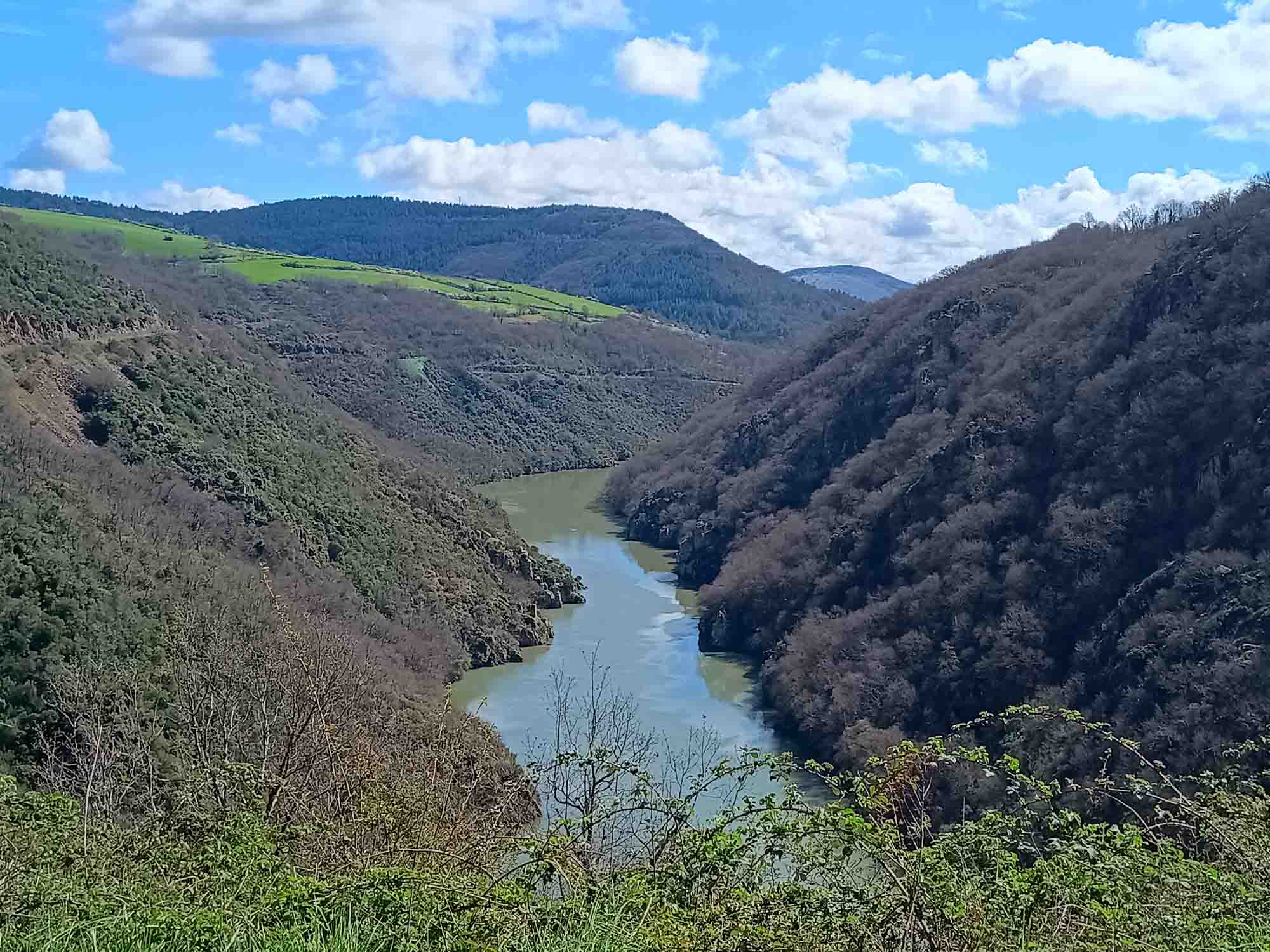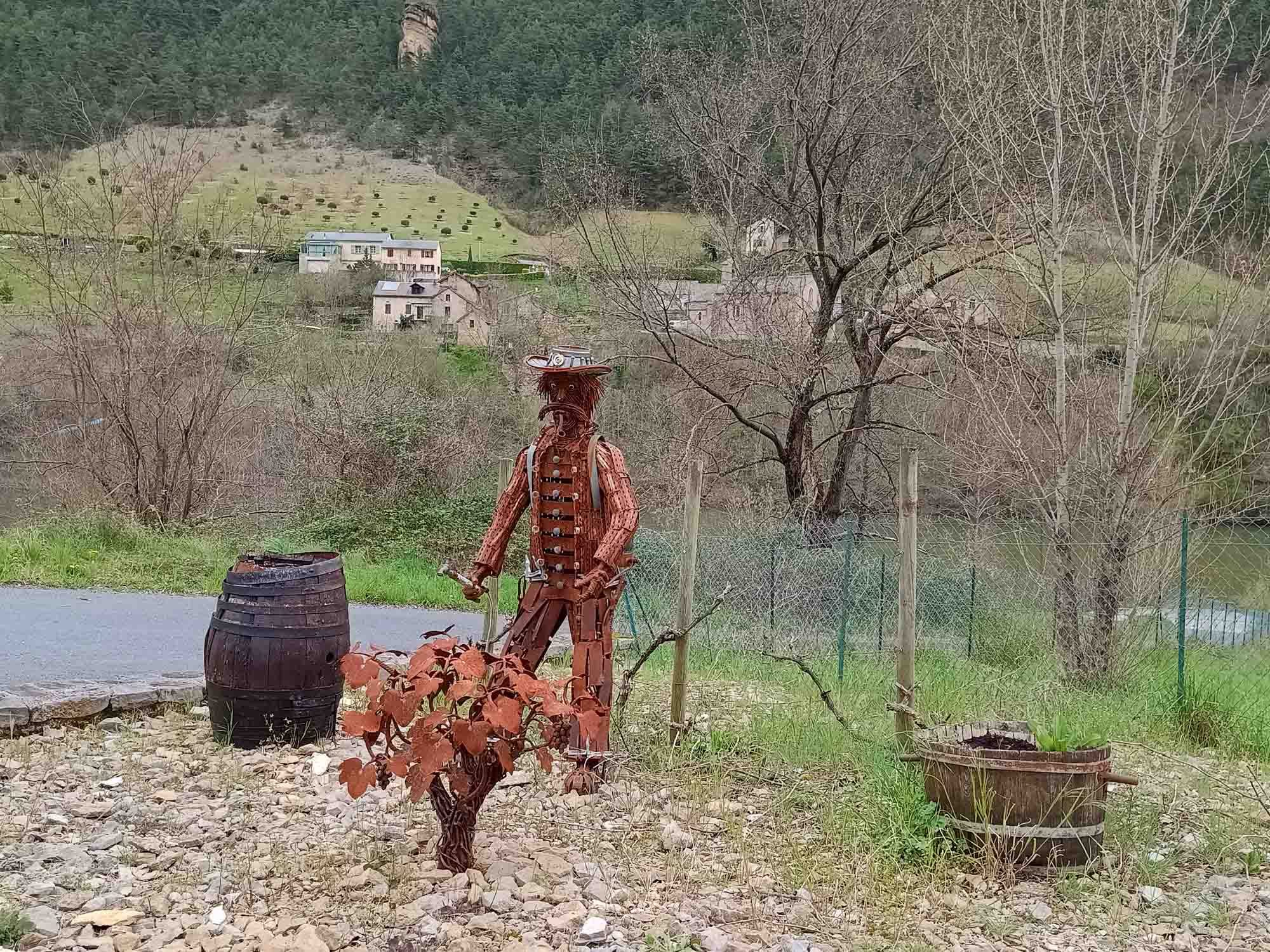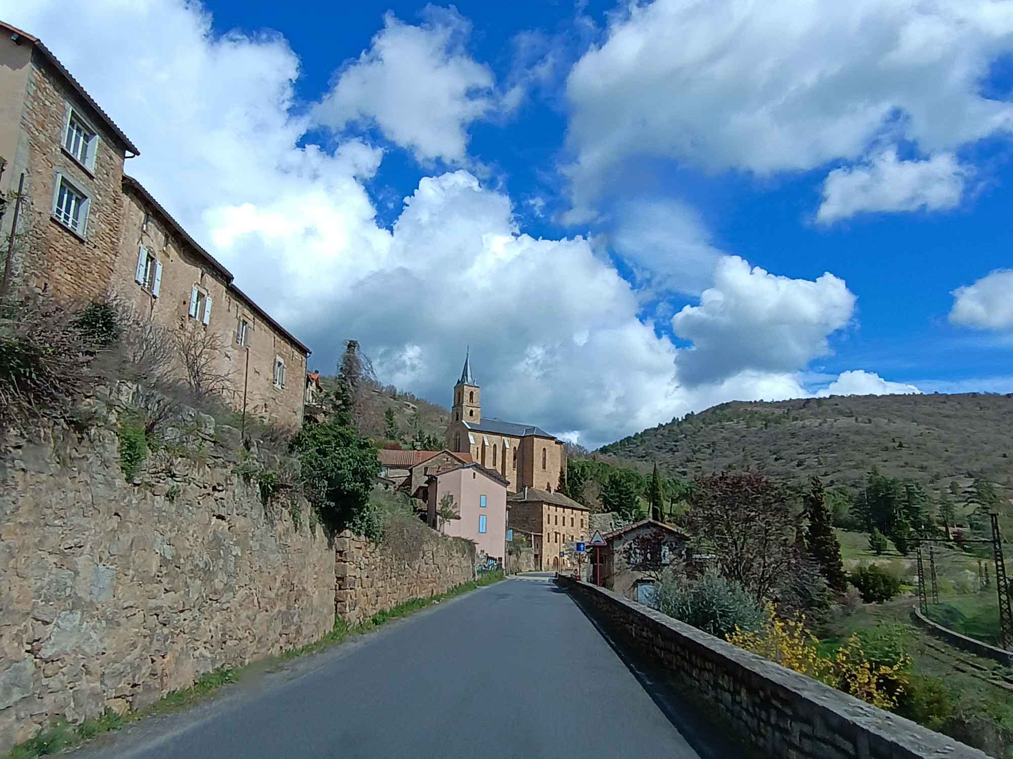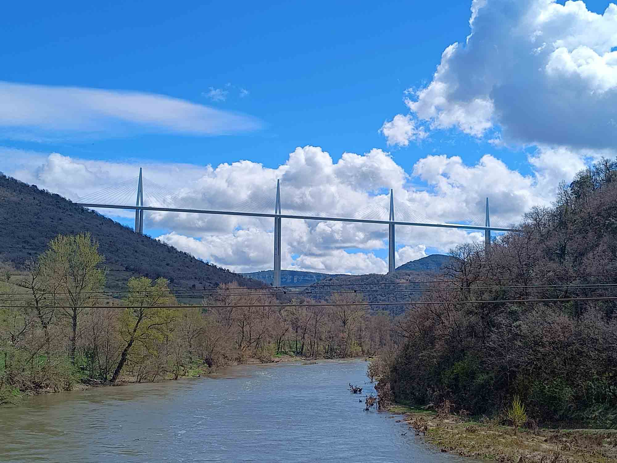 In der Nacht hatte es aufgehört zu regnen. Den Morgenspaziergang konnten wir wieder bei Sonnenschein machen. Wir schauten uns den Staudamm des Sees an, an dessen Ufer wir übernachtet hatten. Der See selbst war ziemlich leer und es standen zwei Angler am entgegengesetzem Ufer die versuchten, die letzten Fischer herauszuziehen. Der Stausee selbst diente als großer Speicher. An der Staumauer stand ein Pumpwerk, dass überschüssige Energie im Stromnetz nutzt, um Wasser in den See zu pumpen, das dann bei Energiebedarft rückwärts durch die Turbinen geleitet wird. Auf die dabei entstehenden Strudel wurde mit großen Warnschildern aufmerksam gemacht. Jegliches Schwimmen oder befahren des Sees war ausdrücklich verboten. Berta war heute beim Losfahren sichtlich entspannt und wir fuhren immer dem Flußlauf des Tarn folgend bis nach Millau. Dort schauten wir uns das gewaltige moderne Viadukt von Millau an, eine Autobahnbrücke, dessen Architekt Norman Foster war. Wir stellten uns vor, wie es wohl von oben aussehen musste und waren irgendwie doch froh unten zu sein. Anschließend fuhren wir mal wieder Einkaufen. Nicht allzu viel, da unser Kühlschrank nachts ja nicht mehr funktionierte. Danach ging es weiter dem Tarn flußaufwärts folgend durch die gleichnamige Schlucht. Die kleine Straße schlängelte sich wunderbar am Flußufer entlang, teils durch kleine Tunnel aber immer schön kurvig. Hin und wieder kam ein kleines Dörfchen. Unterwegs legten wir natürlich wieder eine kleine Kaffepause ein. Danach war es nicht mehr weit bis zu unserem Stellplatz. Dieser lag 3 km vom Tarn entfernt 800 m hoch in den Bergen der Cevennes. Es war diesmal sogar ein regulärer Platz. Bis auf das Wohnmobilschild gab es jedoch nichts besonders. Während unseres Spaziergangs sahen wir noch etliche Stellen mit Schnee, der allerdings schon sehr feucht war und vermutlich nicht mehr lange halten wird. Es sei denn, die Wetterprognose mit Neuschnee heute Nacht stimmt. Wir waren schon gespannt, wie es am nächsten Morgen aussehen wird.