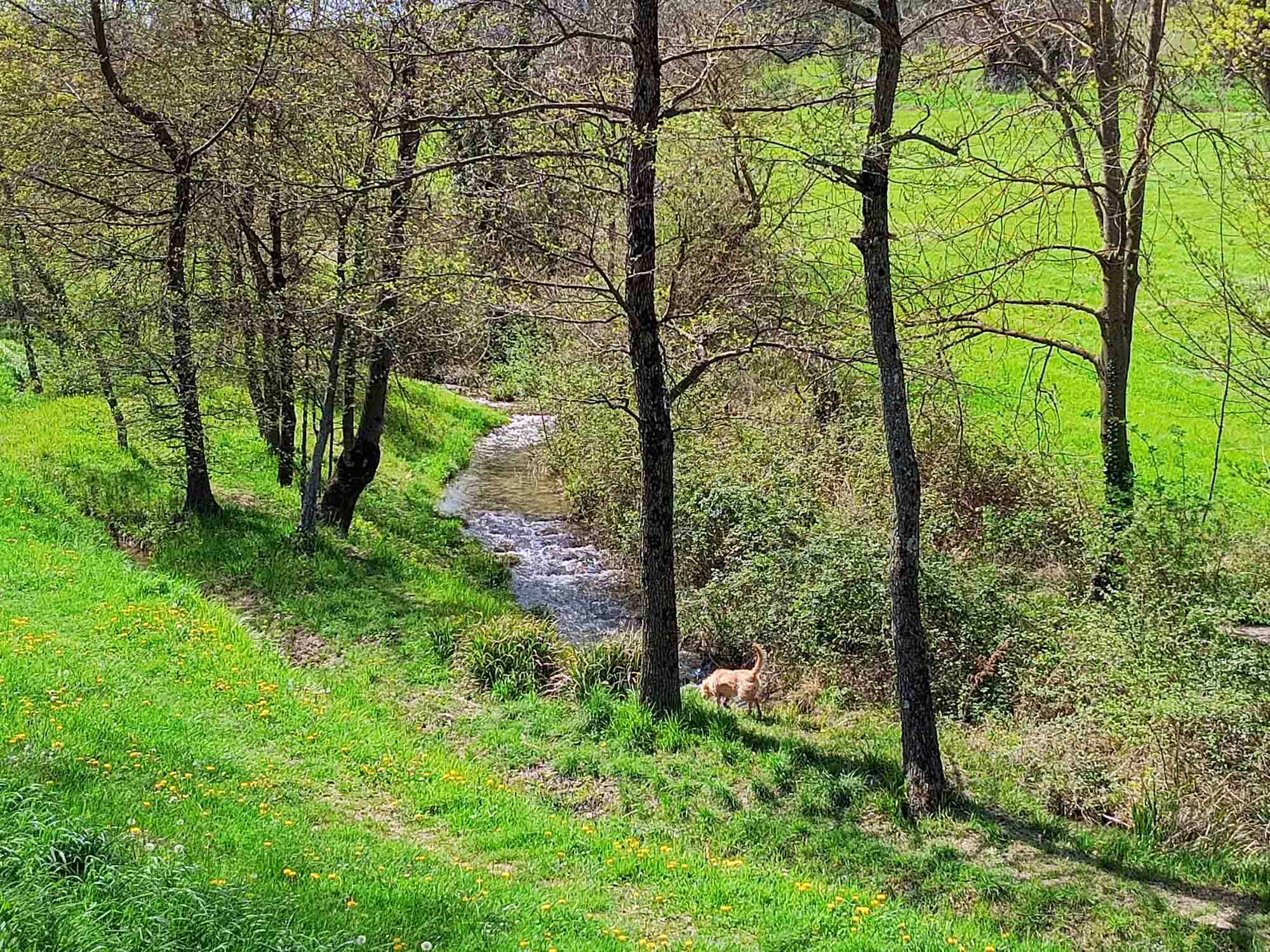 Wir standen etwas früher auf als gewöhnlich und machten mit Berta eine kleine Runde durch das einsame Dorf Eyzahut, in dem wir übernachtet hatten. Während des Frühstücks hörten wir dann tatsächlich dieses Plop, Pause, Plop, Pause, usw. Vater und Sohn übten sich auf dem Tennisplatz. Aber als wir losfuhren, waren die beiden schon wieder weg. Die Fahrt führte uns östlich der Rhone nordwärts entlang der dort etwas hügeligen Landschaft. Dort machten wir nach etwa eine Stunde an einem Bach unsere übliche Pause. Danach ging es zum Einkaufen nach Romans-sur-Isère und anschließend eine weitere Stunde bis zu unserem Ziel, einem Picknickplatz oberhalb von Bellegarde-Poussieu, das ca. 20 km südlich von Lyon liegt. Diesmal klappte alles sofort und auch das Alsterwasser war bei der Ankunft kalt genug. Es ar allerdings schon wieder spät geworden und nicht nur wir, sondern auch Berta hatten mehr Hunger als Lust auf einen Spaziergang. Nach dem essen legte sich Berta hin und erholte sich von der anstrengenden Fahrt und wir spielten noch ein wenig bis es kalt genug war, sich zurückzuziehen.