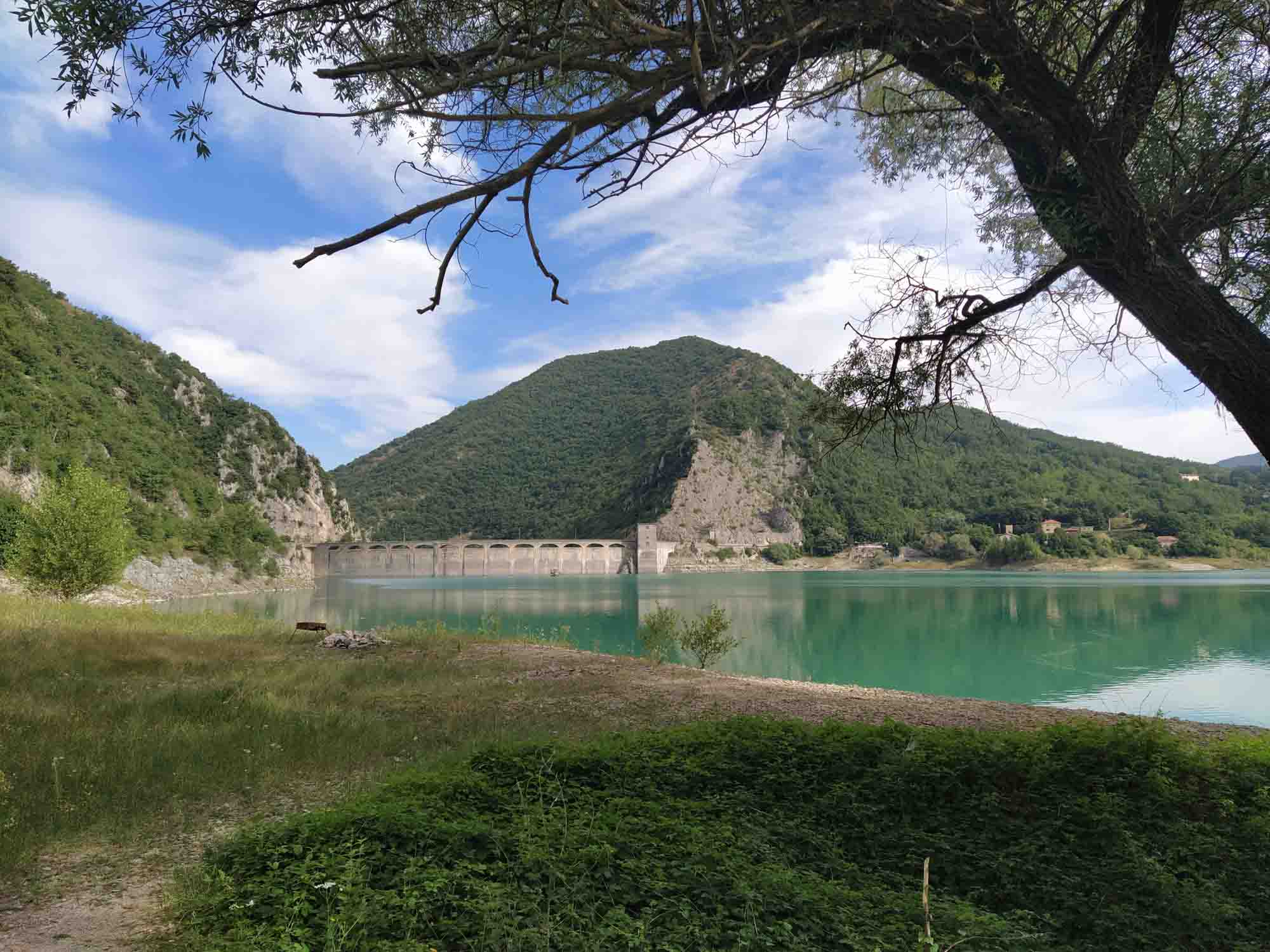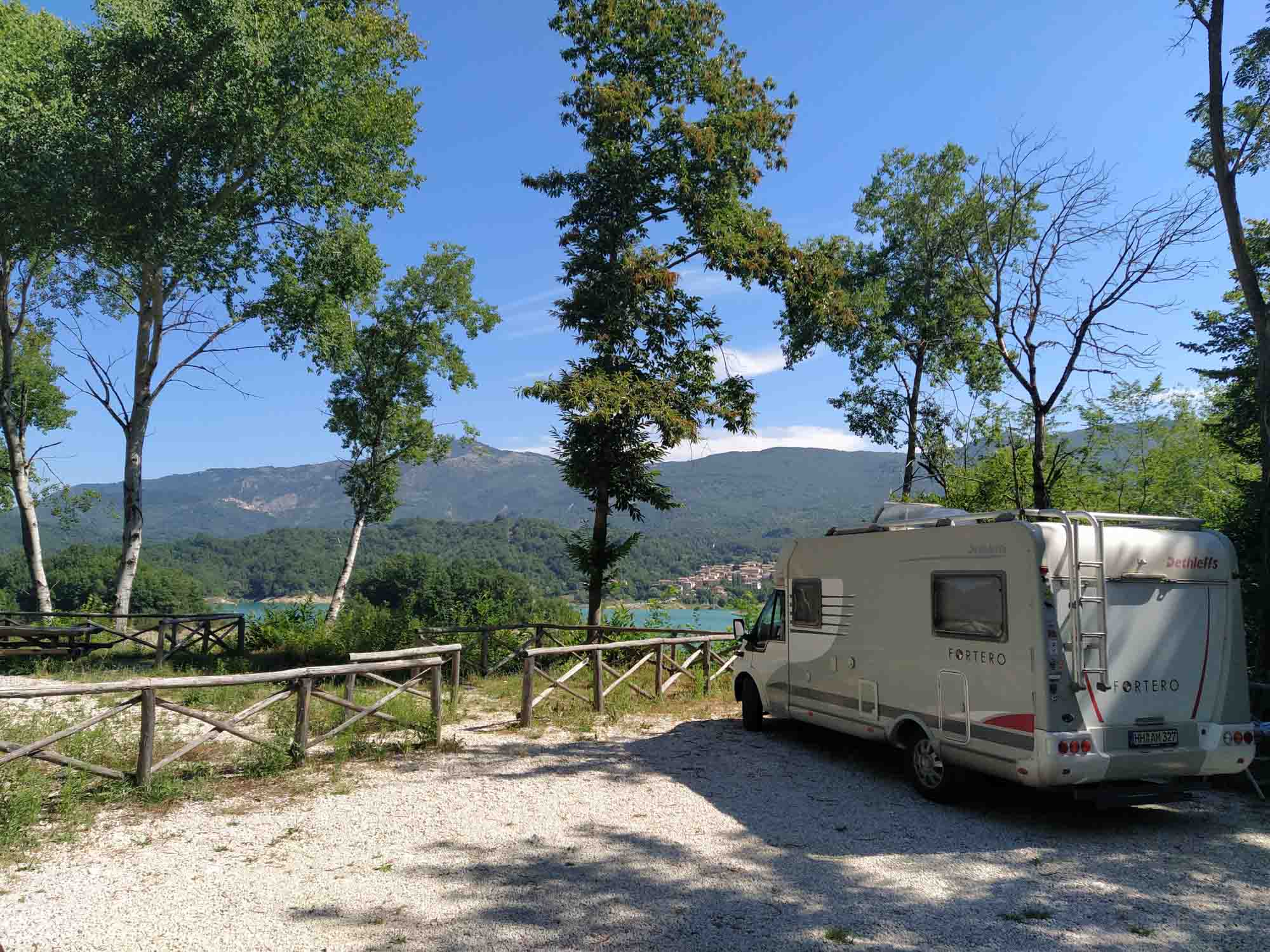Was für einen Unterschied ein paar Grad doch ausmachen können. In der Nacht war das Thermometer auf bis zu 20 Grad herunter gegangen und wir haben perfekt geschlafen. Um 17 Uhr war es draußen auch noch angenehm kühl und so kletterten wir mit Berta den Abhang zum See hinunter wo sie in aller Ruhe ausgiebig schnüffeln konnte. Danach gab es Frühstück und dann fuhren wir noch 5 km weiter bis wir unseren eigentlichen Stellplatz erreichten. Dies war ein wunderschöner kleiner Picknickplatz mit einem tollen Ausblick über den See, den wir für den restlichen Tag ganz für uns alleine hatten. Anfangs standen wir noch im Schatten der Bäume und später fuhren wir die Markise aus und machten uns unseren eigenen Schatten. So verbrachten wir mal wieder einen entspannten Tag draußen und auch Berta konnte sich ein bisschen von dem anstrengenden gestrigen Tag erholen.