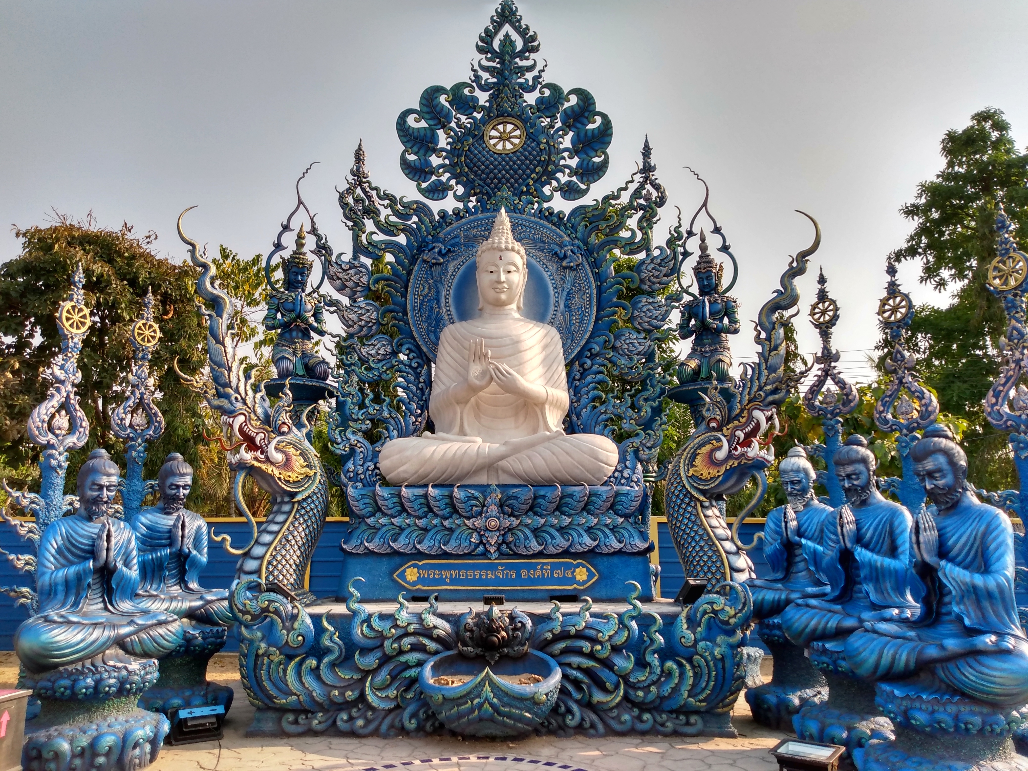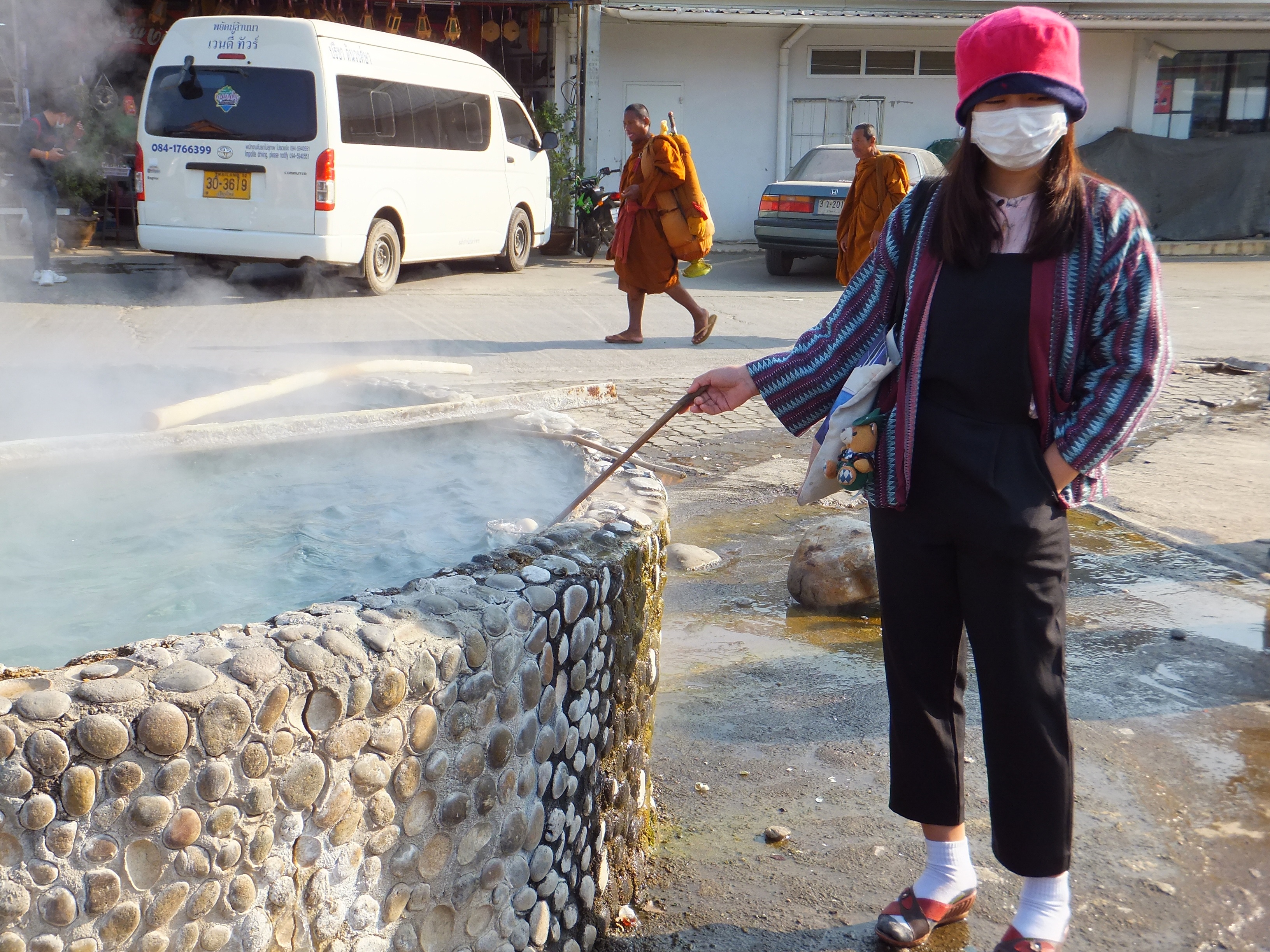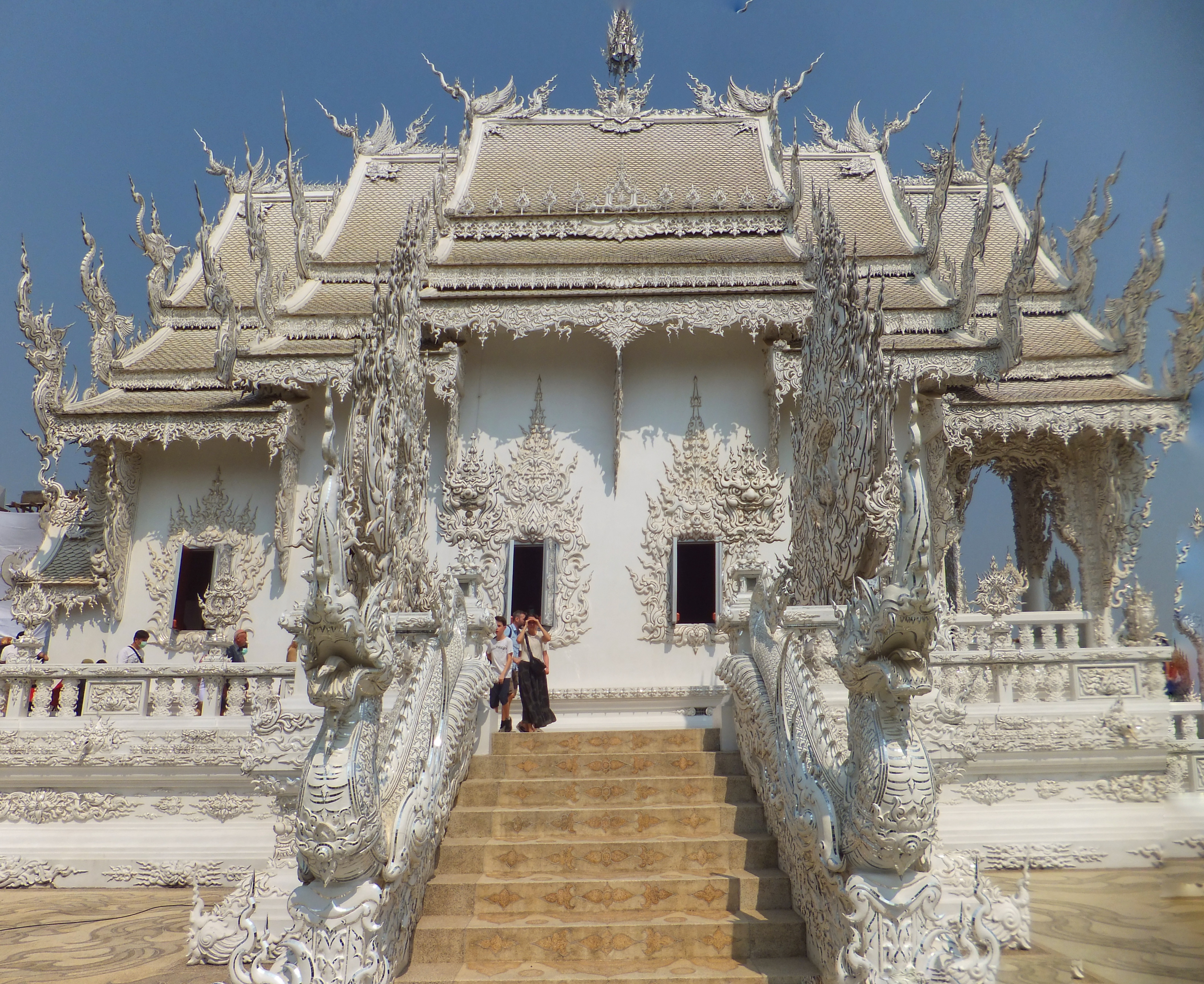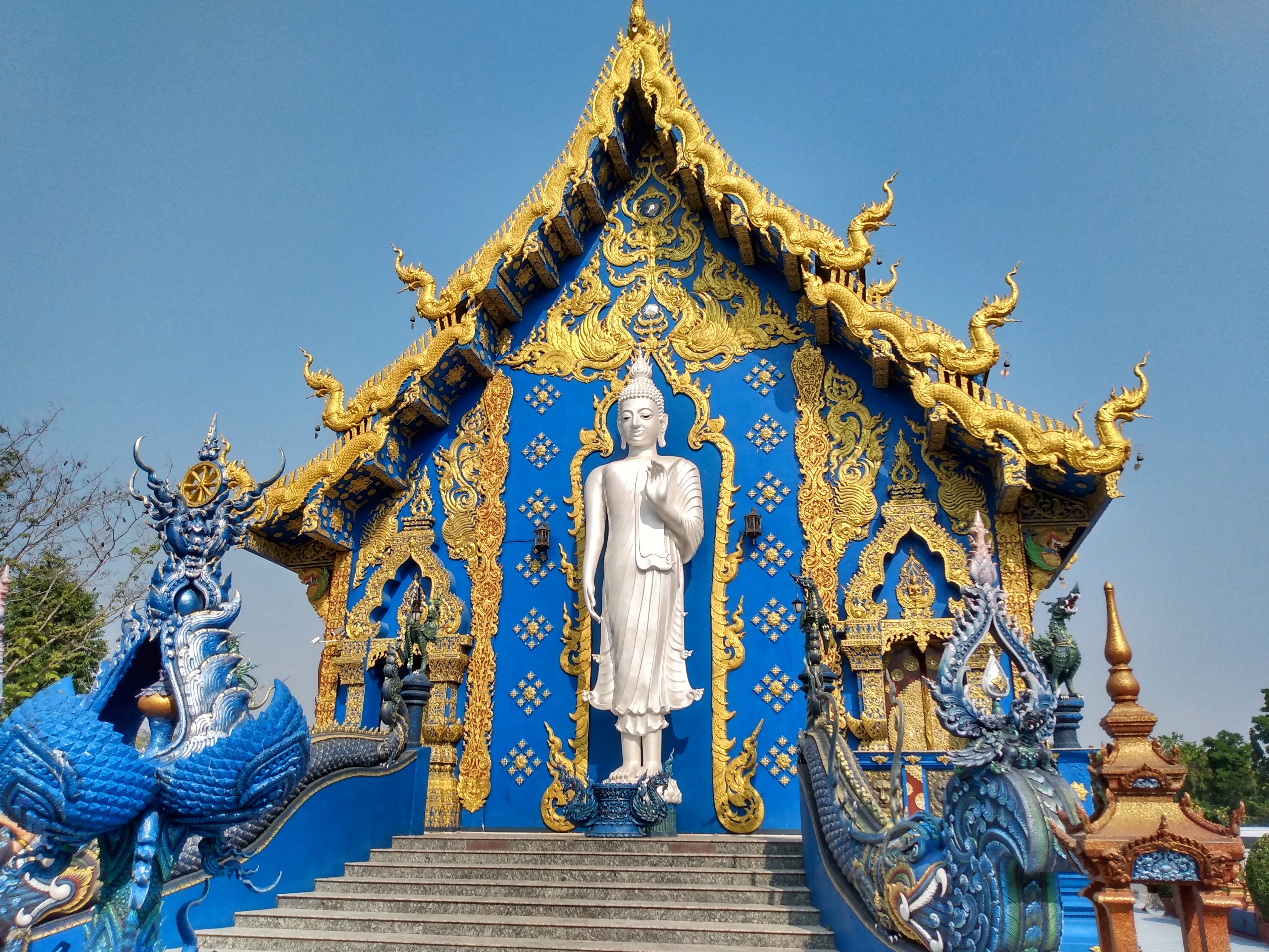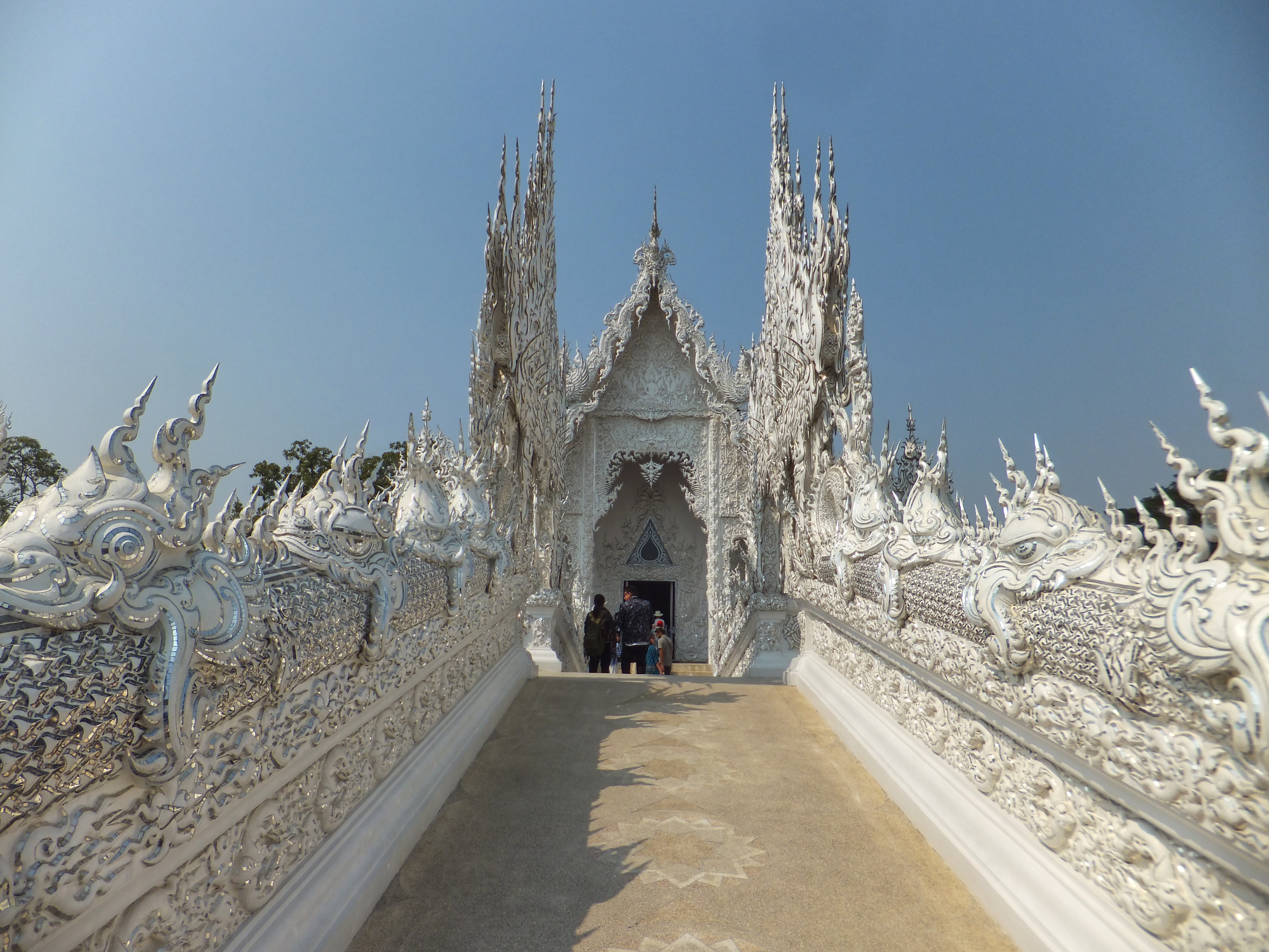 Wie immer pünktlich wurden wir um kurz nach 7:00 Uhr im Hotel abgeholt. Nachdem die anderen Gäste ebenfalls eingesammelt worden sind, fuhren wir mit einem kurzen Stopp nach Mae Kachan Hot Spring and Geyser, bestaunten das Kochen von Eiern im 90 Grad heißen Wasser und ließen uns dann zum weißen Tempel nach Chiang Rai fahren. Die Fahrt war etwas abenteuerlich vor allem wegen der abrupten Fahrweise unseres jungen Fahrers. Unentwegt musste er an den unmöglichsten Stellen überholen, nur um dann hart zu bremsen und erneut kräftig zu beschleunigen. Um 11:00 Uhr waren wir in Chiang Rai angekommen. Die Gruppe hatte sagenhafte 40 Minuten an diesem atemberaubenden Tempel. Wir hatten mit dem Guide besprochen, wo er uns Abends wieder in Chiang Rai abholen sollte. So schauten wir uns den Tempel in aller Ruhe an, aßen hier noch ein kleines Mittagessen und blieben so etwas mehr als 4 Stunden hier. Dann ließen wir uns von einem Taxi zum blauen Tempel fahren und waren überrascht, dass uns auch dieser Tempel noch einmal beeindrucken konnte. Zur verabredeten Zeit fuhren wir wieder mit dem Taxi, kauften im Einkaufszentrum noch eine Kleinigkeit ein und dann ging es auch schon wieder die 3 Stunden zurück nach Chiang Mai. Die anderen taten uns ein bisschen mehr leid, hatten sie doch den ganzen Tag hauptsächlich im Minivan verbringen müssen. Etwas schlecht war uns trotzdem, als wir um 21:30 wieder im Hotel waren. Wir schlenderten noch über den nahegelegenen samstäglichen Nachtmarkt ehe wir dort noch zu Abend aßen und anschließend todmüde ins Bett fielen.