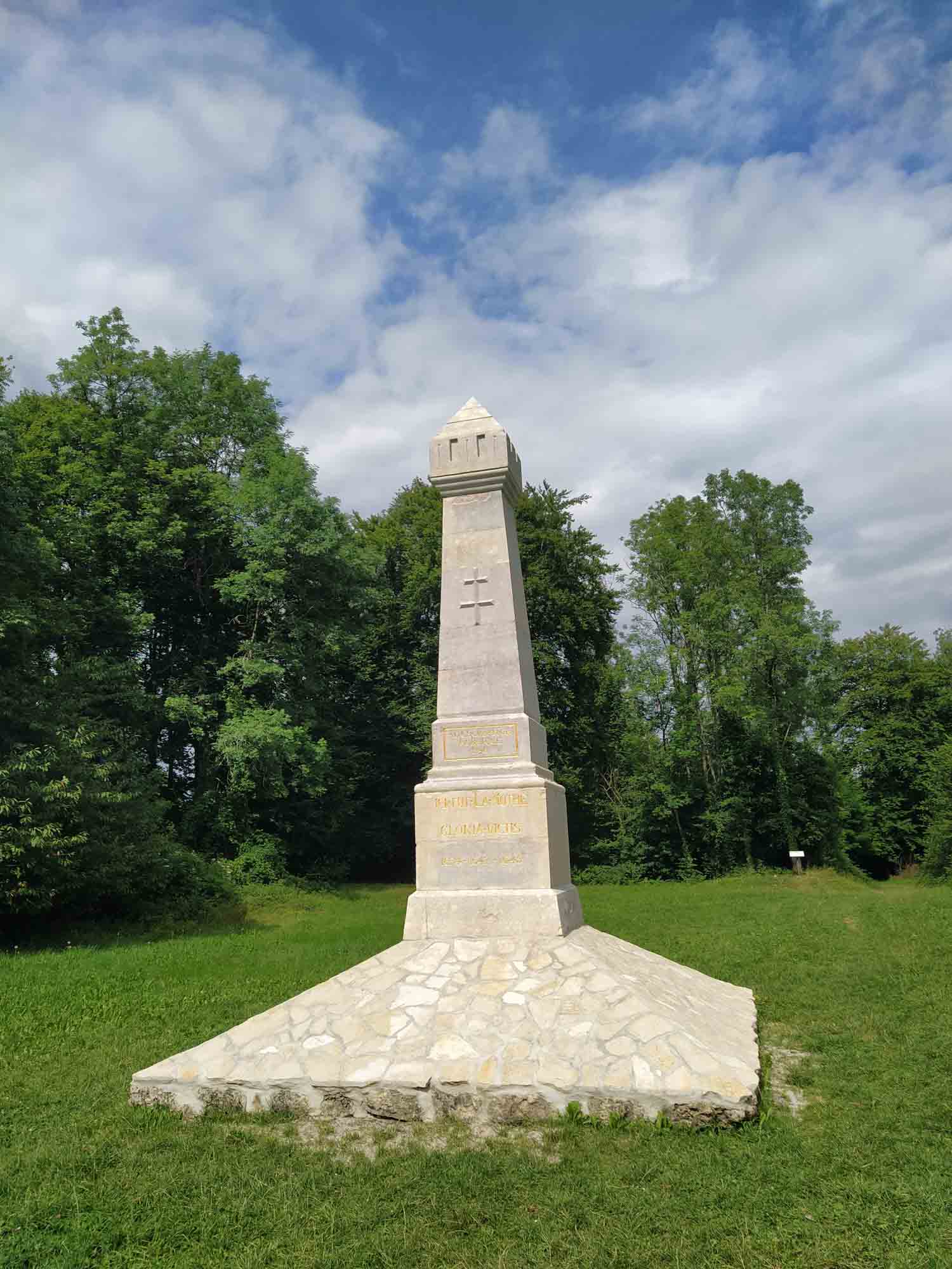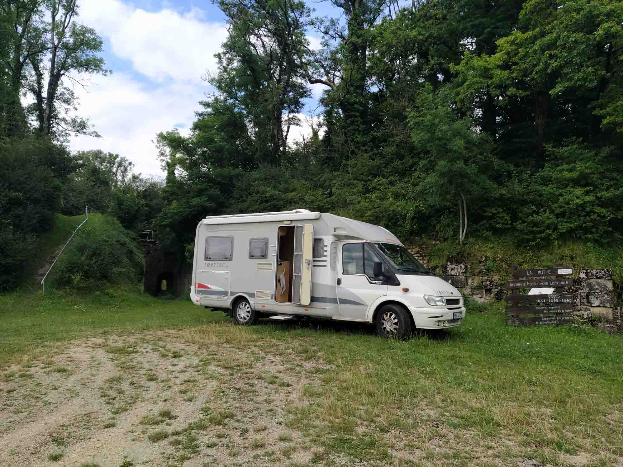 Wir ließen es morgens ganz geruhsam angehen und saßen noch lange draußen an einem Picknicktisch wo wir auch gefrühstückt hatten. Berta lag natürlich darunter. Gegen 10 Uhr war es dann aber doch soweit und wir fuhren wieder los. Nach einer halben Stunde verließen wir die schöne bergige Landschaft und fuhren durch eher langweilige flache Ackerflächen. Der Mais stand kräftig auf einigen Feldern während die Weizenfelder schon abgeerntet waren. Übrig war nur das Stroh, das in großen runden Ballen auf den Stoppelfeldern lag. Nach einer Stunde kamen wir an einem Supermarkt vorbei, wo wir noch ein paar Einkäufe für die nächsten Tage erledigten. Nach einer weiteren Stunde Fahrt legten wir auf einem Rastplatz an der Straße eine kleine Pause ein, die Berta sofort zum Schlafen nutzte. Danach fuhren wir noch eine halbe Stunde weiter bis nach Jussey, um auf einem kostenlosen Wohnmobilstellplatz unser Abwasser zu entsorgen. Aber was für ein Glück: Obwohl es Frischwasser nur mit Jetons gab, funktionierte der Hahn und so bekamen wir sogar kostenloses Trinkwasser. Wir brauchten zwar nur 20 l. Aber was solls. Bleiben wollten wir hier aber nicht. Der asphaltierte Platz lag direkt an der Straße. Also fuhren wir weiter und eine knappe Stunde später erreichten wir, mal wieder über eine kleine einspurige Straße, unser heutiges Ziel, die Zitadelle von Mothe. Von der Zitadelle ist außer einer Erinnerung und einer Karte, wie sie mal ausgesehen hat, nicht mehr viel zu sehen. Aber wir hatten einen tollen Platz und nachdem sich Berta ausgeschlafen hatte, genossen wir einen Spaziergang über den grünen überwucherten Berggipfel, auf dem einst eine Zitadelle nebst Schloss gestanden hatte. Nachdem wir zurück waren, fing es an zu regnen und wir mussten für einige Zeit die Tür zumachen. Aber so schnell wie das Tröpfeln begann, hörte es auch wieder auf und den restlichen Abend konnte die Tür wieder aufbleiben.