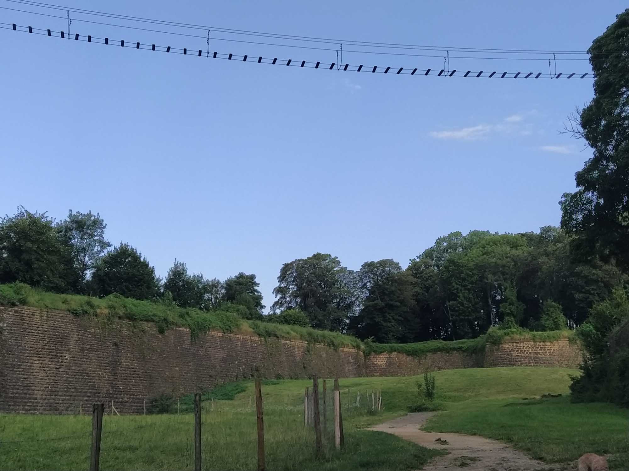 Der Tag begann früh und sonnig. Natürlich machten wir als erstes einen Spaziergang und entdeckten, dass wir unmittelbar an einer alten Zitadelle standen. Unter den hochaufragenden Mauern des gigantischen Bauwerks grasten sogar Schafe aus der Bretagne, für die sich Berta allerdings überhaupt nicht interessierte. Tagsüber erkundeten wir das gesamte Areal und hätten gerne den Kletterwald ausprobiert, dessen Highlight eine Art Brücke über den Zitadellengraben war. Schade nur, dass der Kletterwald nicht mehr in Betrieb war. Es wurde unglaublich heiß. Gegen Mittag waren es 33 Grad im Schatten. Allerdings hatten wir keinen, da der Stellplatz ein großer asphaltierter Platz ohne jeden Baum war. Daher konnten wir auch weder die Markise aufspannen noch einen Stuhl herausstellen. Auch wenn der Parkplatz in einer Tempo 30 Zone lag, nützte das relativ wenig, da sich viele der vorbeifahrenden nicht daran hielten. So war es dann bis in die späten Abendstunden relativ laut. Es blieb uns aber angesichts der Temperaturen (selbst um 22 Uhr hatten wir noch 33 Grad im Wagen) nicht möglich, die Türen und Fenster zu schließen. Aber irgendwann wurde es doch etwas kühler und gegen 1 Uhr war es endlich kühl und ruhig genug, dass wir schlafen konnten.