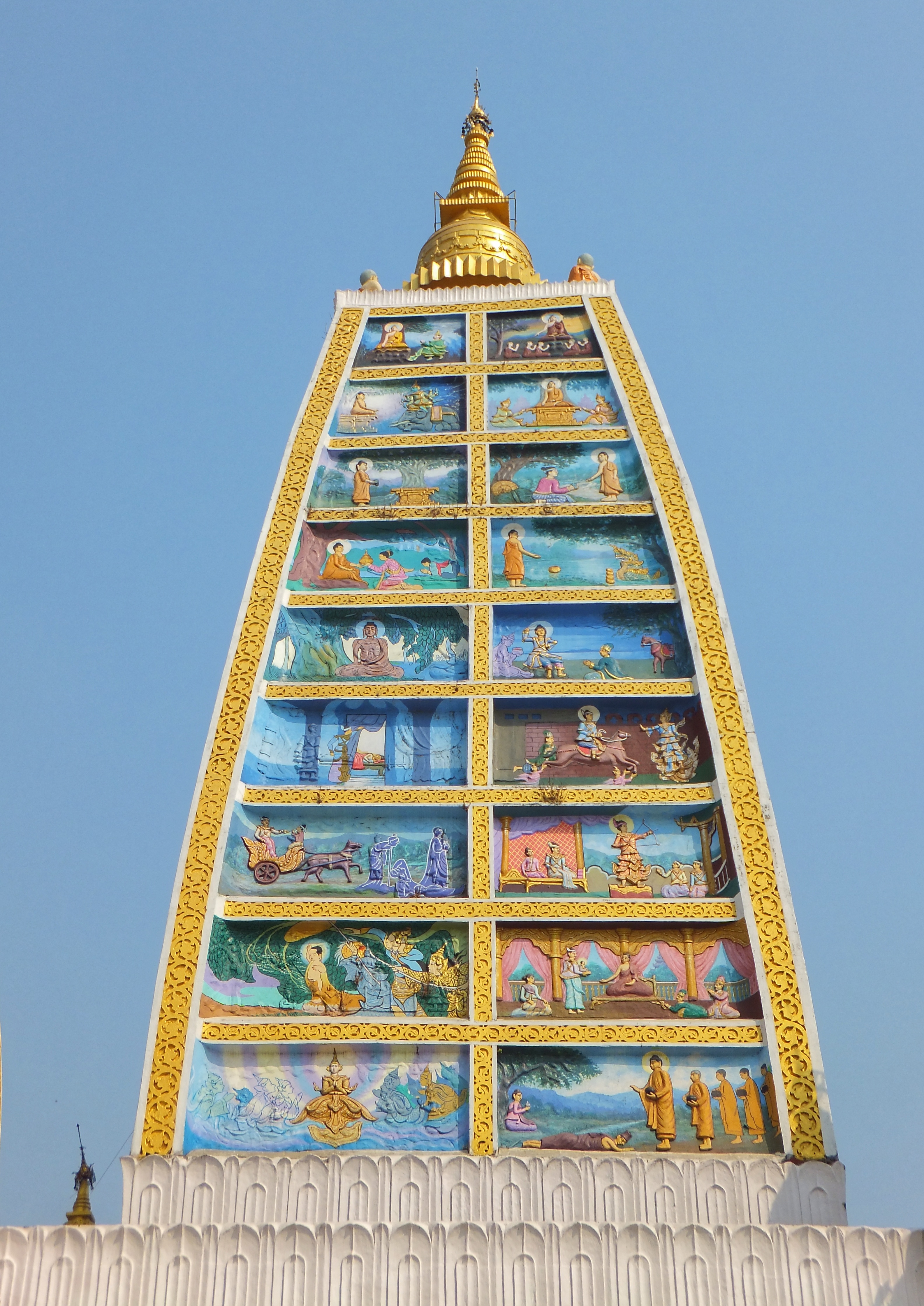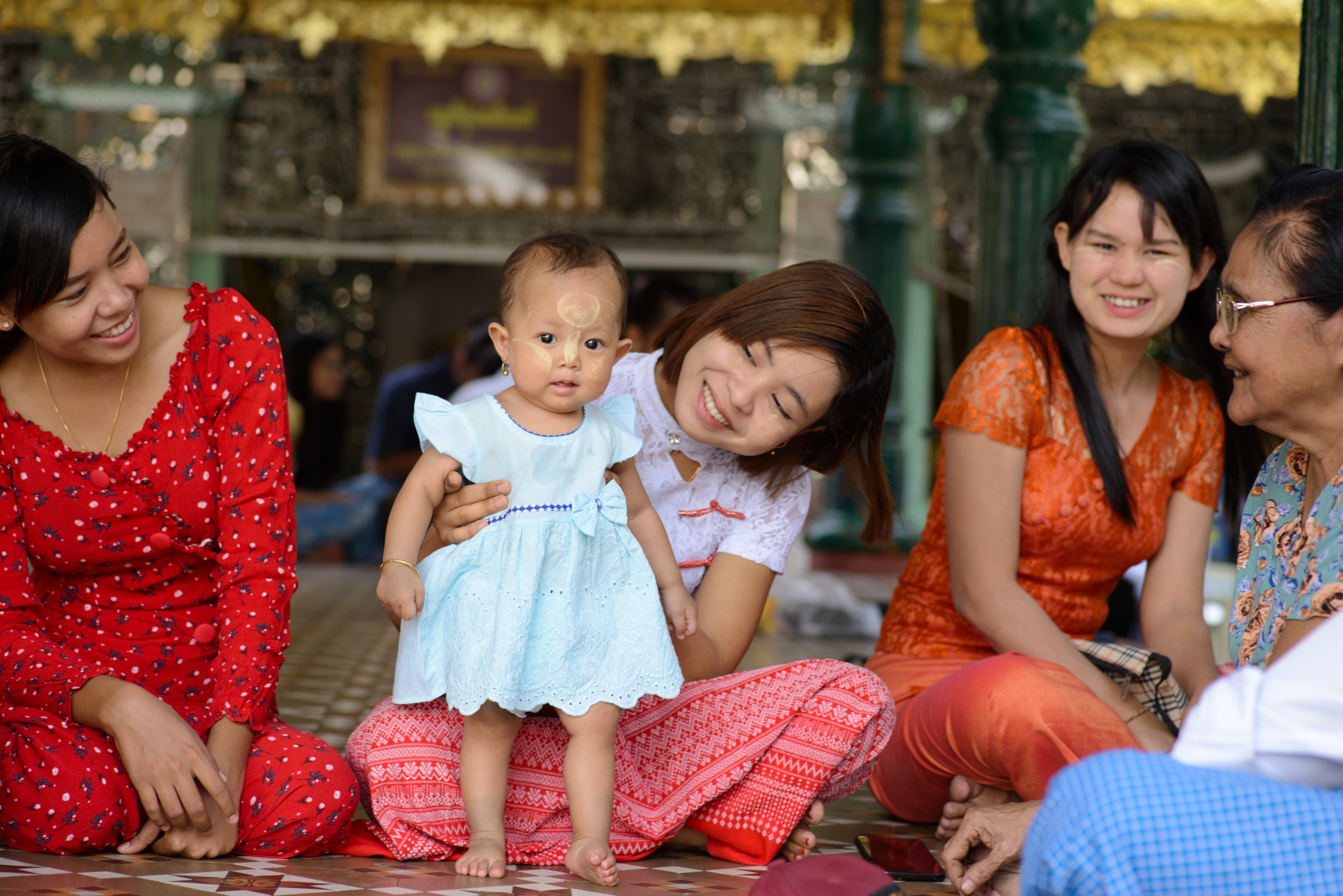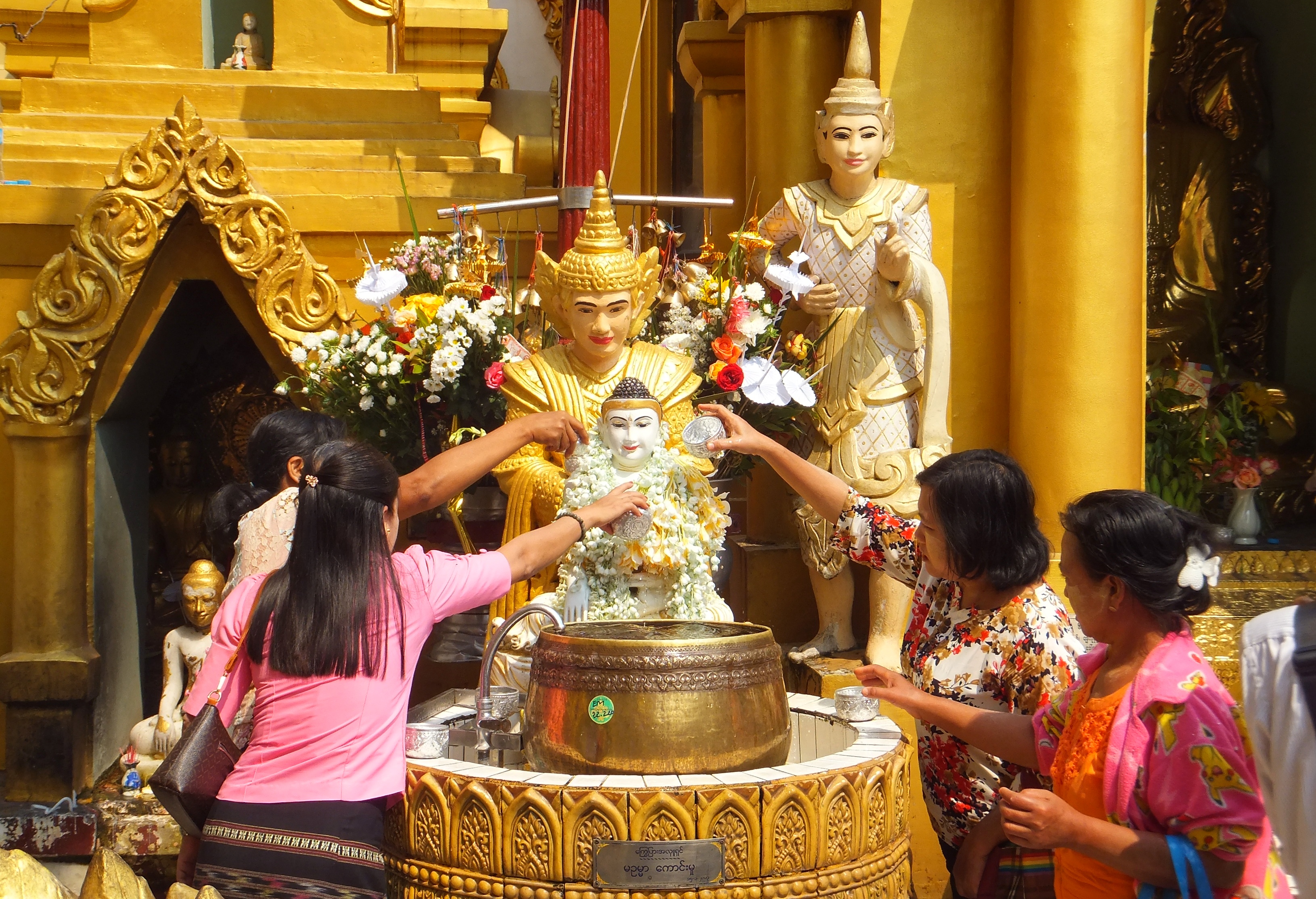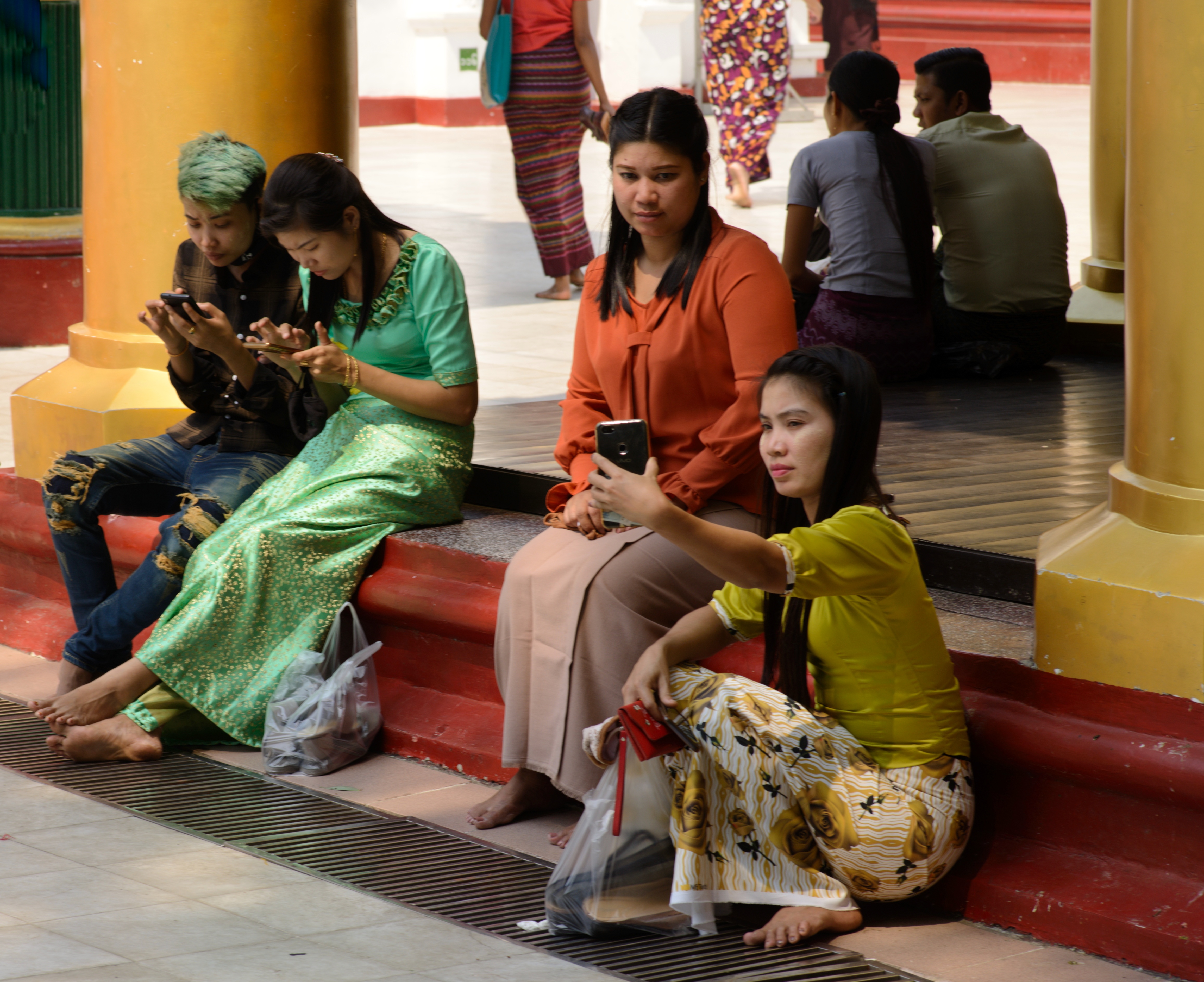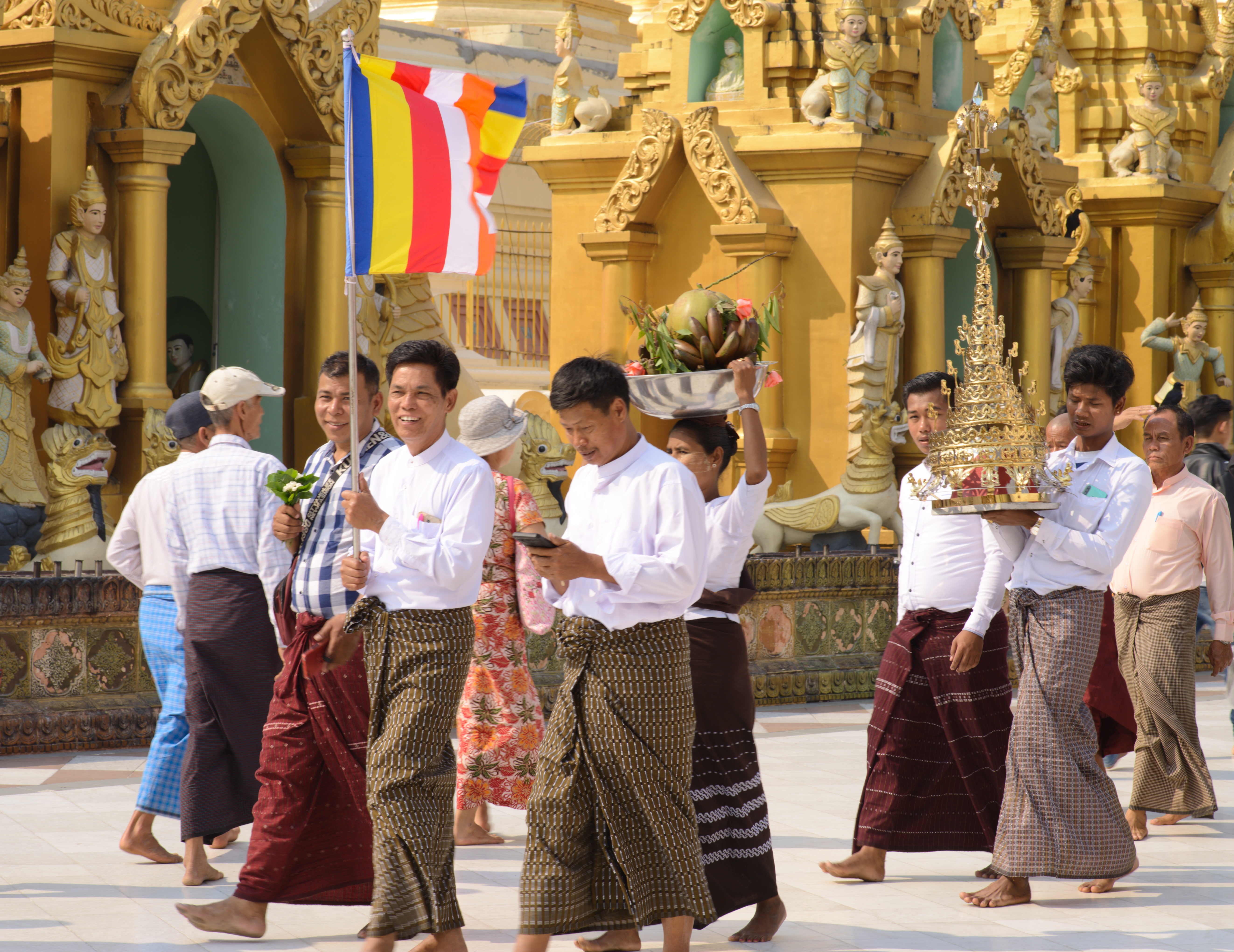 Heute machten wir uns auf, die Stadt zu erkunden. Wir nutzten den Shuttle-Service des Hotels und wurden direkt zur Shwedagon Pagode gefahren. Diese Pagode ist die größte uns schönste in ganz Myanmar und zieht Pilger aus dem ganzen Land an. Auch wir waren überwältigt von diesem Ort und genossen die friedliche Atmosphäre bei einem geruhsamen Rundgang um die Pagode herum. Es war sehr heiß und gelegentlich setzten wir uns hin und beobachteten die vorbeilaufenden Leute. Auch wir wurden beäugt und oft fotografiert. Zum einen, weil sich nicht viele Europäer hierher verirren, zum anderen weil sie begeistert sind, wie kunstvoll Michi seinen Longhi drapiert hat.