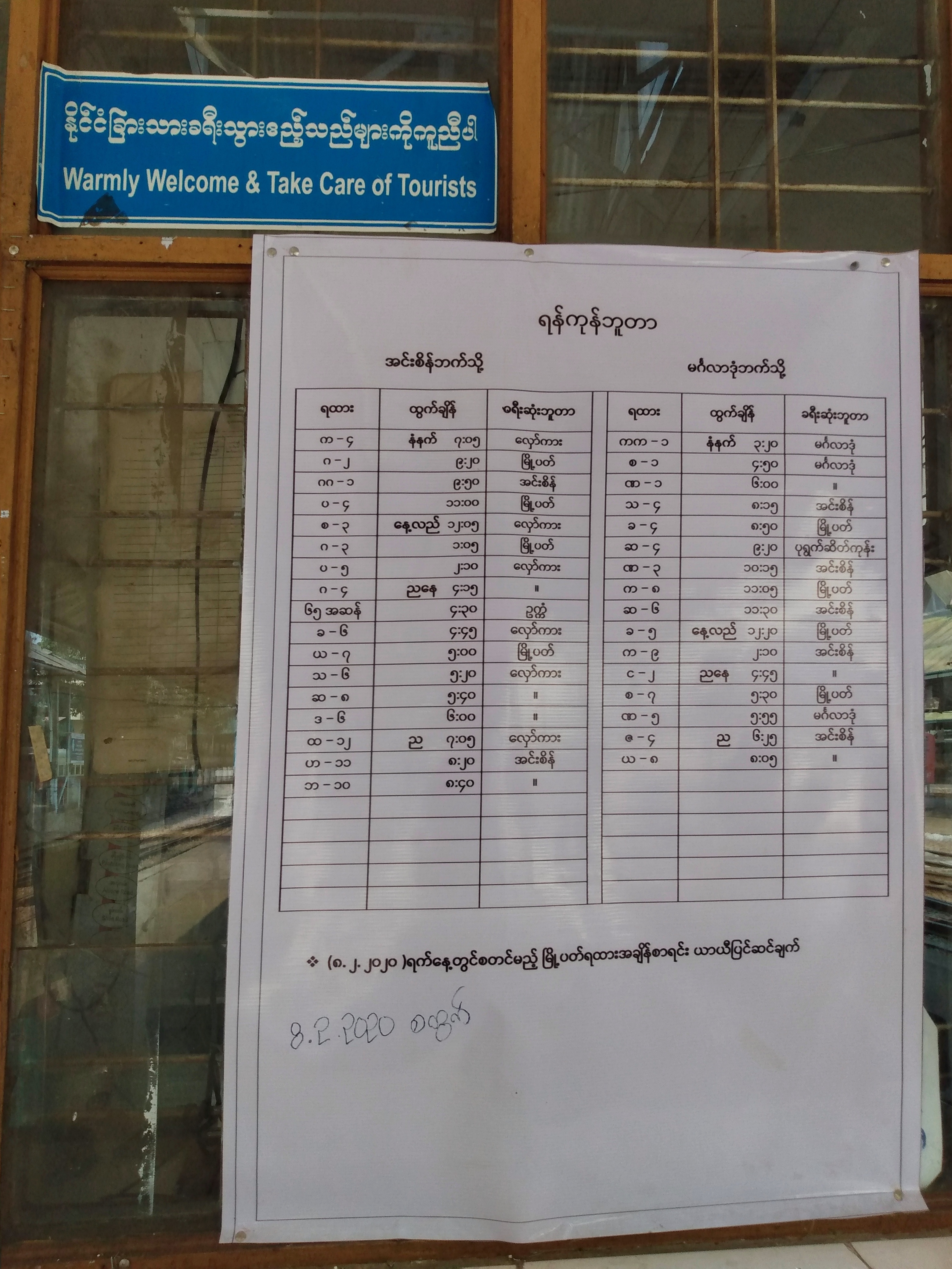 Nach dem Auschecken – das Gepäck ließen wir noch an Bord – spazierten wir zu dem Markt, den wir vor zwei Tagen schon einmal besucht hatten. Unterwegs fuhren wir im Sakura-Tower in die oberste Etage. Leider machte die Bar in der Dachterasse erst um 17:30 Uhr auf. Den Ausblick über die Stadt konnten wir so nur durch die Fenster des Lokals in der obersten Etage erhaschen. Wir gingen also weiter zu dem Markt. Danach holten wir unser Gepäck vom Schiff ab. Es war zufällig kurz vor drei, und wir fragten noch einmal nach dem Shuttle. Und tatsächlich hatten wir Glück und wurden von dem Fahrer direkt zum Hauptbahnhof von Yangon gefahren. Die Tickets für den Circular Train bekamen wir auf dem Bahnsteig von Gleis 6 und 7. Unser Zug in Richtung Osten fuhr jedoch von Gleis 4 ab. Wie alle anderen gingen wir über die Gleise zu unserem Zug. Wir mussten noch ein wenig warten, dann fuhr er jedoch pünktlich um viertel vor fünf los. Ein Teenager, der mit seiner Mutter unterwegs war, bot uns seinen Platz an, damit wir zusammen sitzen konnten. Das Angebot nahmen wir gerne an. Der Zug fuhr sehr sehr langsam und wurde von Station zu Station voller. Es war interessant das Geschehen im Zug zu beobachten. Es wurden Teppiche eingeladen und an der richtigen Station, wo schon etliche andere Teppiche standen von aussteigenden Passagieren auf den Bahnsteig gestellt. Eine junge Frau stand neben uns und gab ihre Handtasche für die Dauer ihrer Fahrt dem uns gegenüber sitzenden Teenager. Als sie ausstieg nahm sie die Tasche wieder an sich. Das beste war jedoch eine Frau, die ihr Baby einem offensichtlich Fremden in den Schoß setzte und erst wieder zurücknahm, als sie ausstieg. Und all das ohne jede Kommunikation. Wir stiegen gemeinsam mit dem Jungen aus, der uns dann noch ein Taxi organisierte, mit dem wir uns zum Busterminal fahren ließen. Dort aßen wir noch zu Abend ehe wir mit dem Nachtbus nach Hpa-An fuhren. Dort mussten wir die letzten Kilometer mit dem Taxi zum Hotel fahren, wo wir um drei Uhr morgens ankamen. Obwohl wir erst für den nächsten Tag gebucht hatten, bekamen wir wie selbstverständlich schon unser Zimmer und konnten uns erstmal gründlich ausschlafen. Auch dieser Tag zeigte uns, wie hilfsbereit die Burmesen sind.