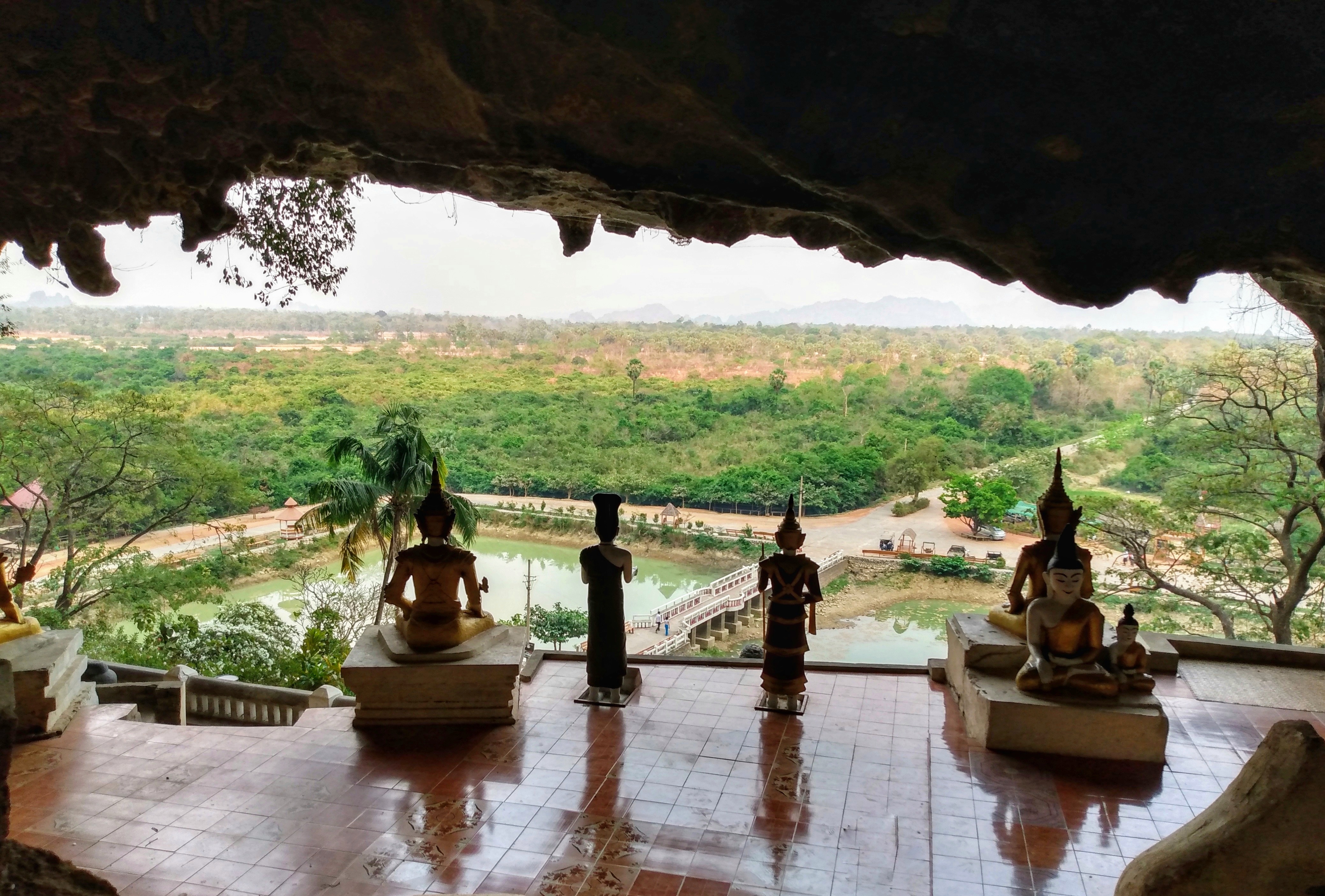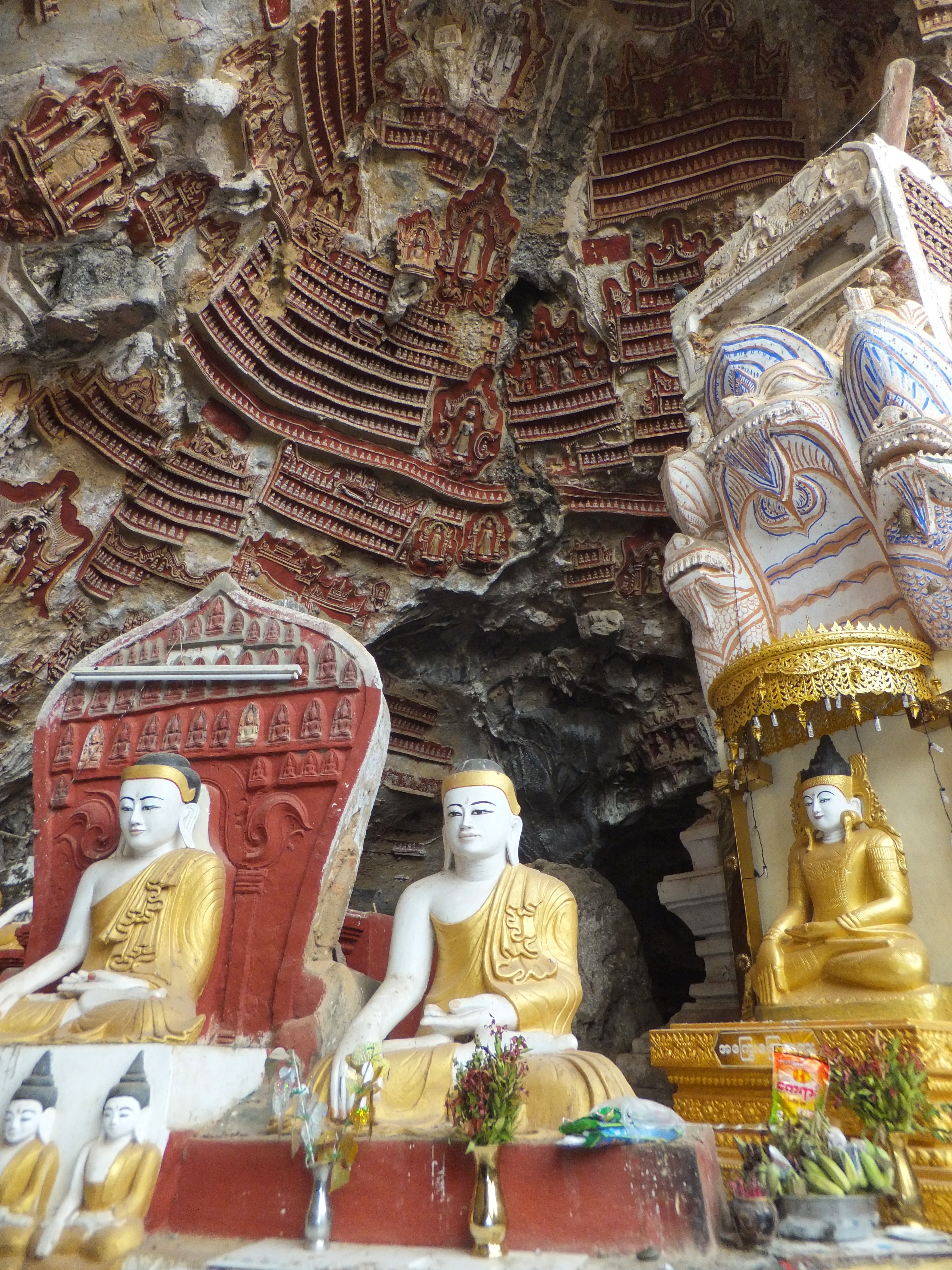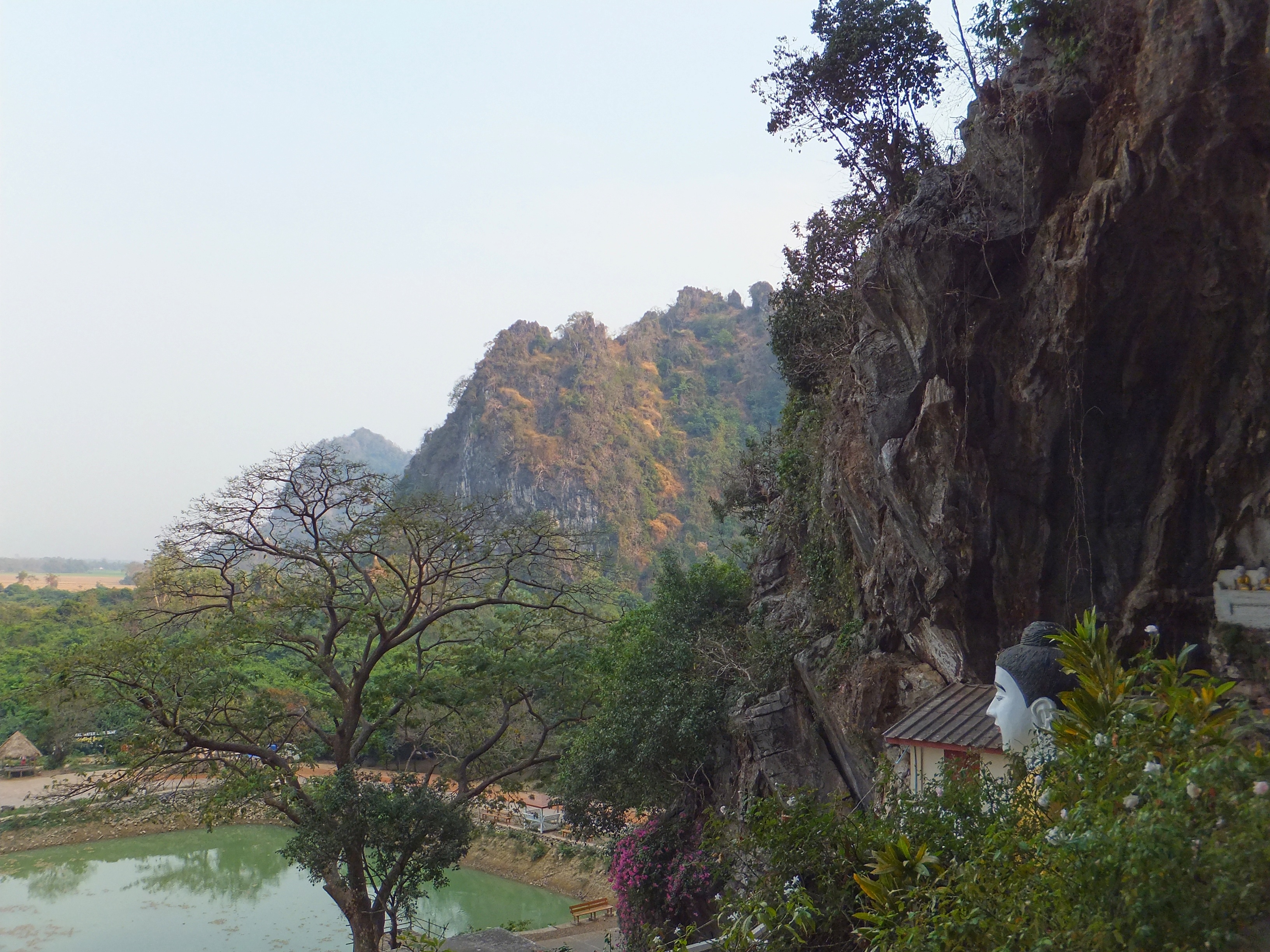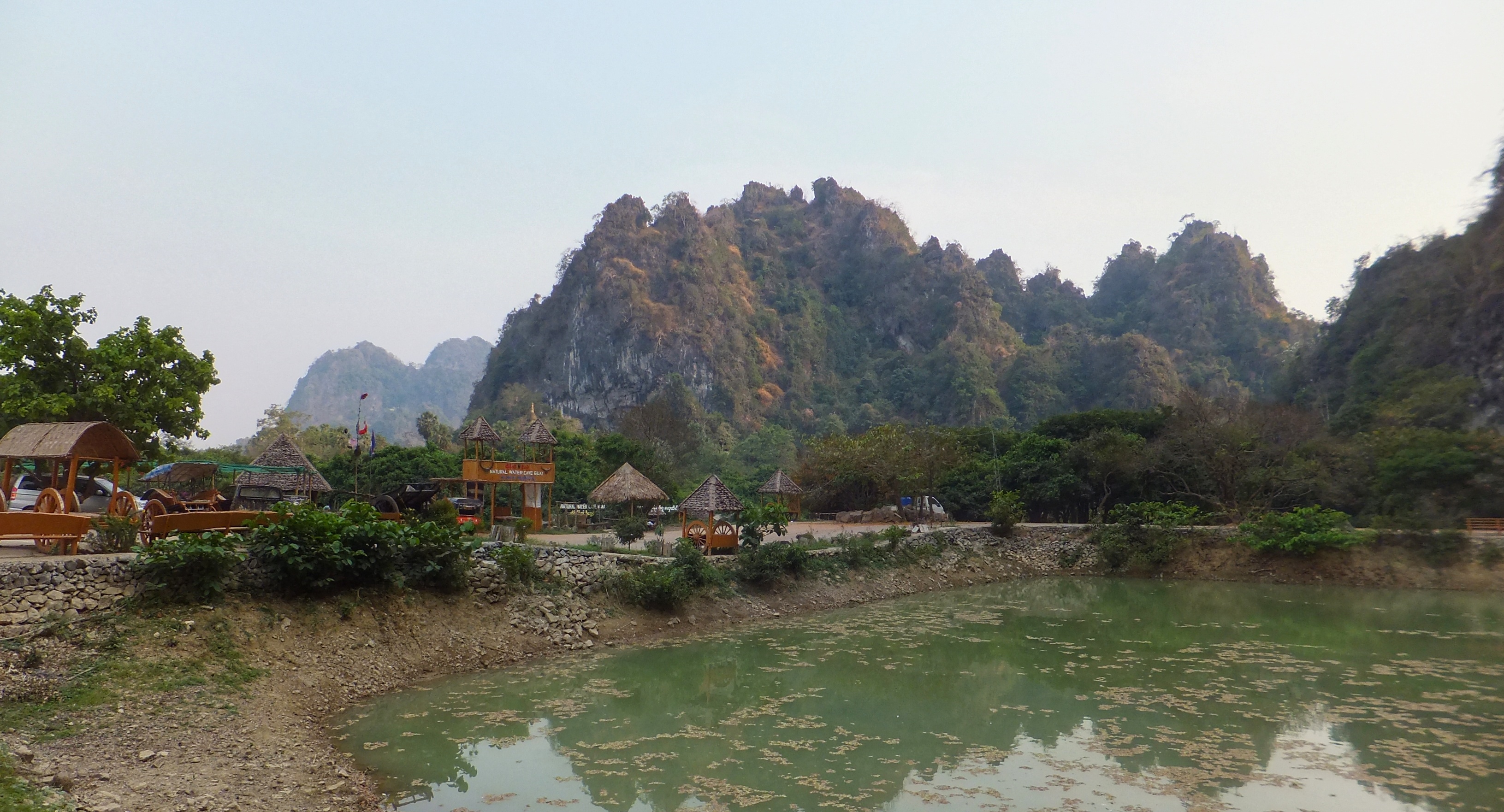 Nachdem wir uns ausgeschlafen hatten gingen wir zur Rezeption, wo uns die freundliche Mitarbeiterin uns einen Roller für die nächsten Tage organisierte. Zwanzig Minuten später war er da und wir fuhren los. Als erstes schauten wir uns die Kawgon-Höhle an. Bemerkenswert waren vor allem die vielen Ornamente am Eingang zur Höhle. Danach ging es weiter zur Yathay Pyan Höhle. Auch hier gab es schöne Ornamente und zahlreiche Buddha-Figuren. Die Höhle ging aber weiter nach hinten und wir konnten – natürlich barfuß – durchlaufen. Auf der anderen Seite gab es eine weitere Öffnung, wo wir einen schönen Ausblick über das Land bekamen. Zum Sonnenuntergang fuhren wir zur Bat Cave und beobachteten ein weiteres mal Millionen von Fledermäuse beim Ausflug aus ihrer Höhle. Diesmal standen wir unmittelbar unterhalb des Höhleneingangs und sahen die Tiere über unseren Köpfen ausfliegen. Allerdings bekamen wir auch den Gestank der Tiere zu spüren. Es war immer noch sehr warm, als wir im Dunklen wieder nach Hause fuhren. In einem kleinen Restaurant unterwegs aßen wir zu Abend. Zum Glück konnte einer der jungen Helfer ein wenig Englisch und so bekamen wir ein leckeres Abendessen.